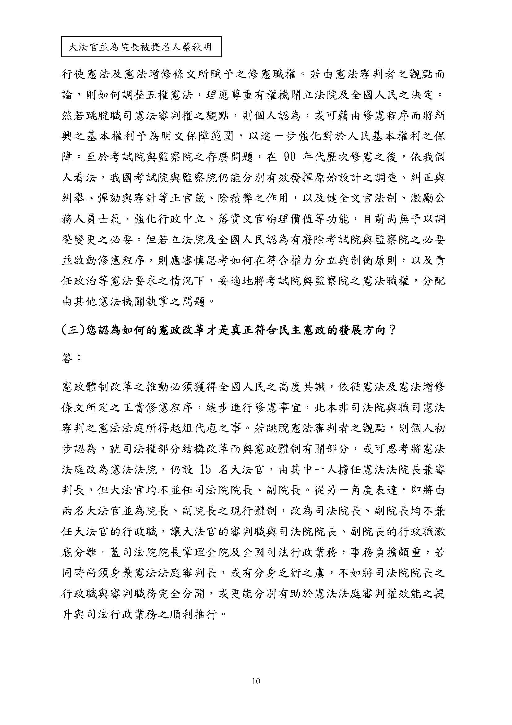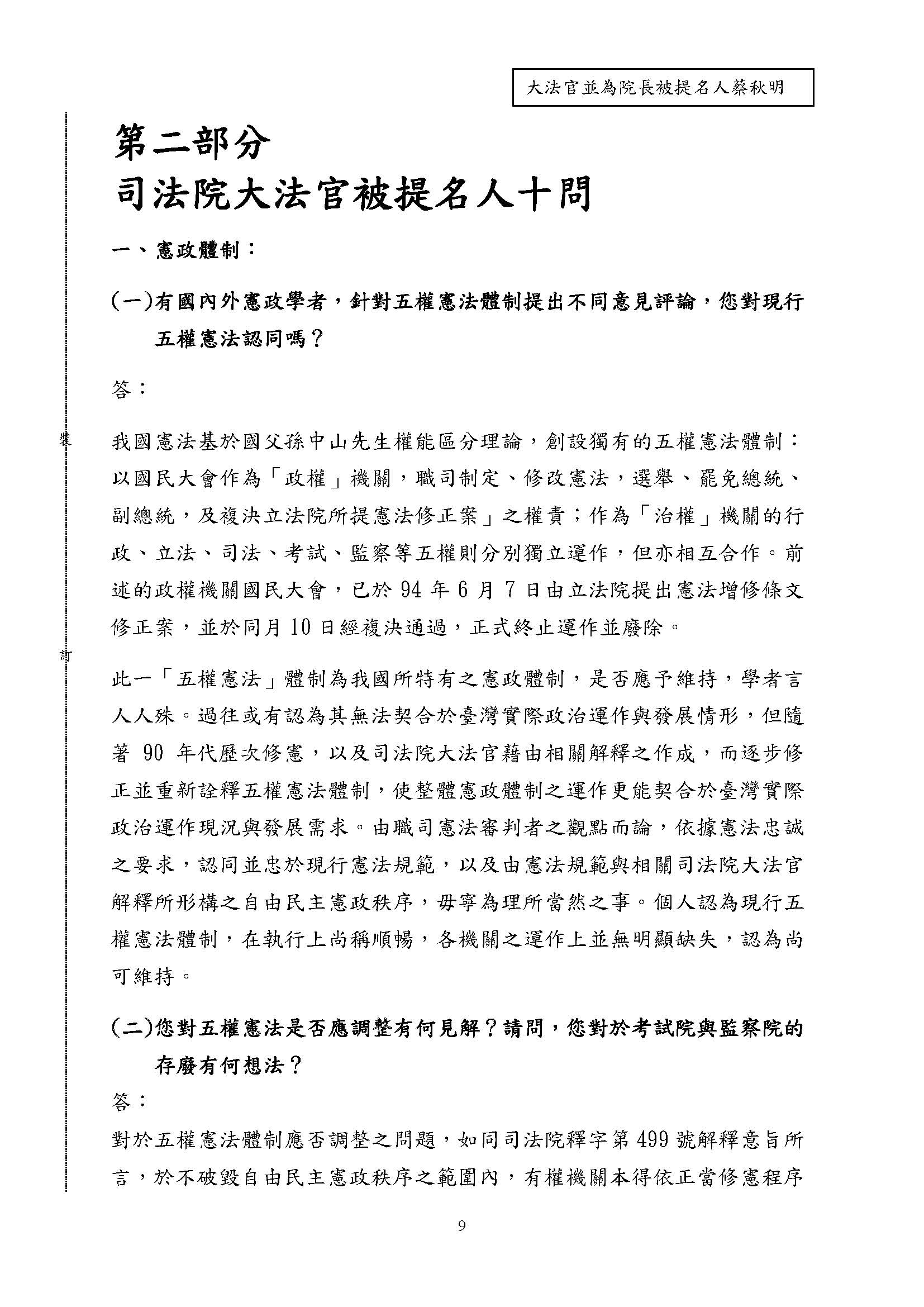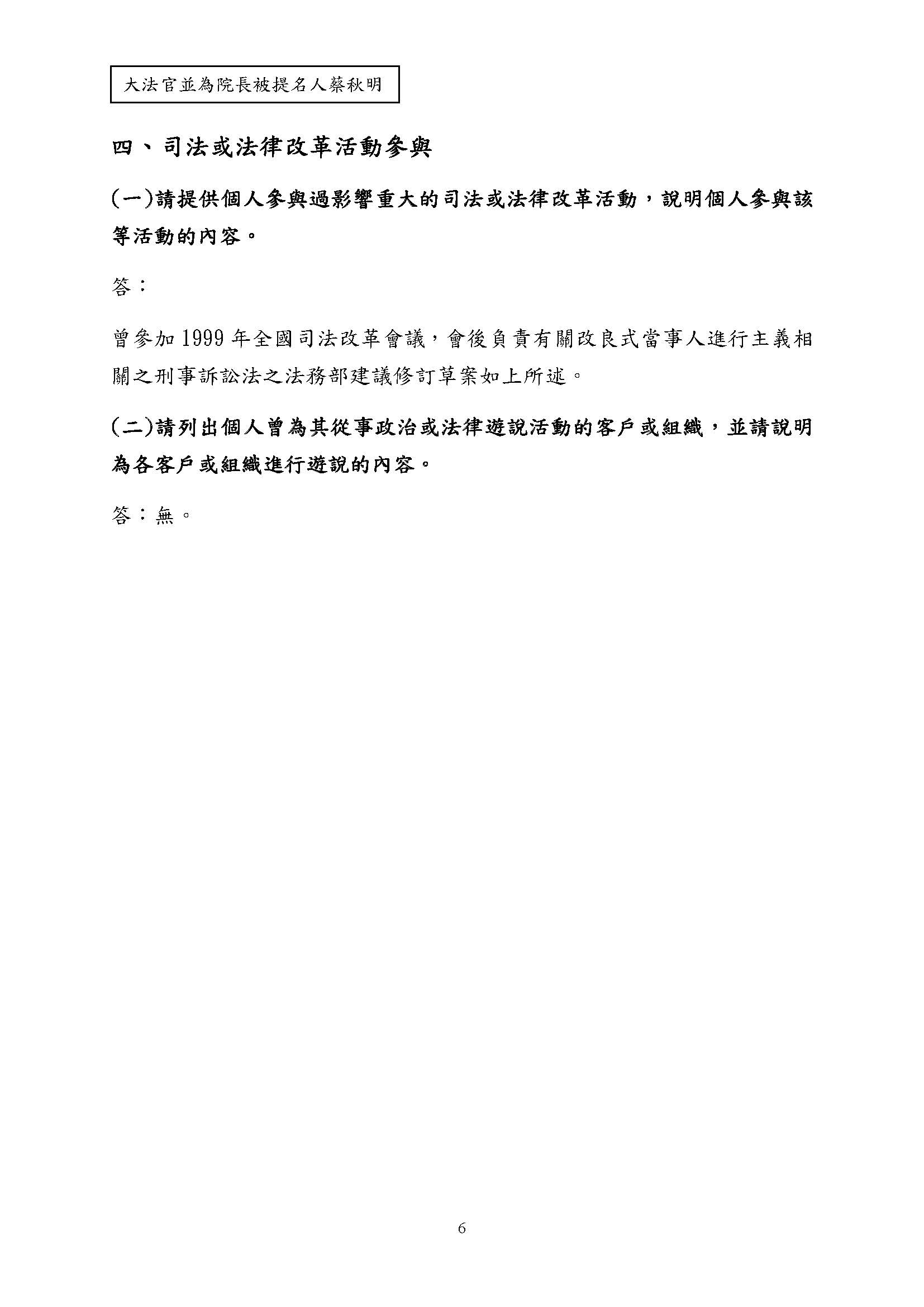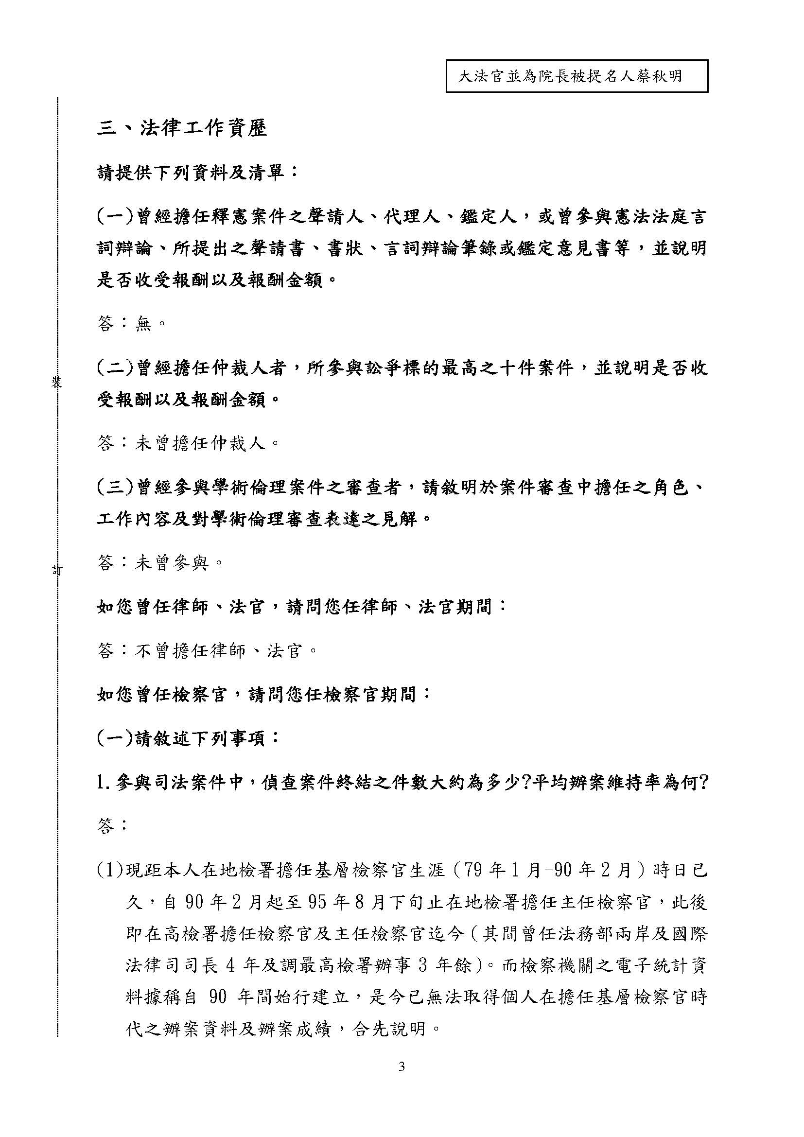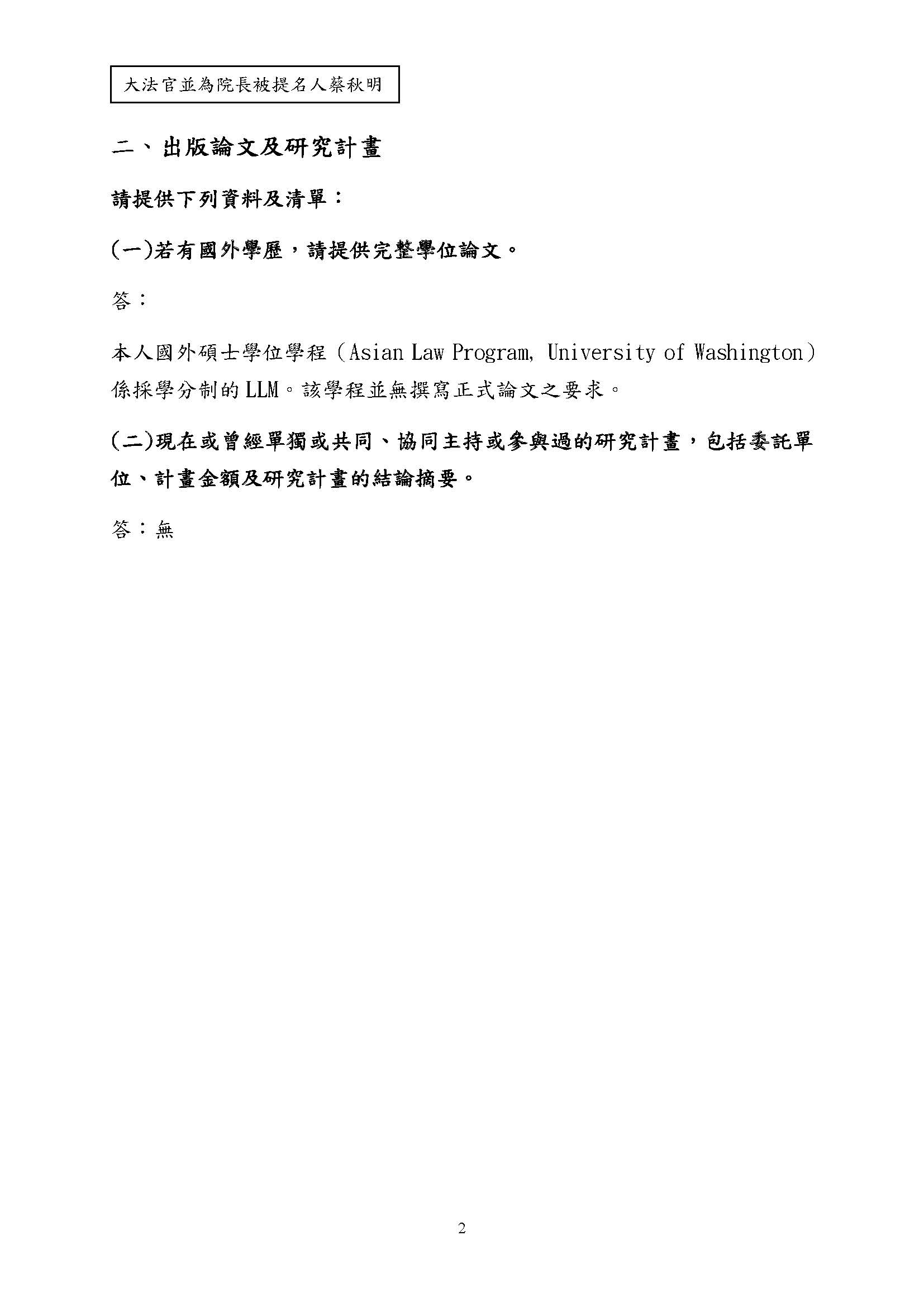 一、司法院大法官並為院長被提名人蔡秋明書面資料: