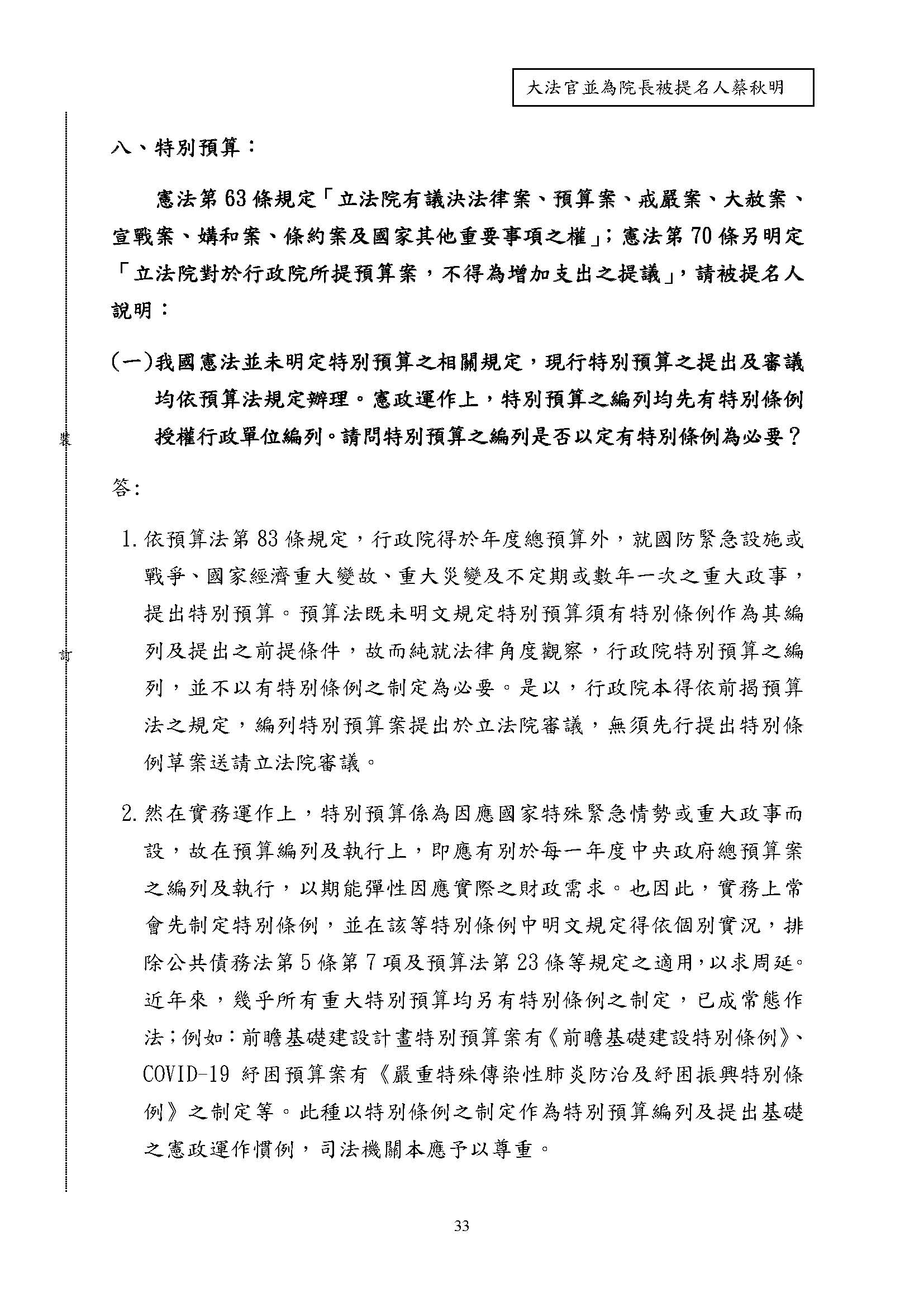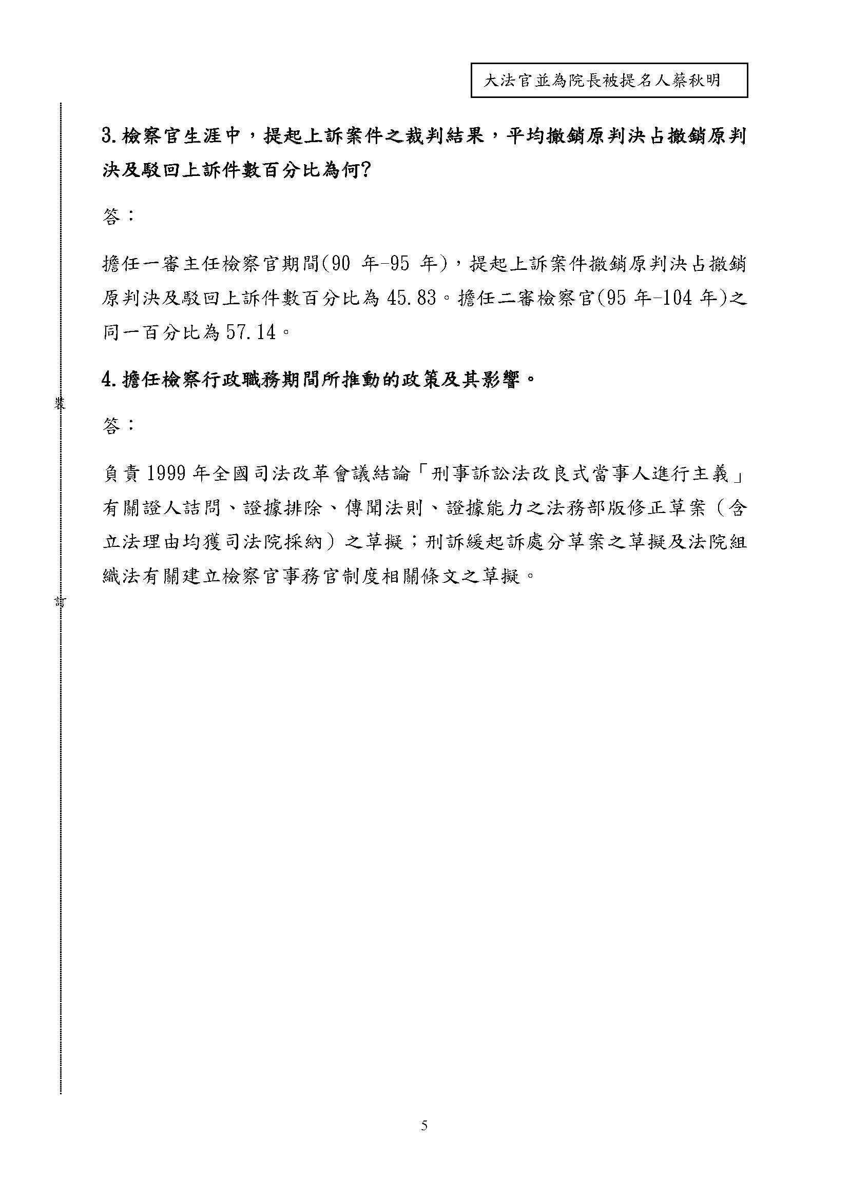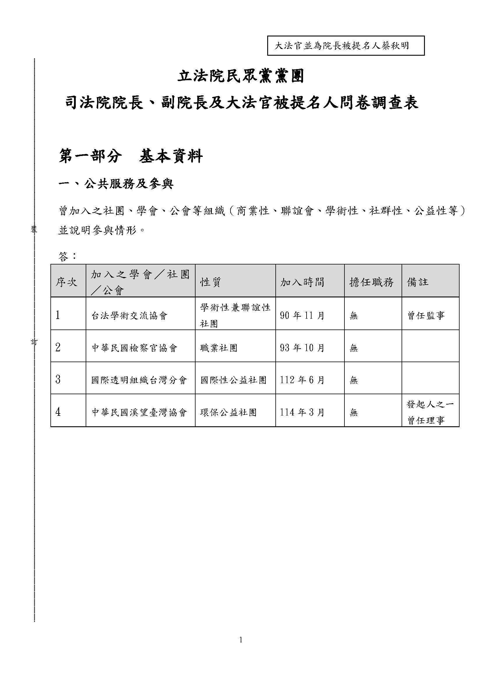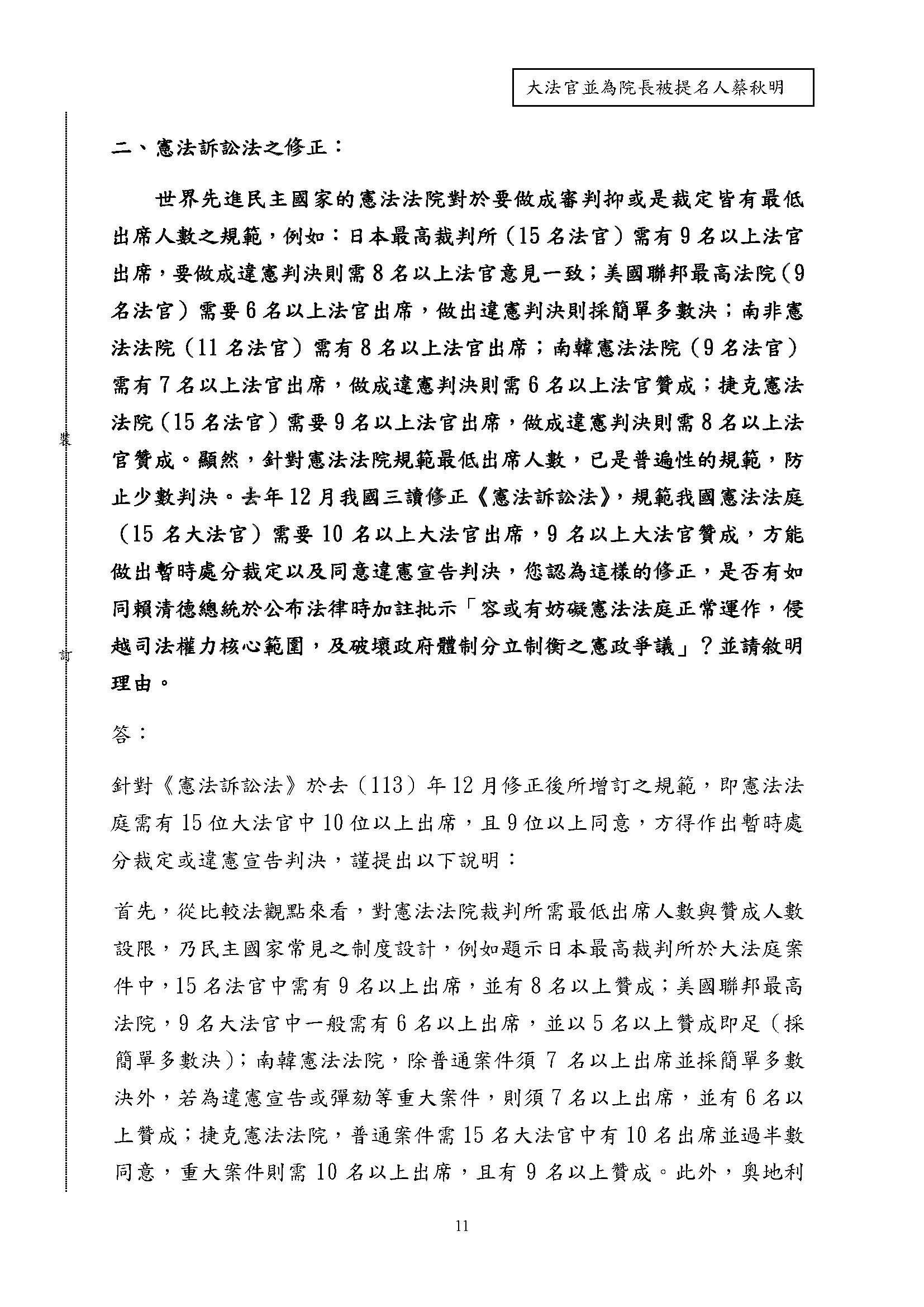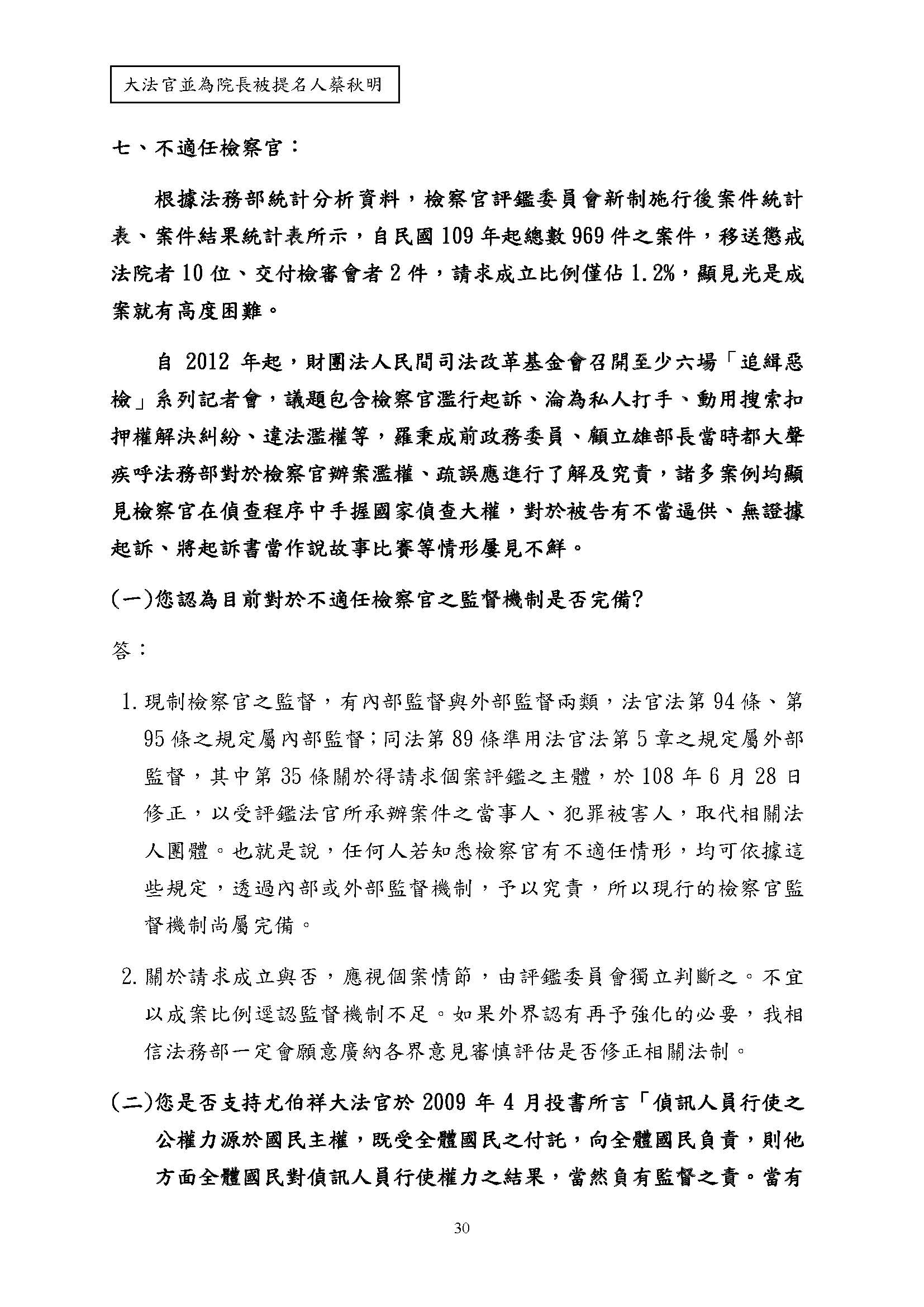 一、司法院大法官並為院長被提名人蔡秋明書面資料: