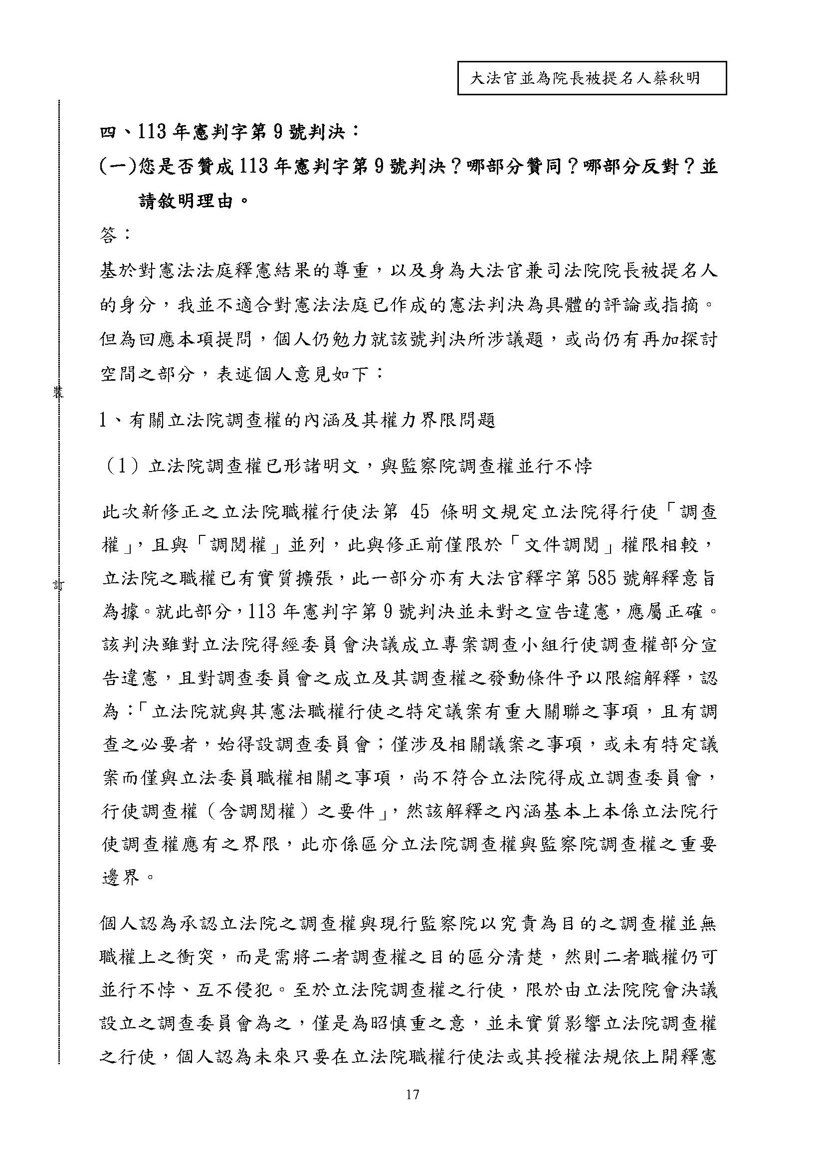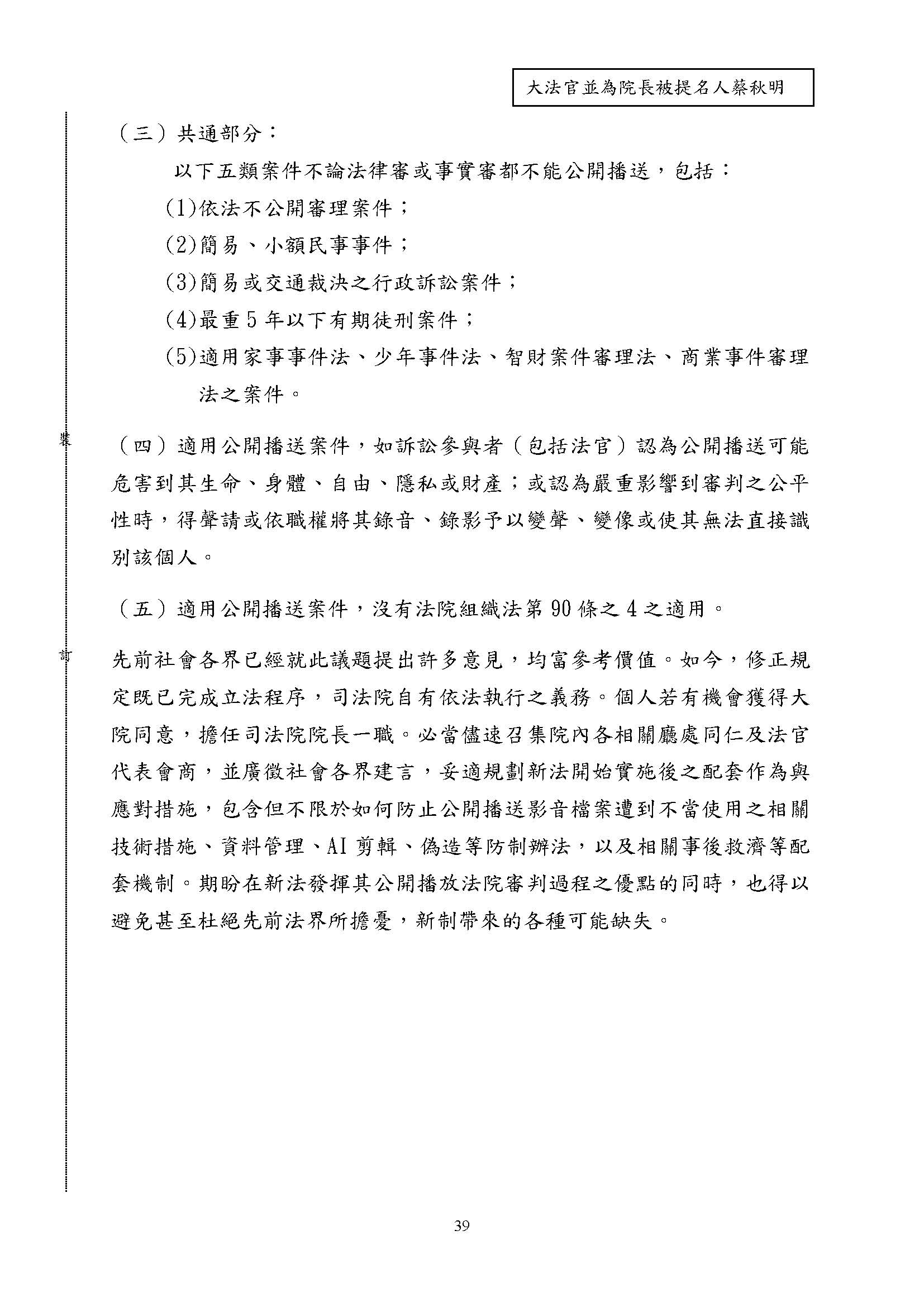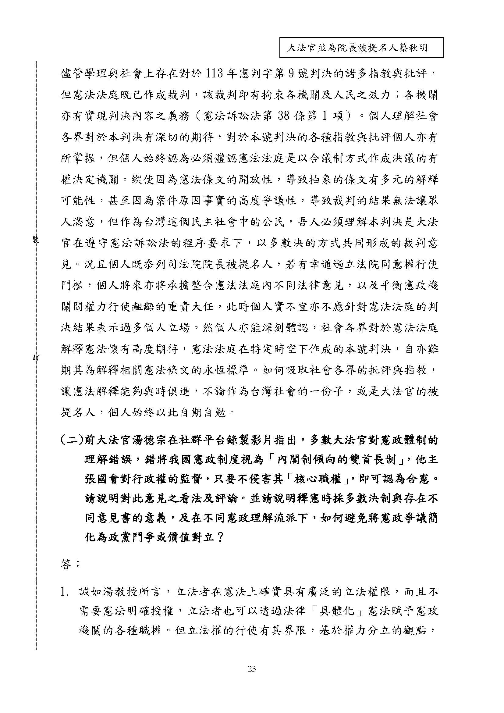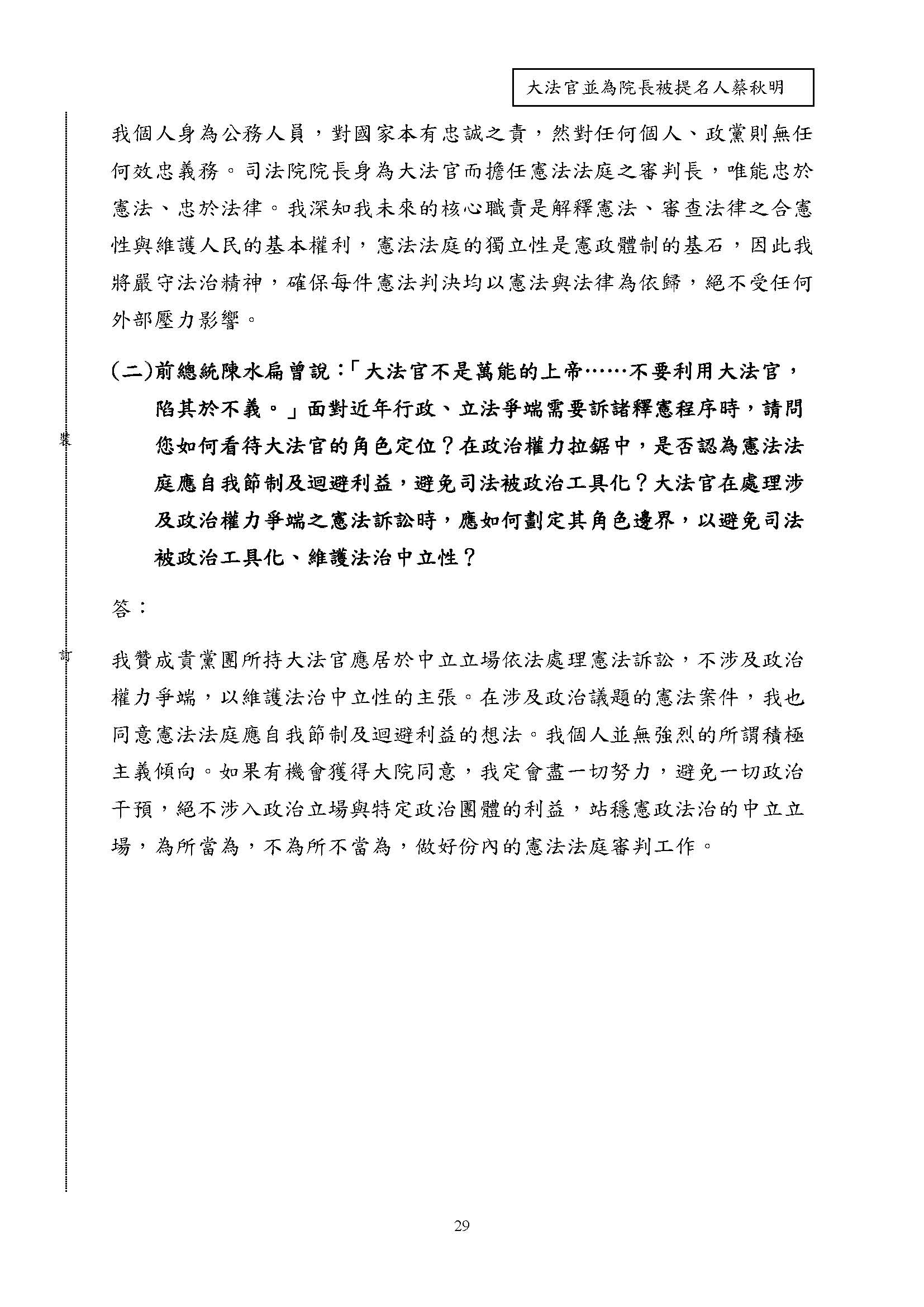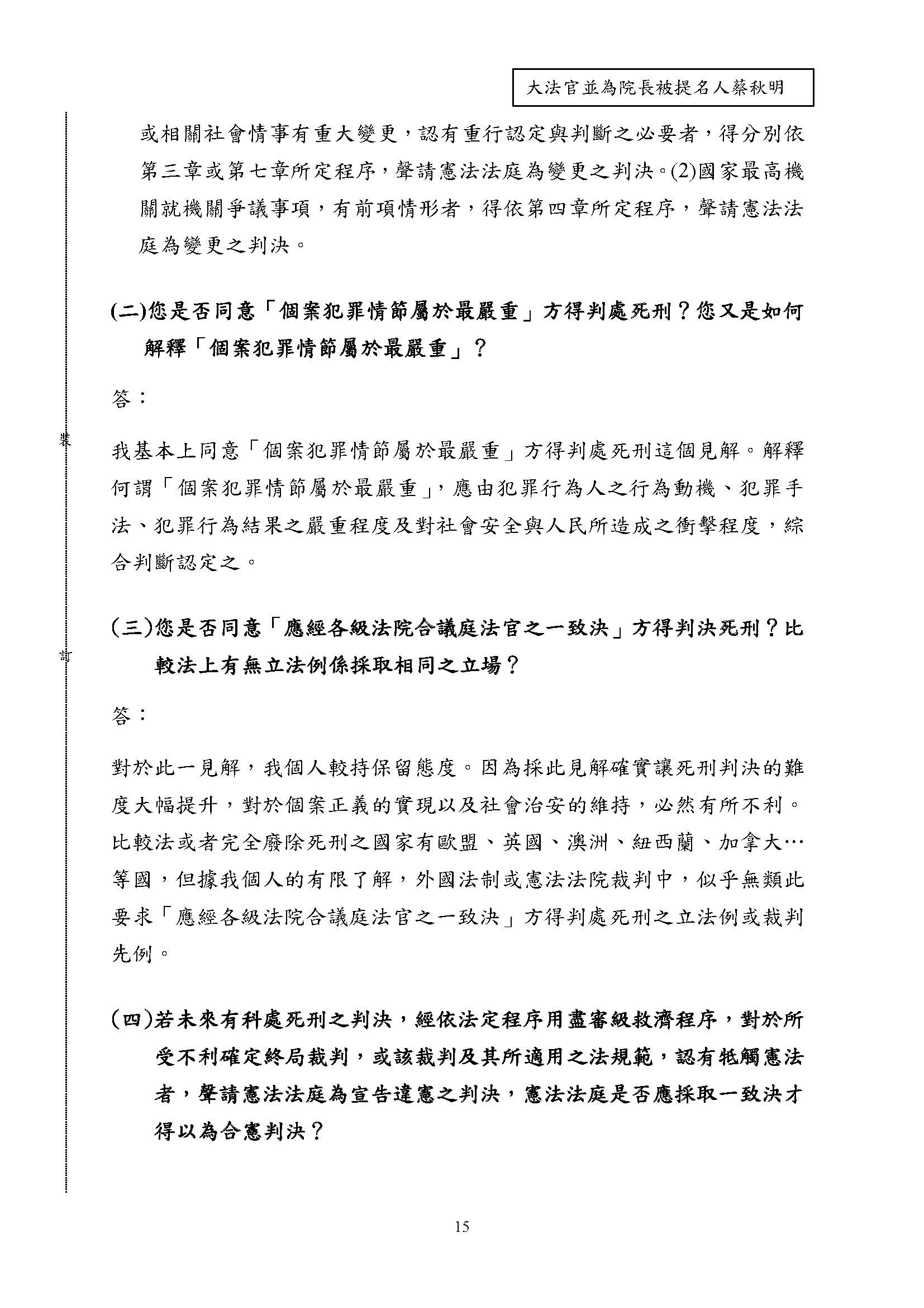 一、司法院大法官並為院長被提名人蔡秋明書面資料: