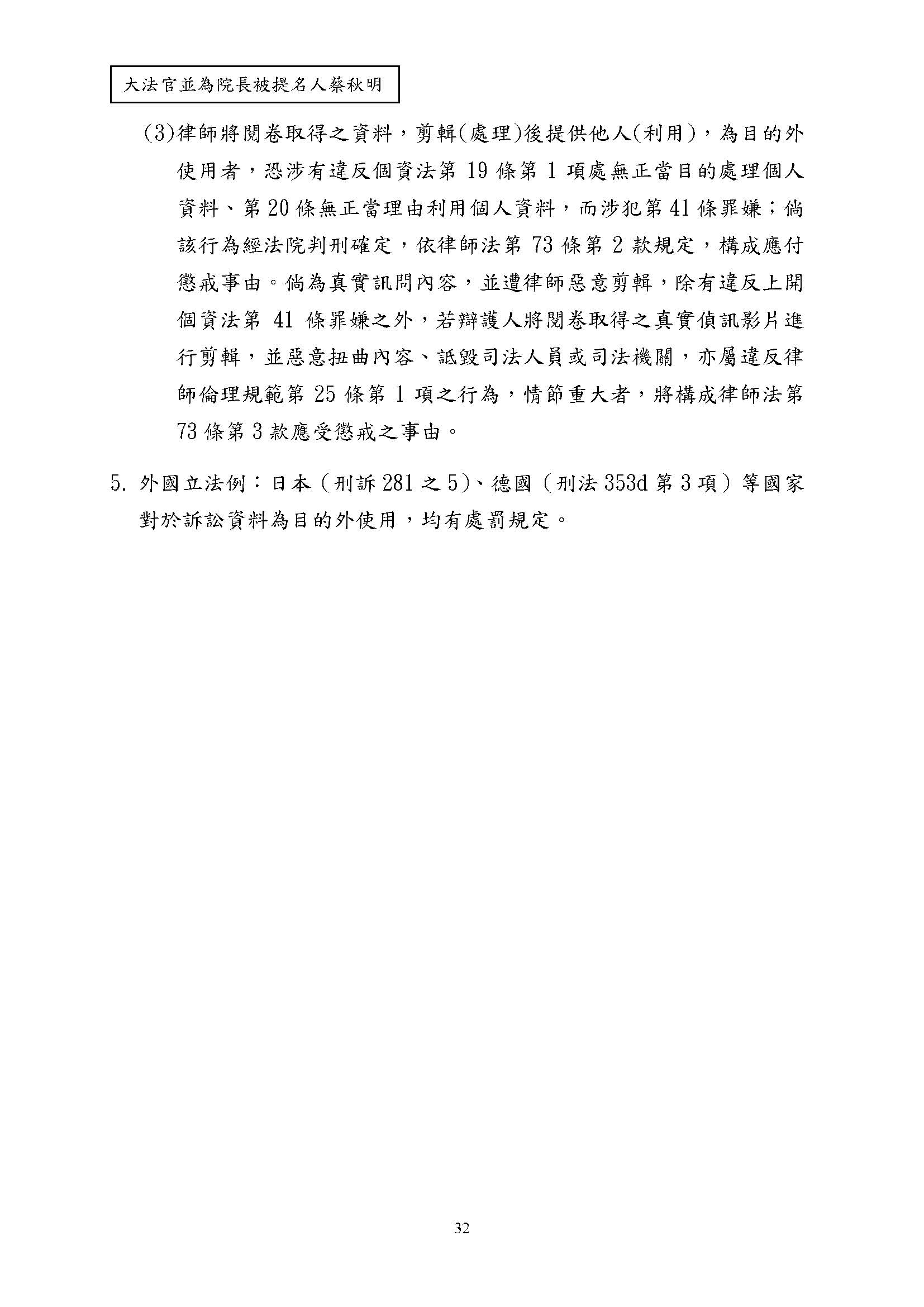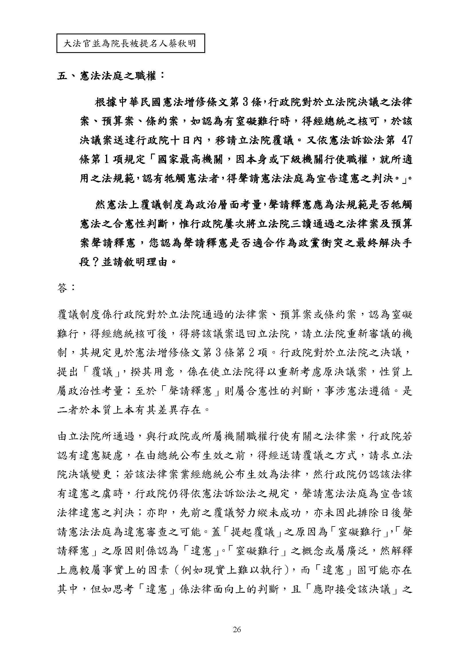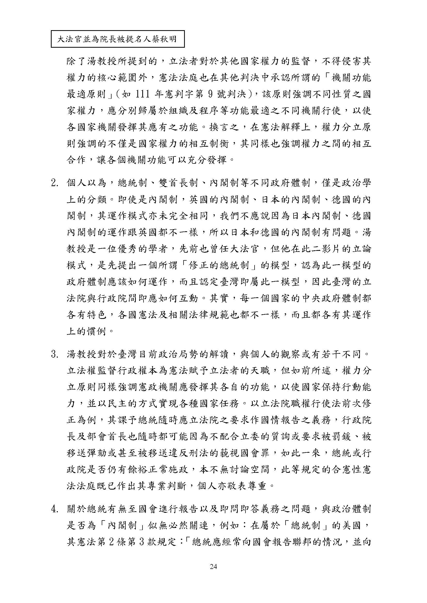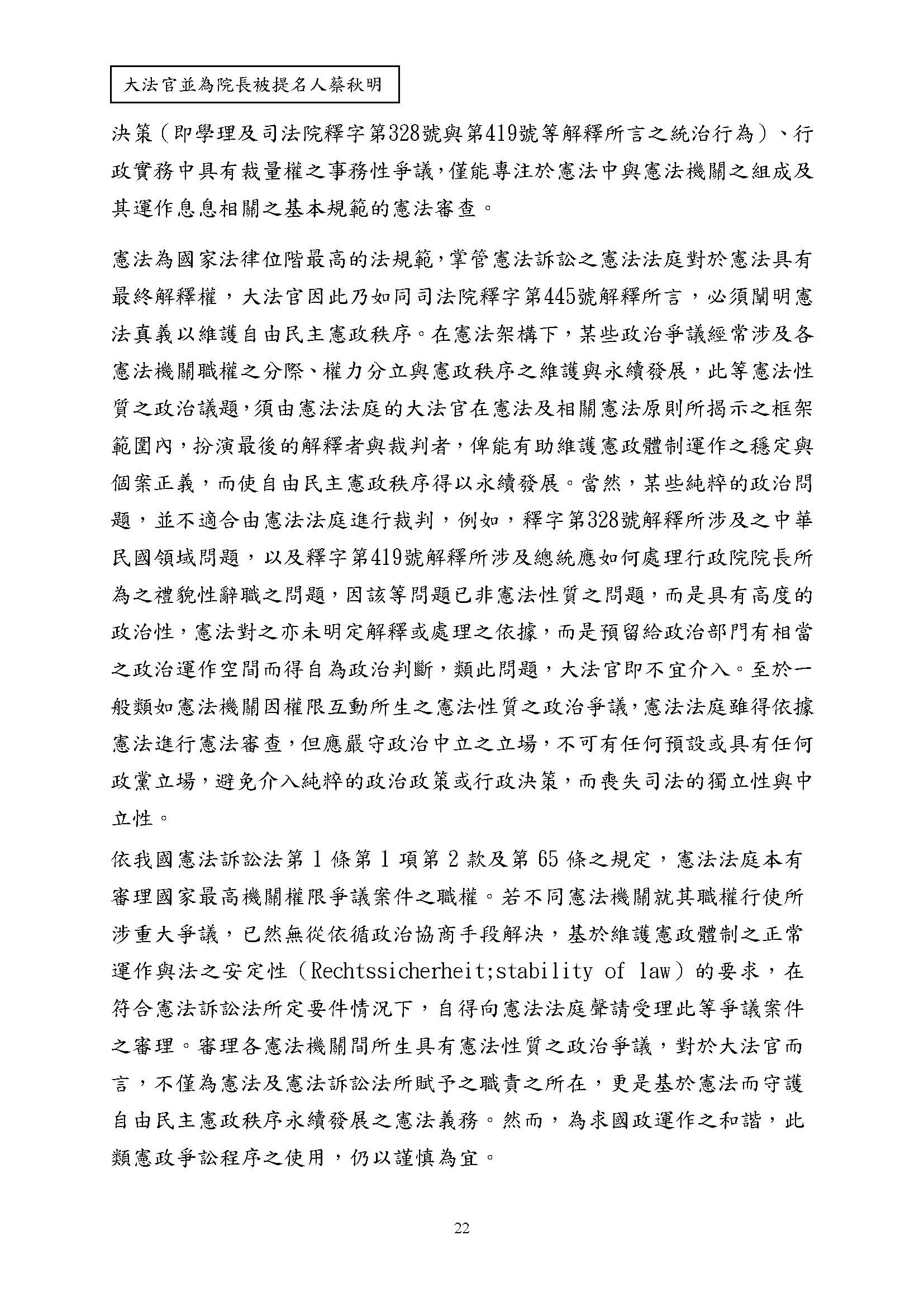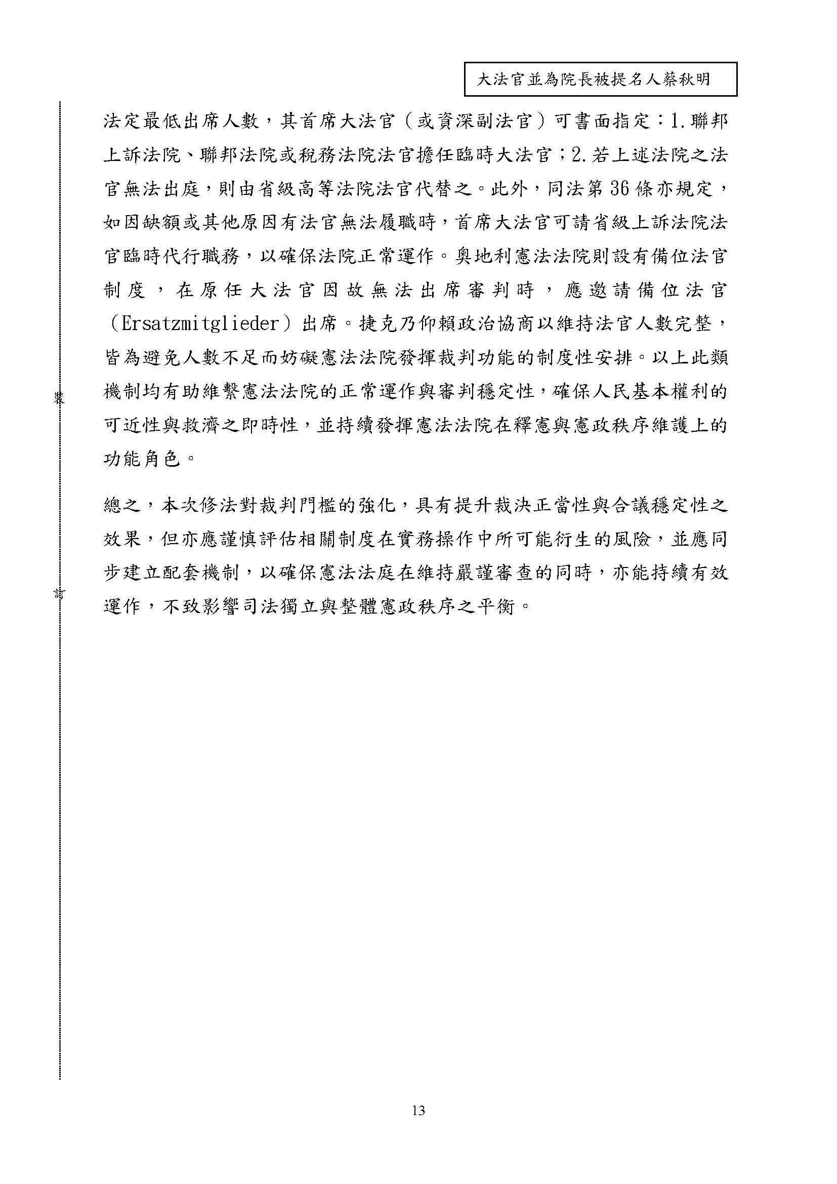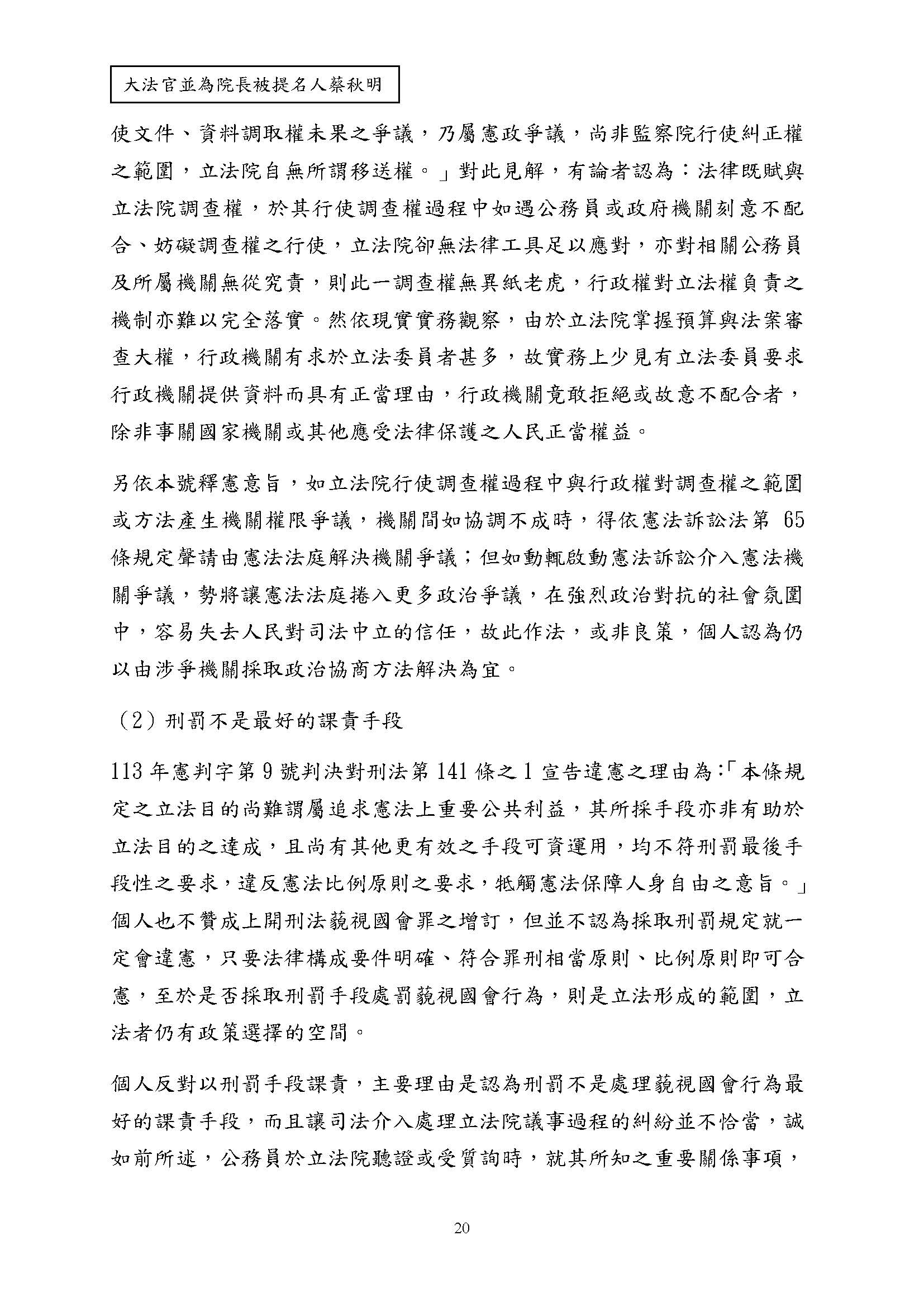 一、司法院大法官並為院長被提名人蔡秋明書面資料: