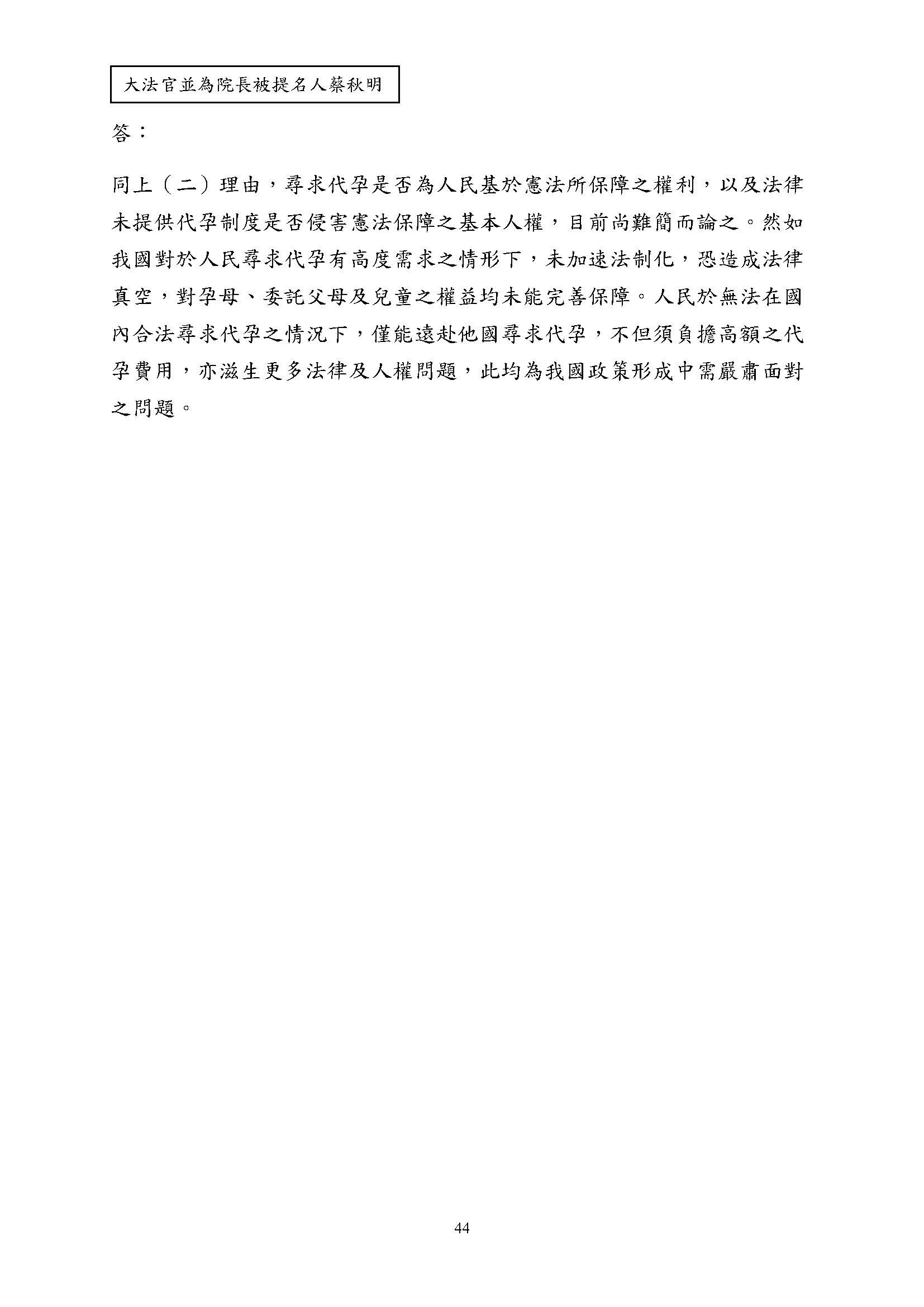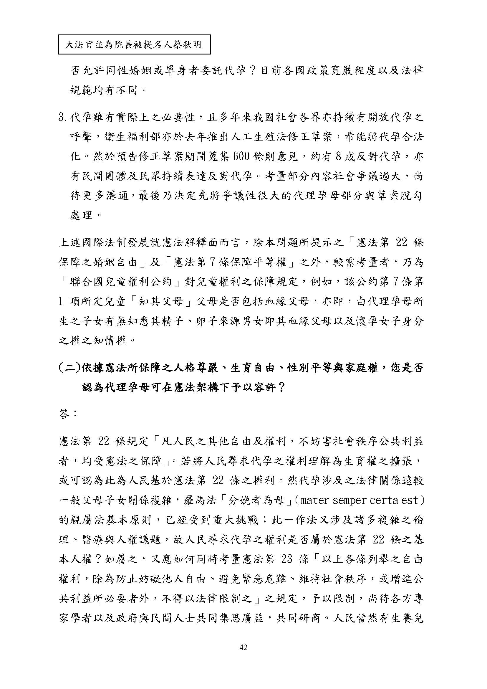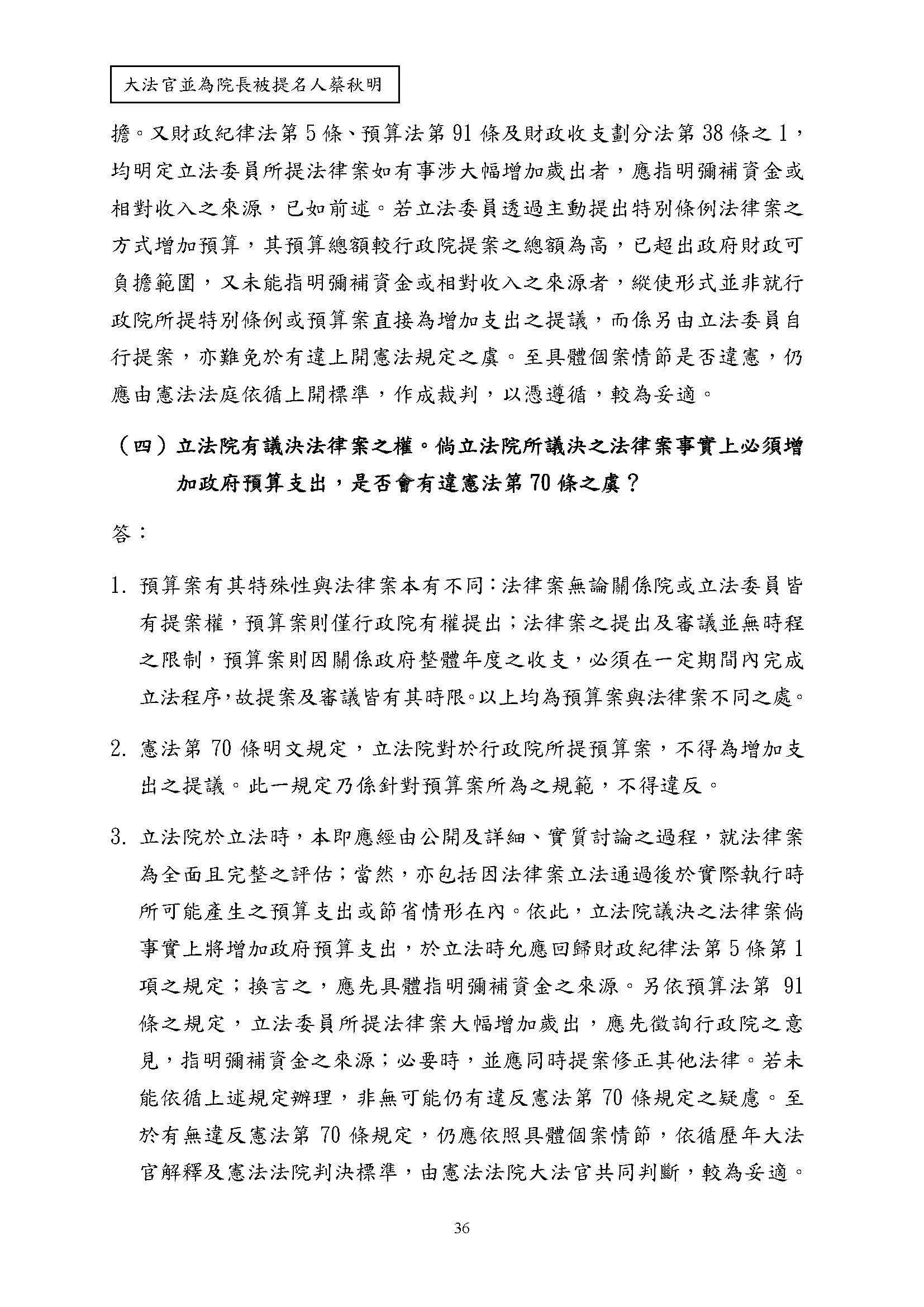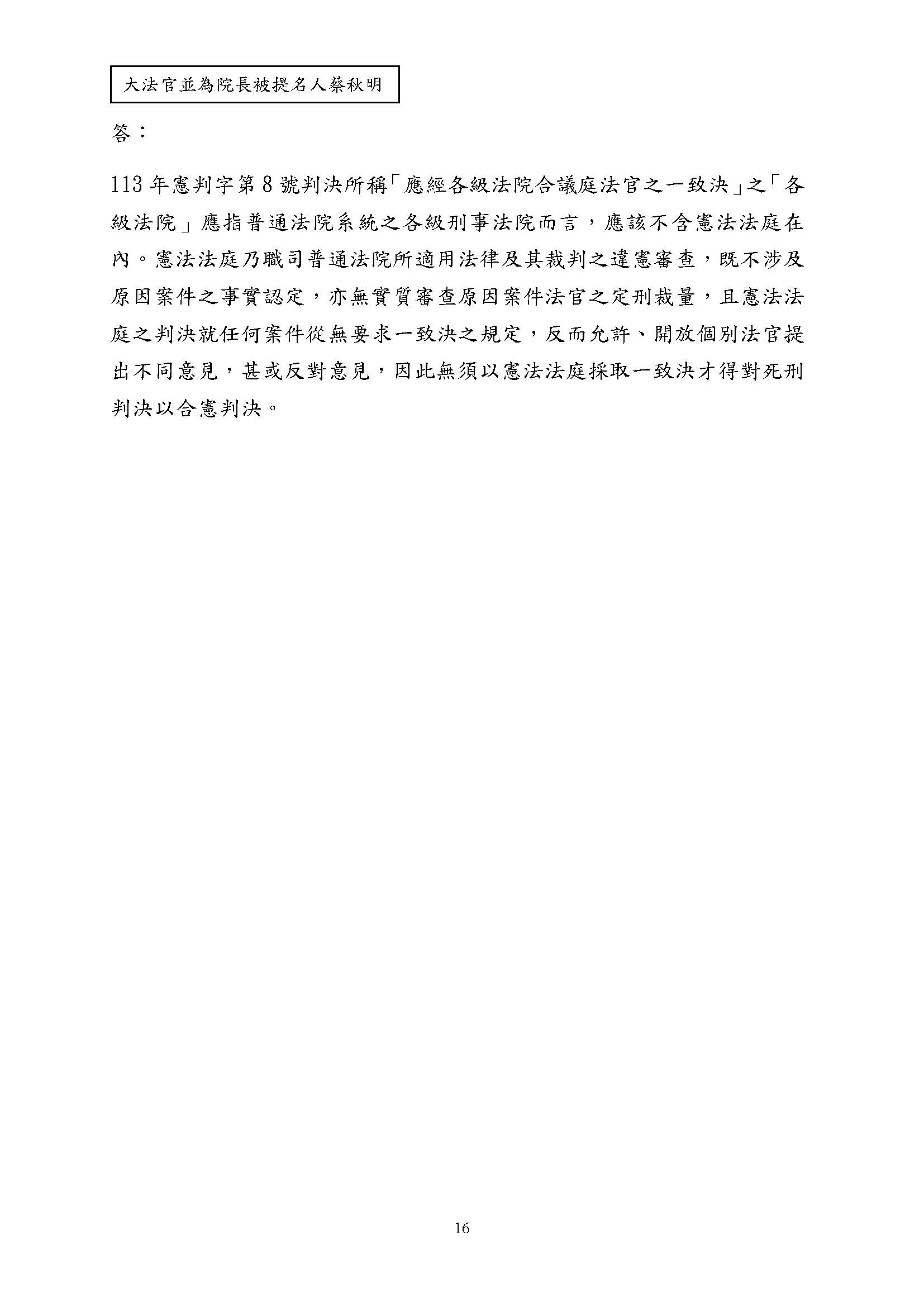 肆、司法院大法官並為院長、副院長及5位大法官被提名人有關本院台灣民眾黨黨團書面提問之答復