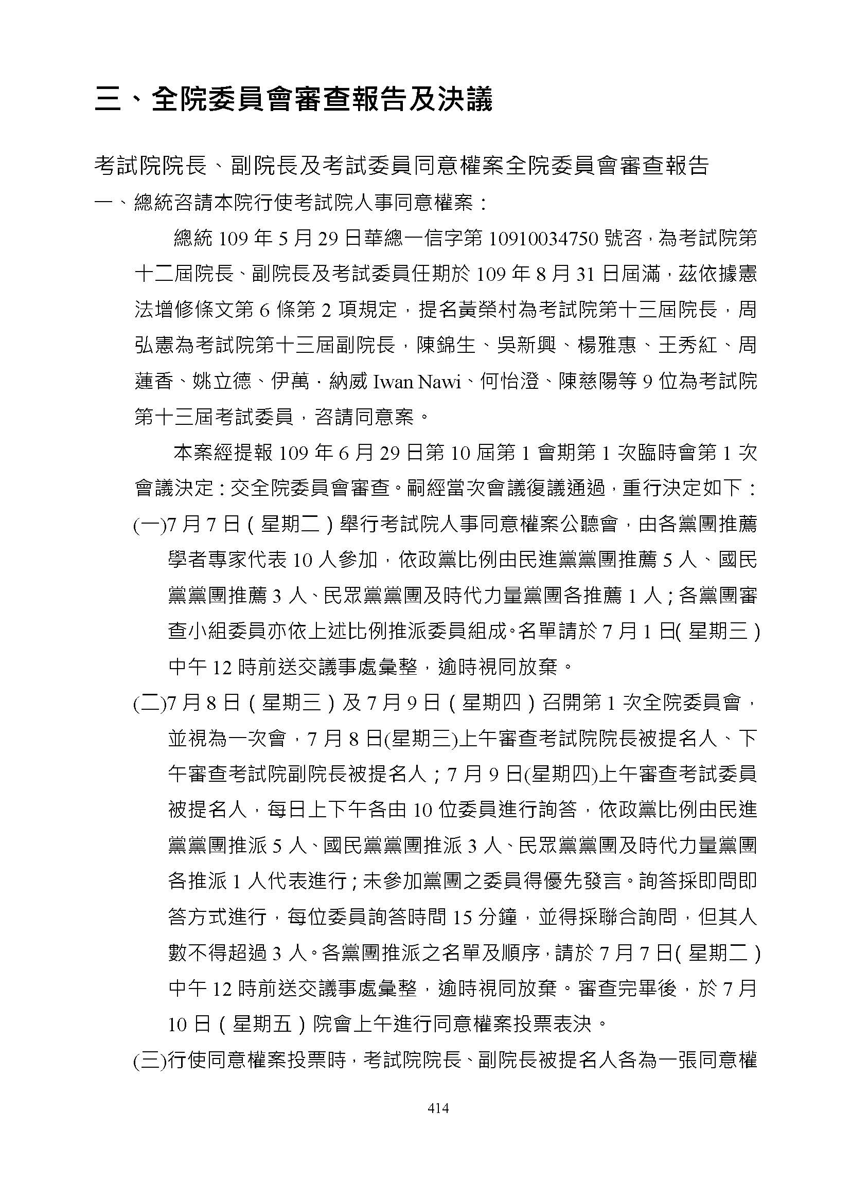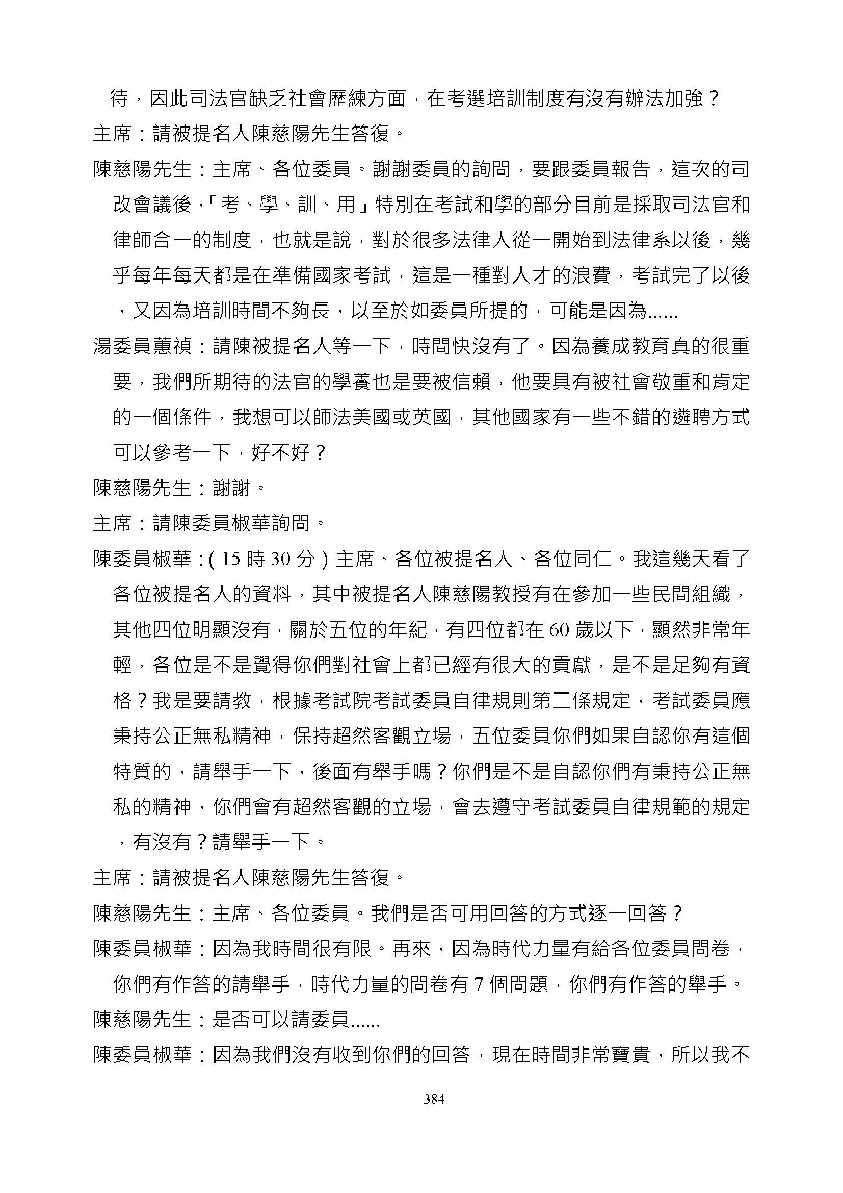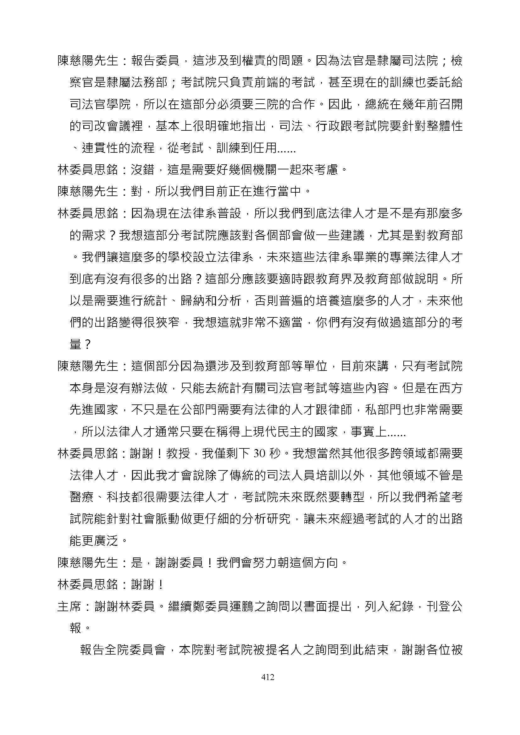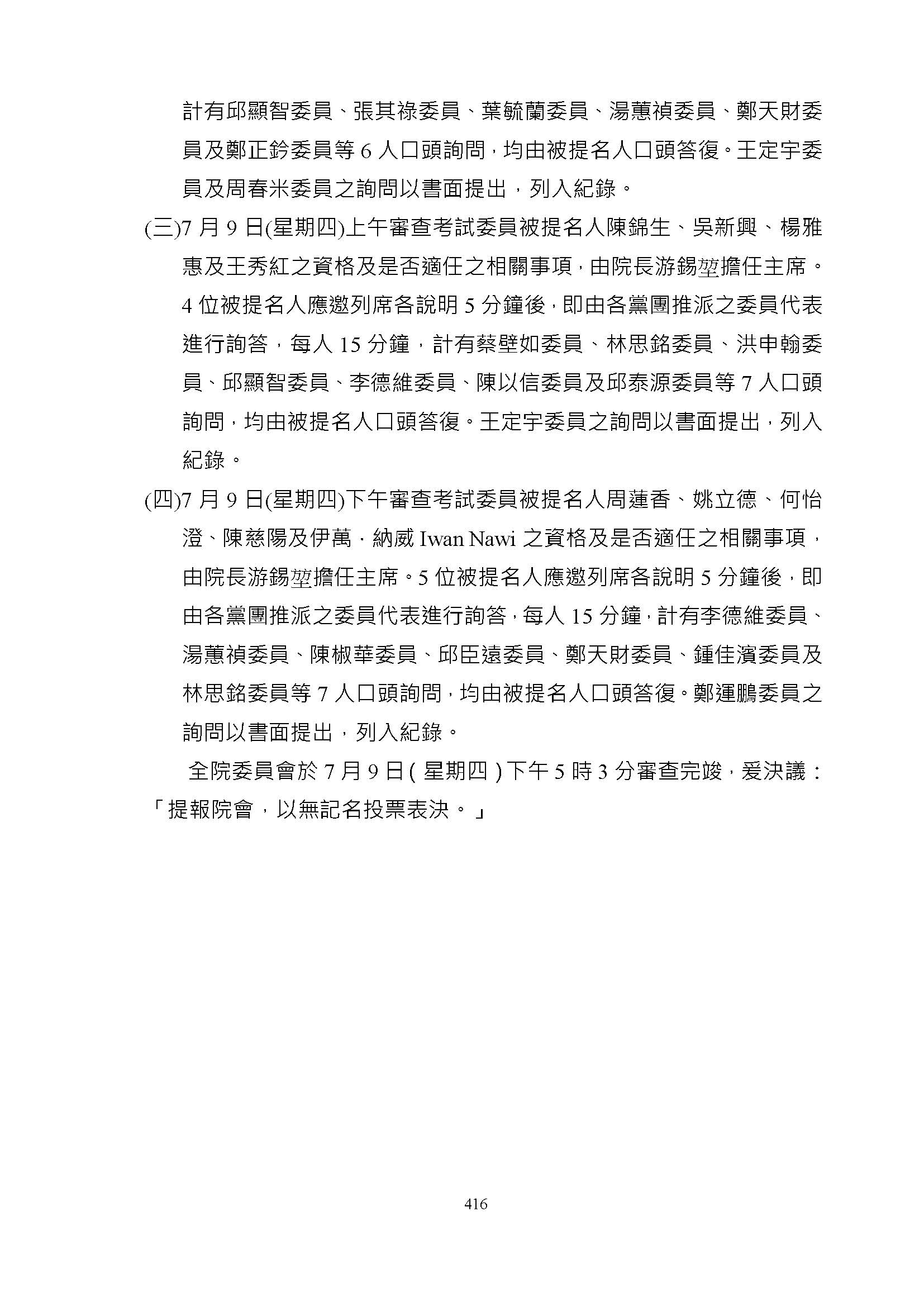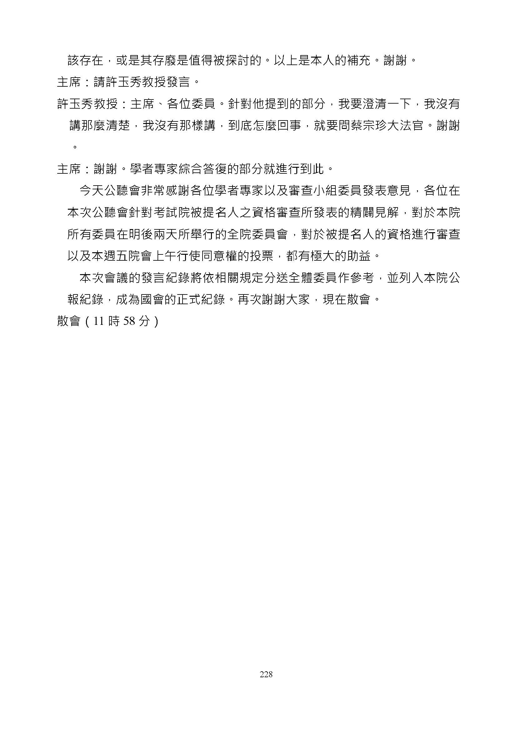 主席:報告全院委員會,針對司法院院長、副院長及五位大法官被提名人之資格及是否適任相關事項,均已審查完畢。本案作以下決議:提報院會,以記名投票表決。現在散會。