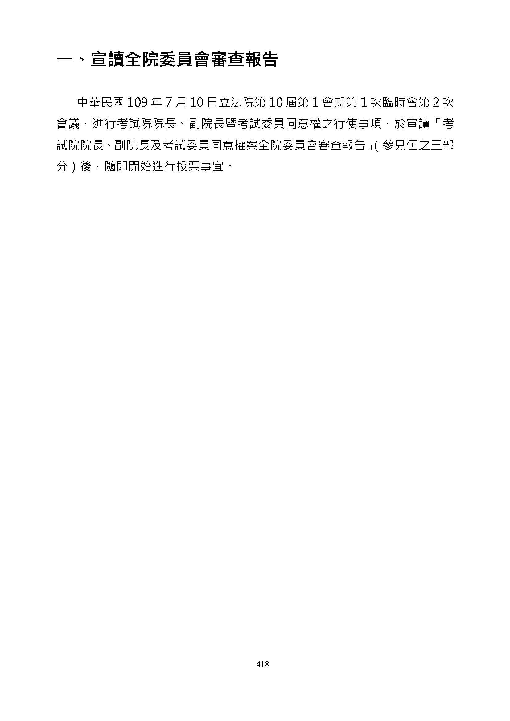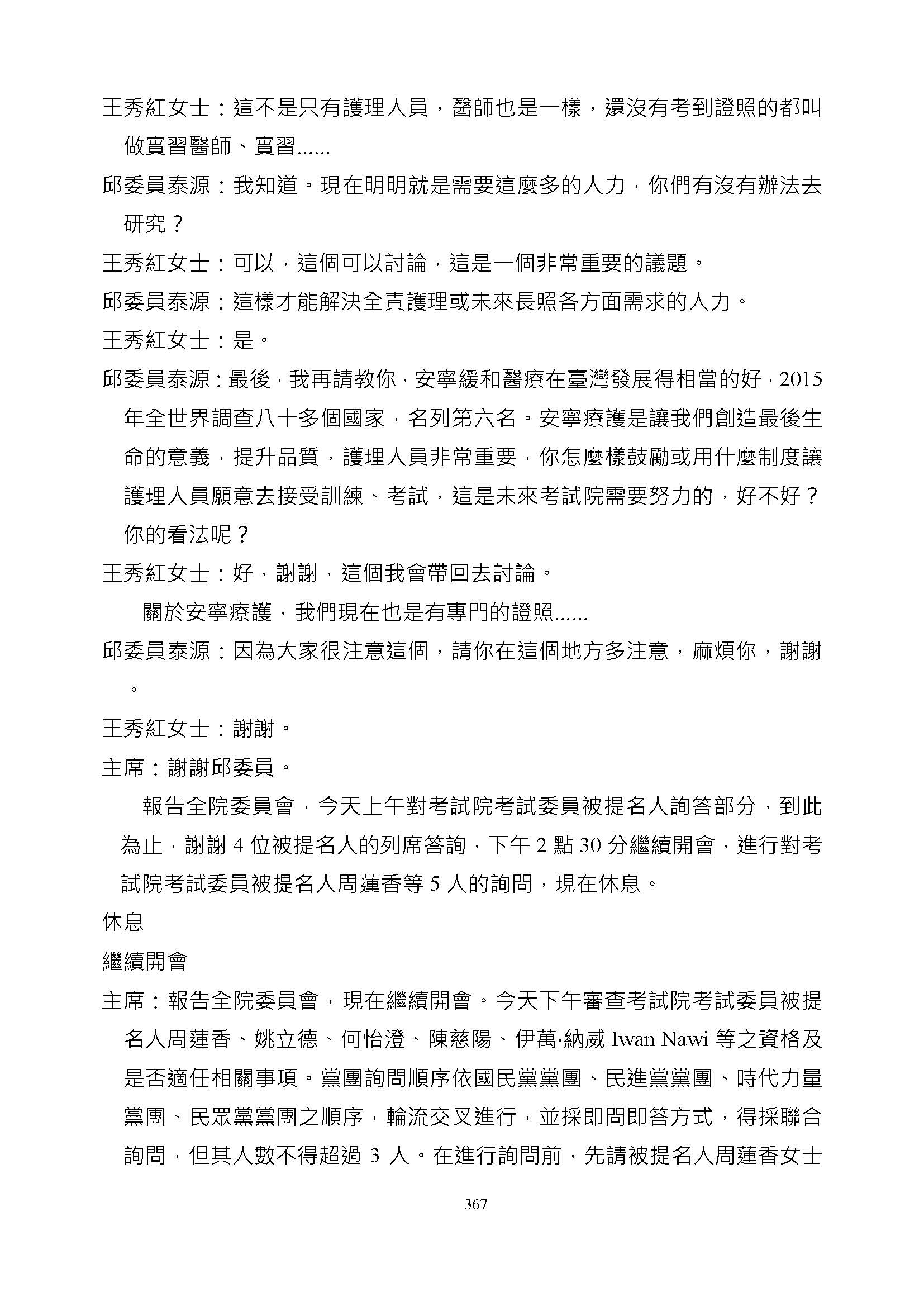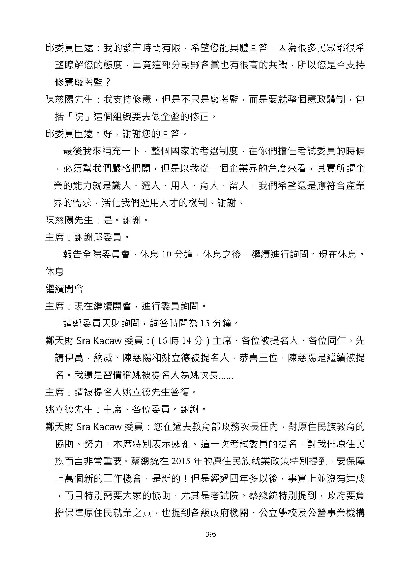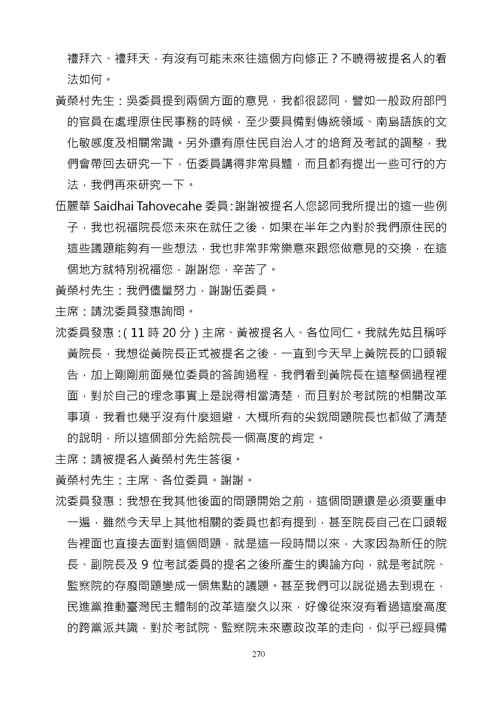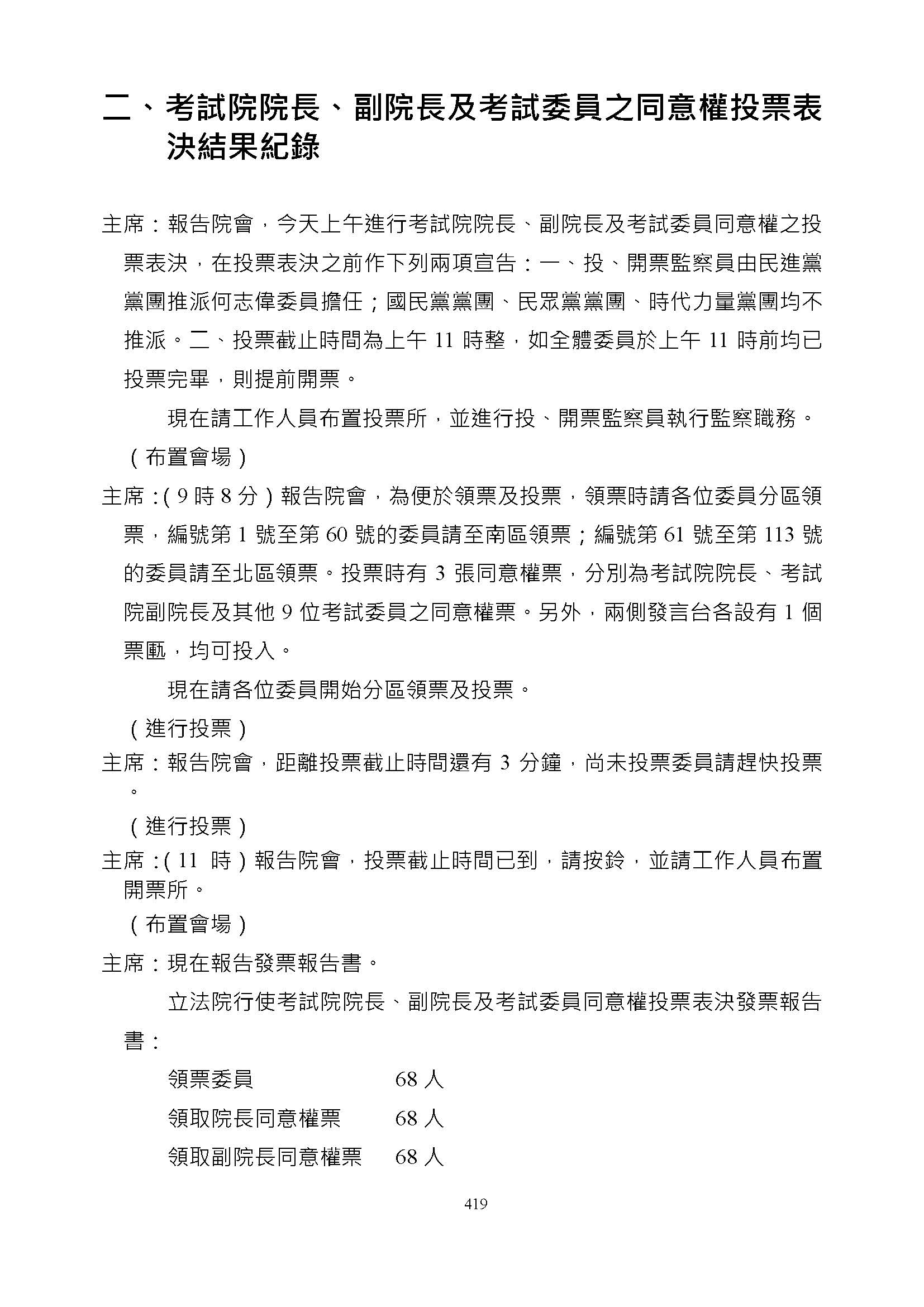 主席:報告全院委員會,針對司法院院長、副院長及五位大法官被提名人之資格及是否適任相關事項,均已審查完畢。本案作以下決議:提報院會,以記名投票表決。現在散會。