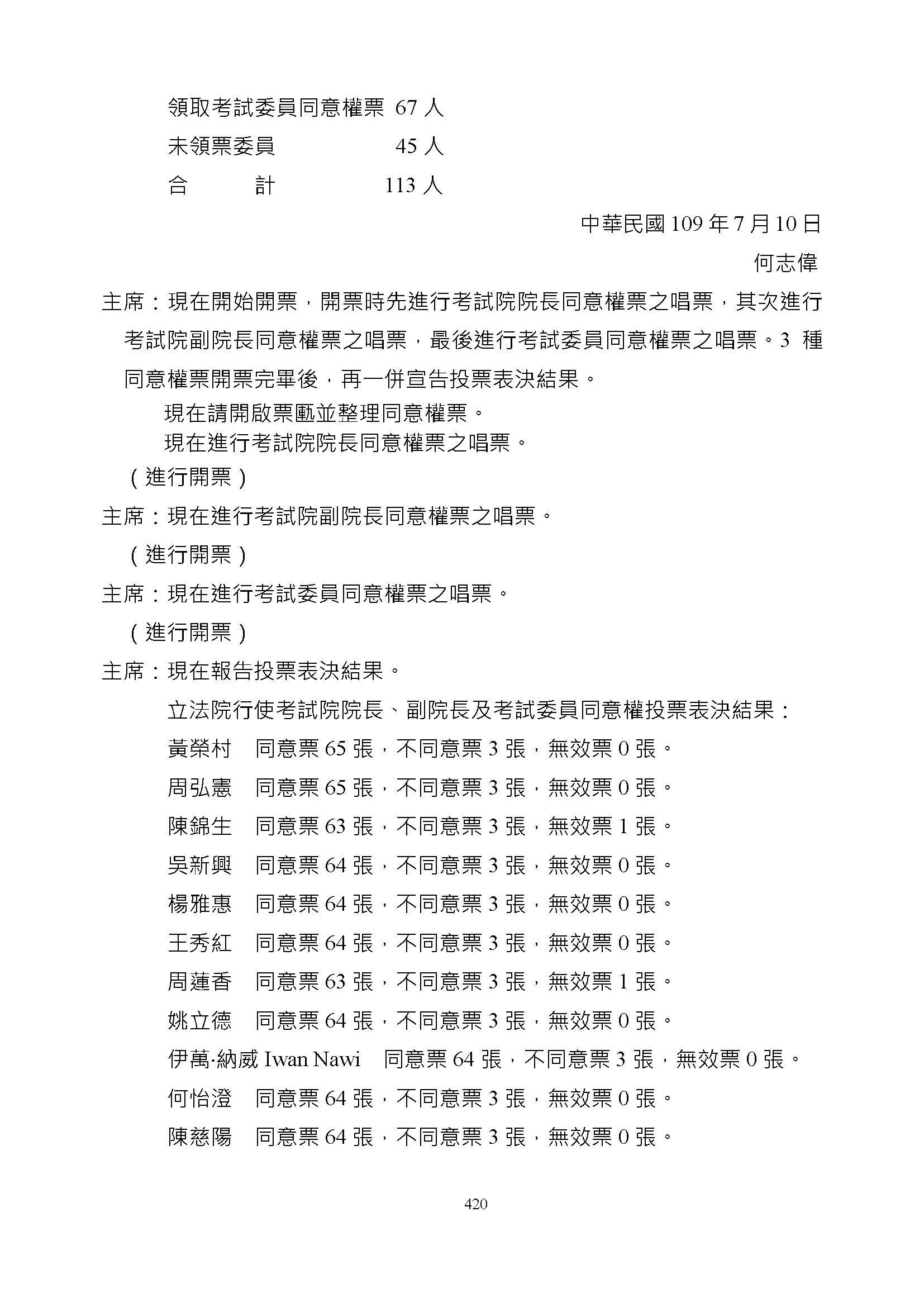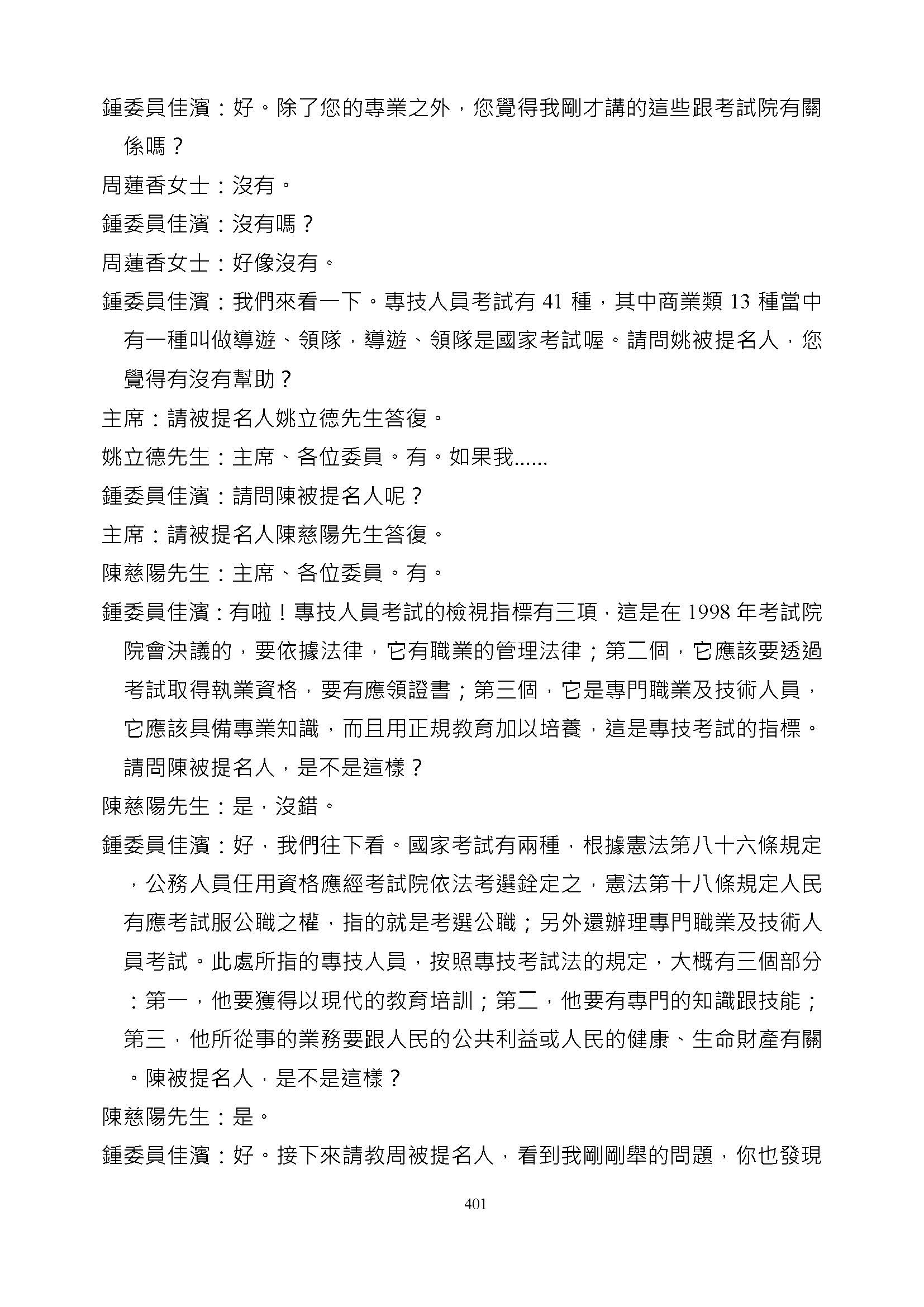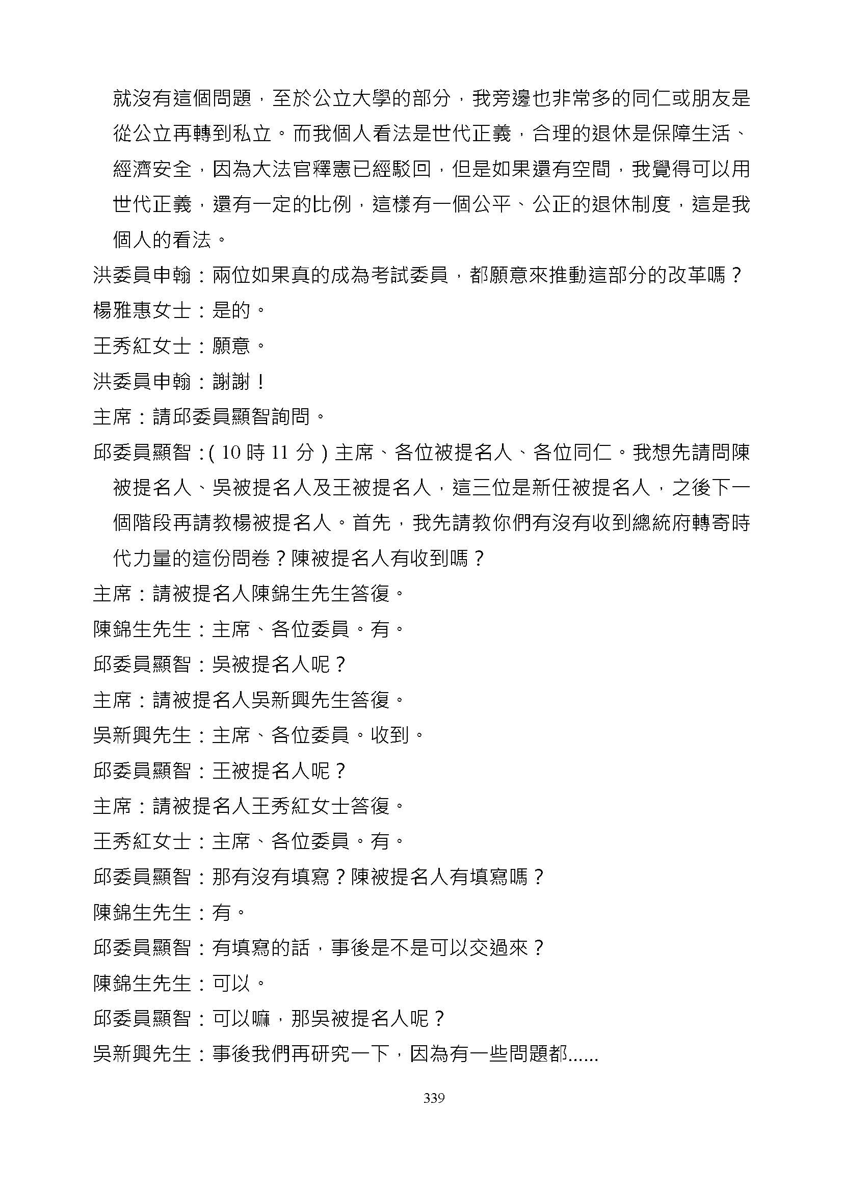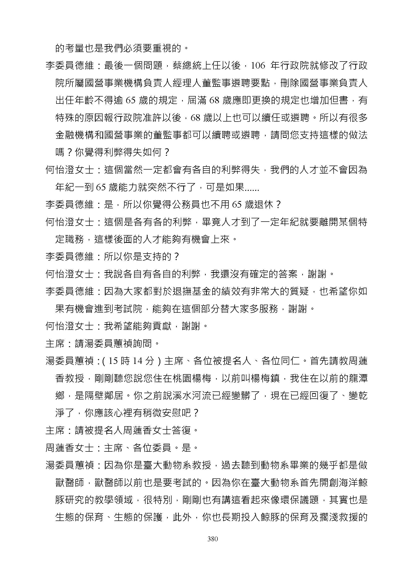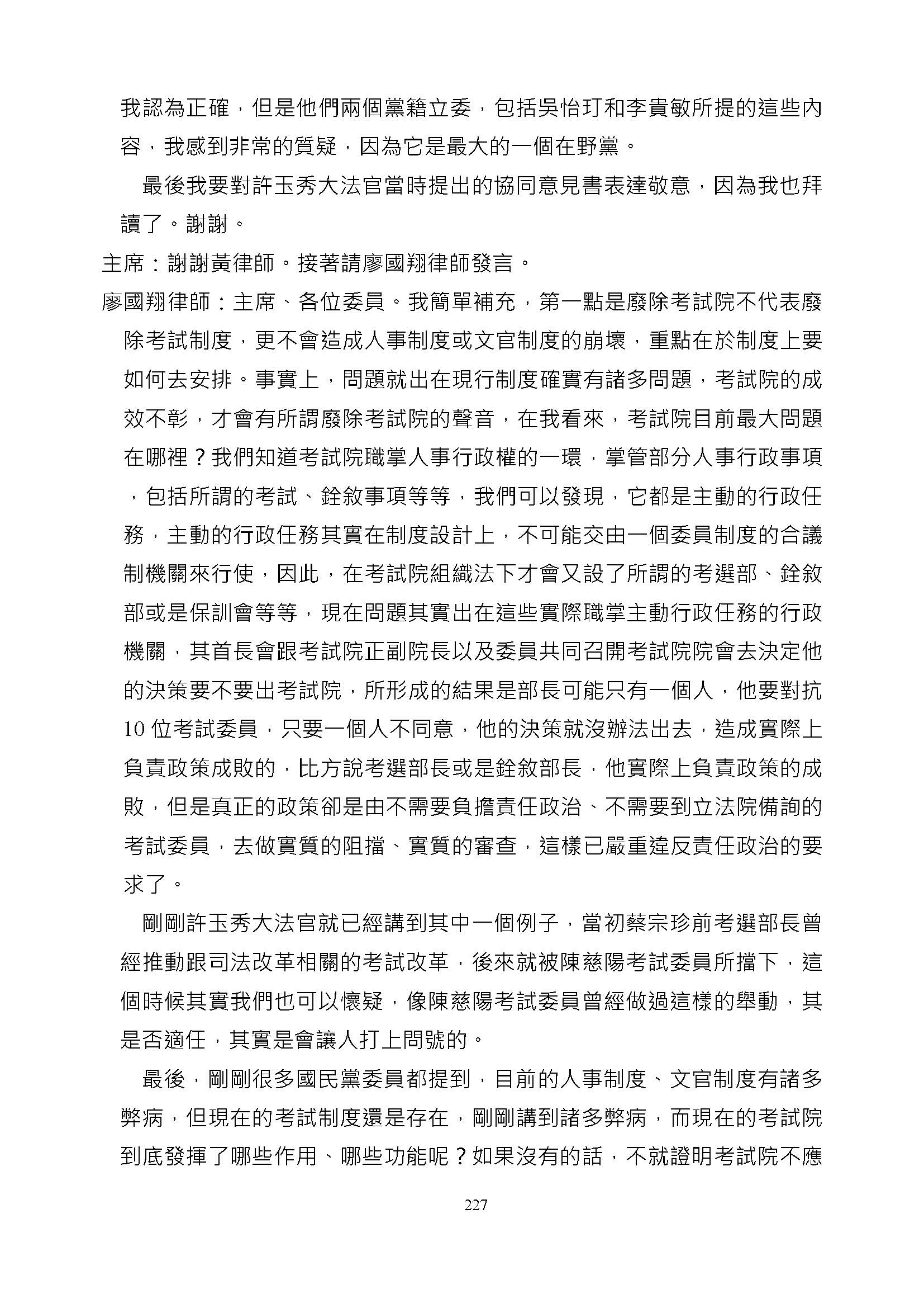 主席:報告全院委員會,針對司法院院長、副院長及五位大法官被提名人之資格及是否適任相關事項,均已審查完畢。本案作以下決議:提報院會,以記名投票表決。現在散會。