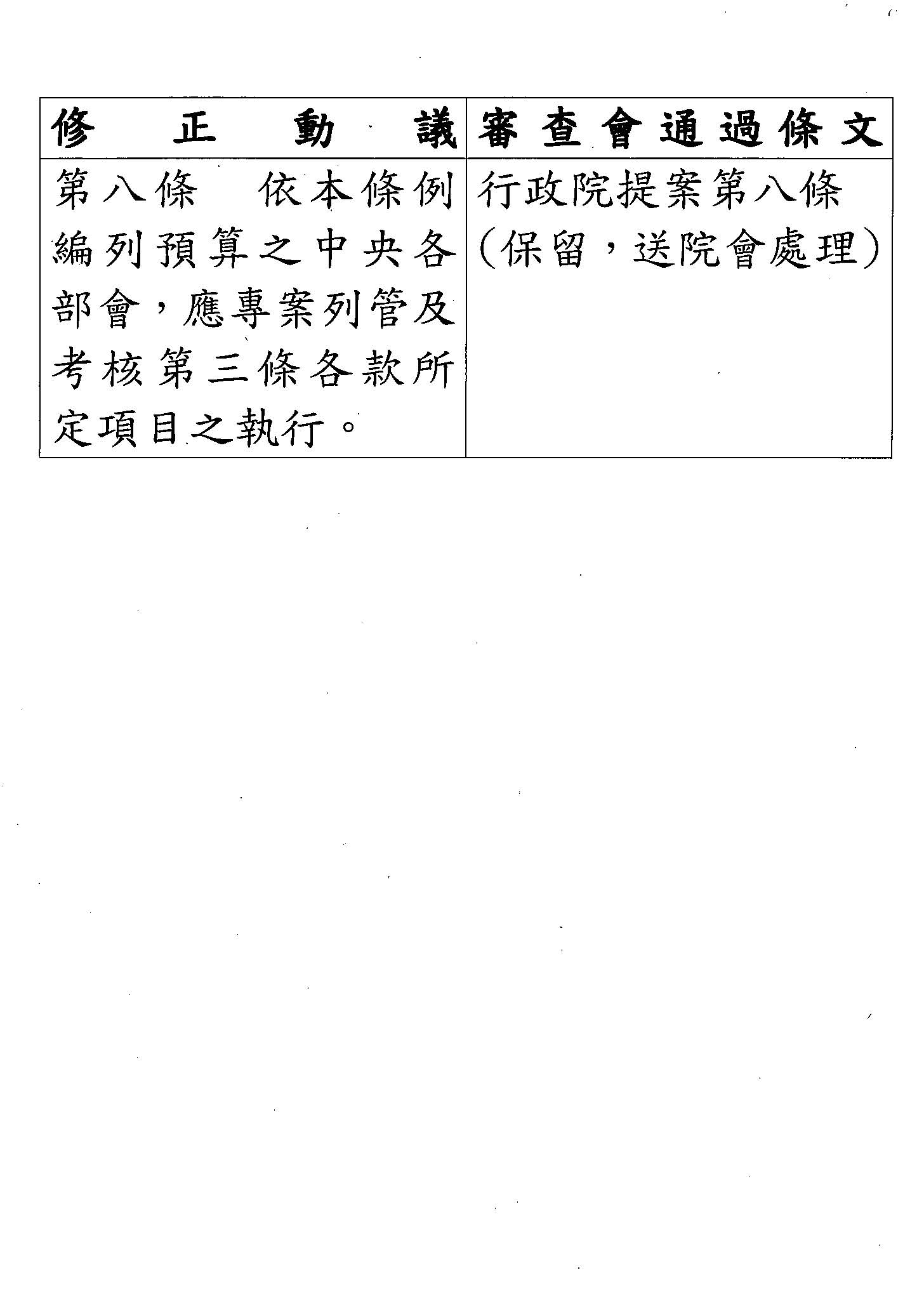 第 八 條 依本條例編列預算之中央各部會應專案列管及考核第三條各款所定項目之執行。