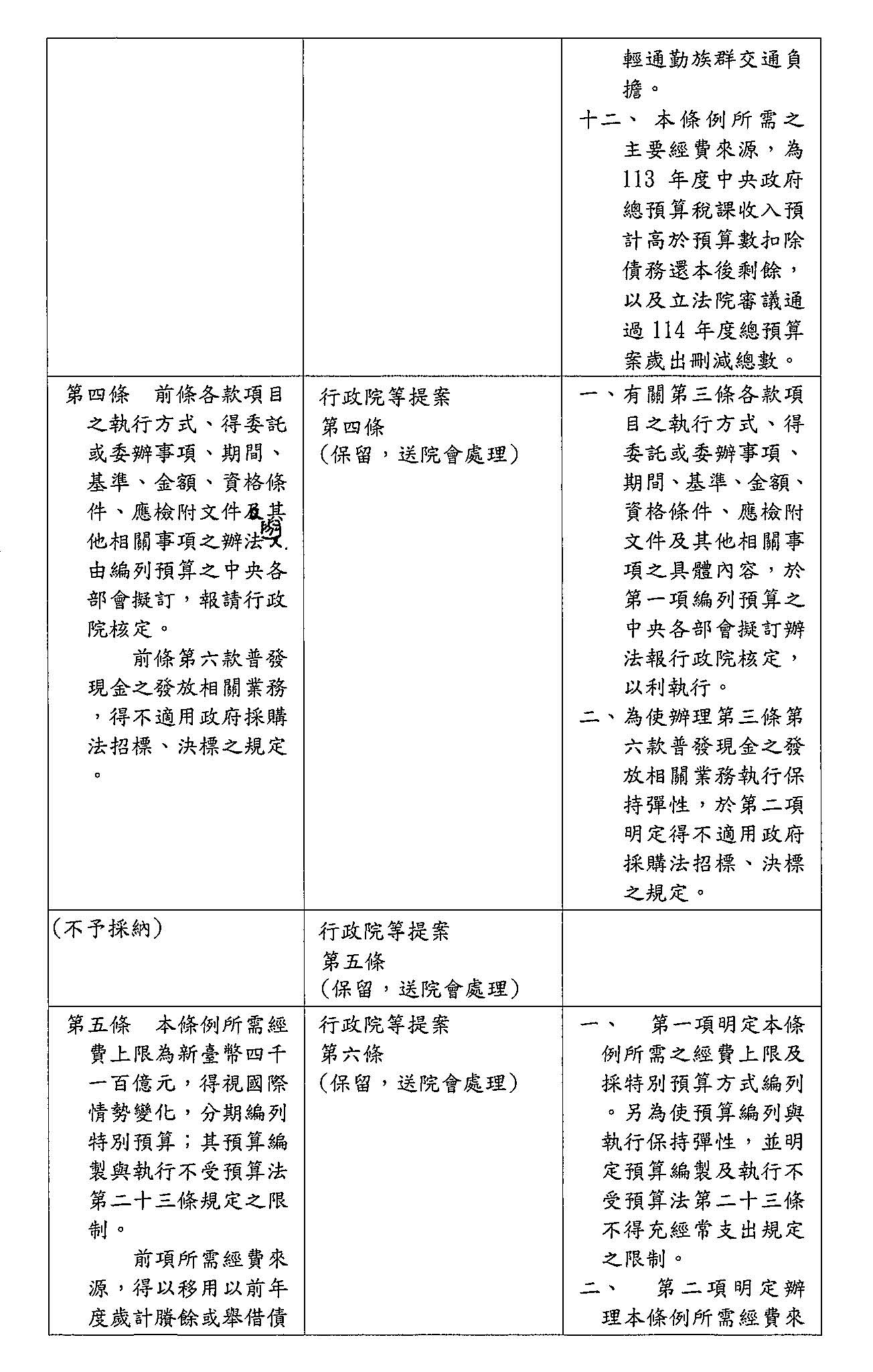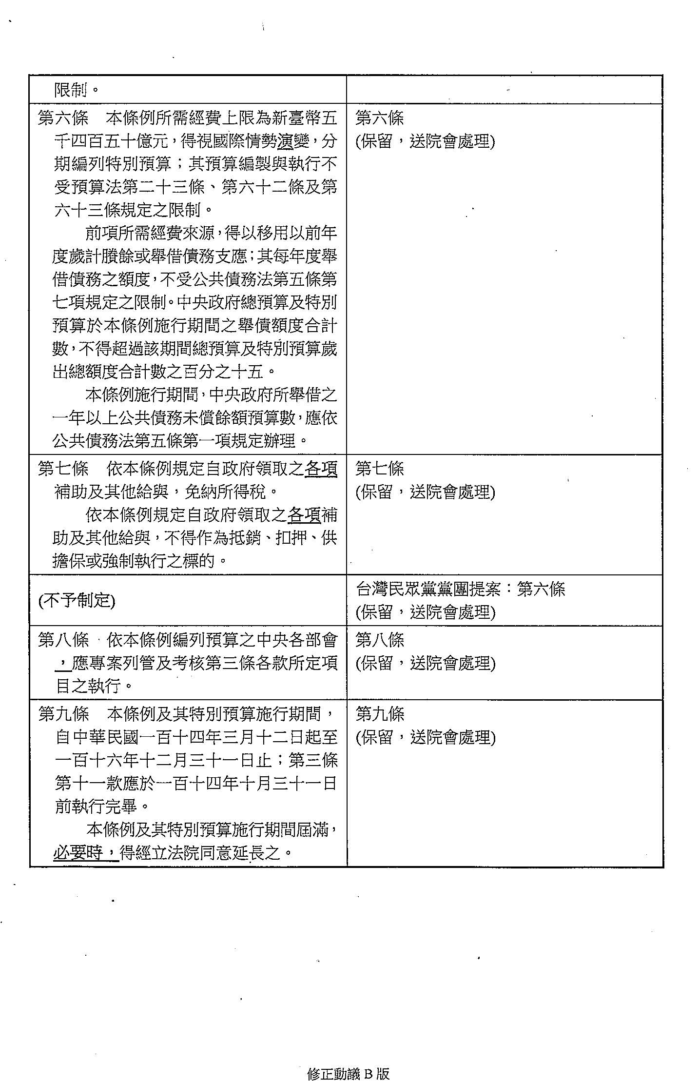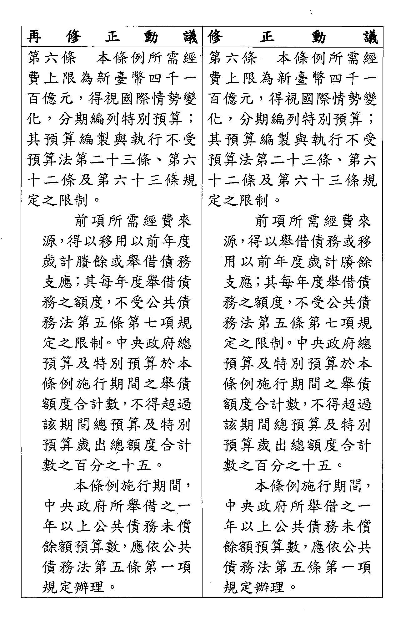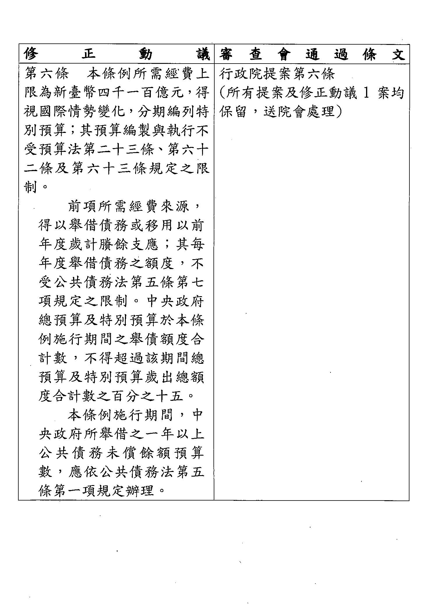 第 六 條 本條例所需經費上限為新臺幣五千四百五十億元,得視國際情勢變化,分期編列特別預算;其預算編製與執行不受預算法第二十三條、第六十二條及第六十三條規定之限制。
