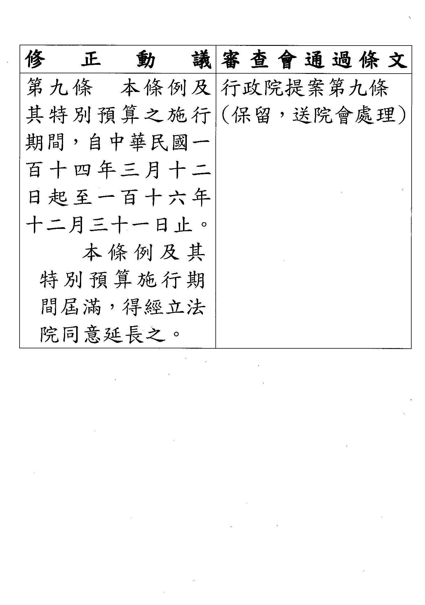 第 九 條 本條例及其特別預算施行期間,自中華民國一百十四年三月十二日起至一百十六年十二月三十一日止。
