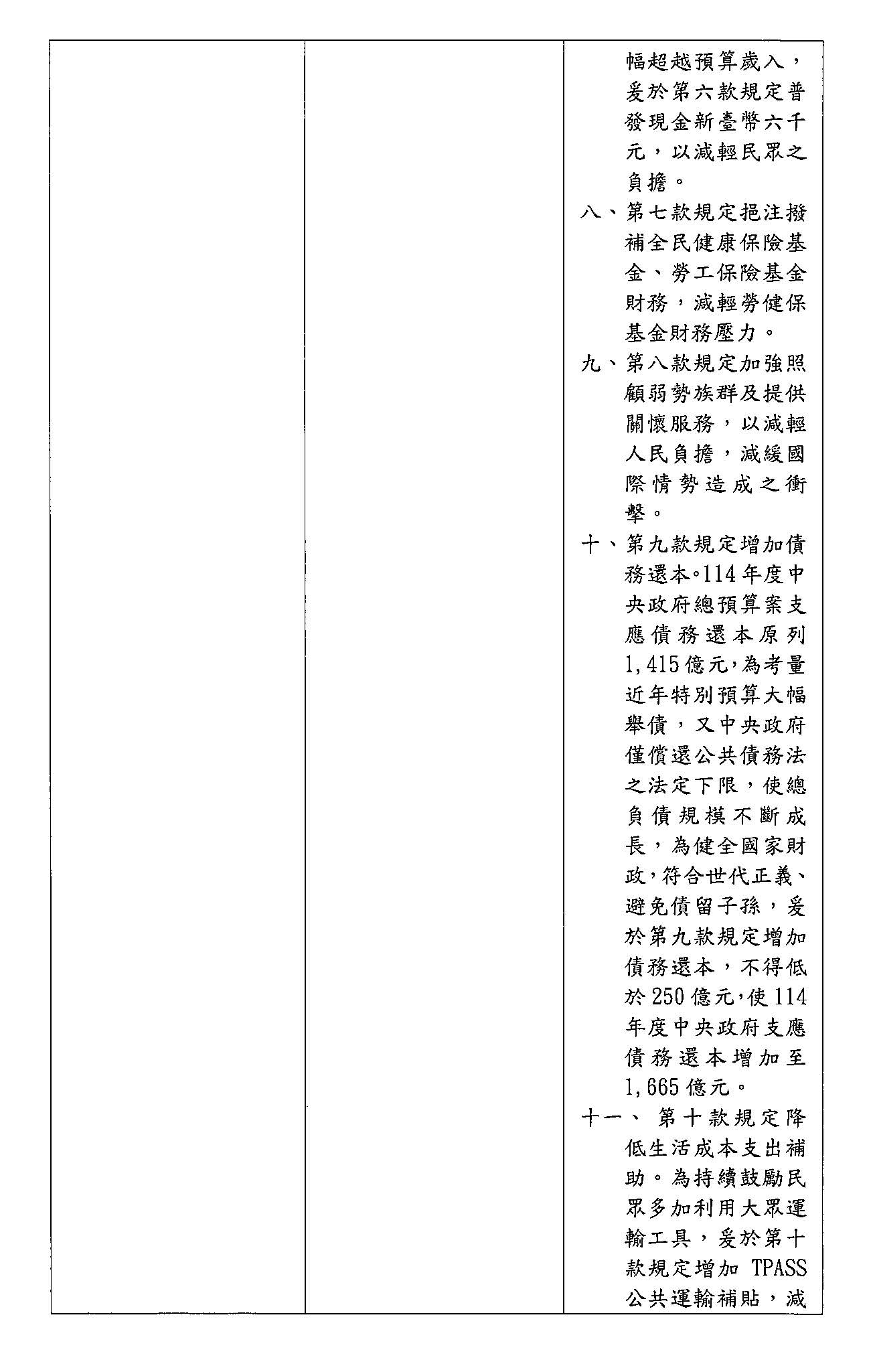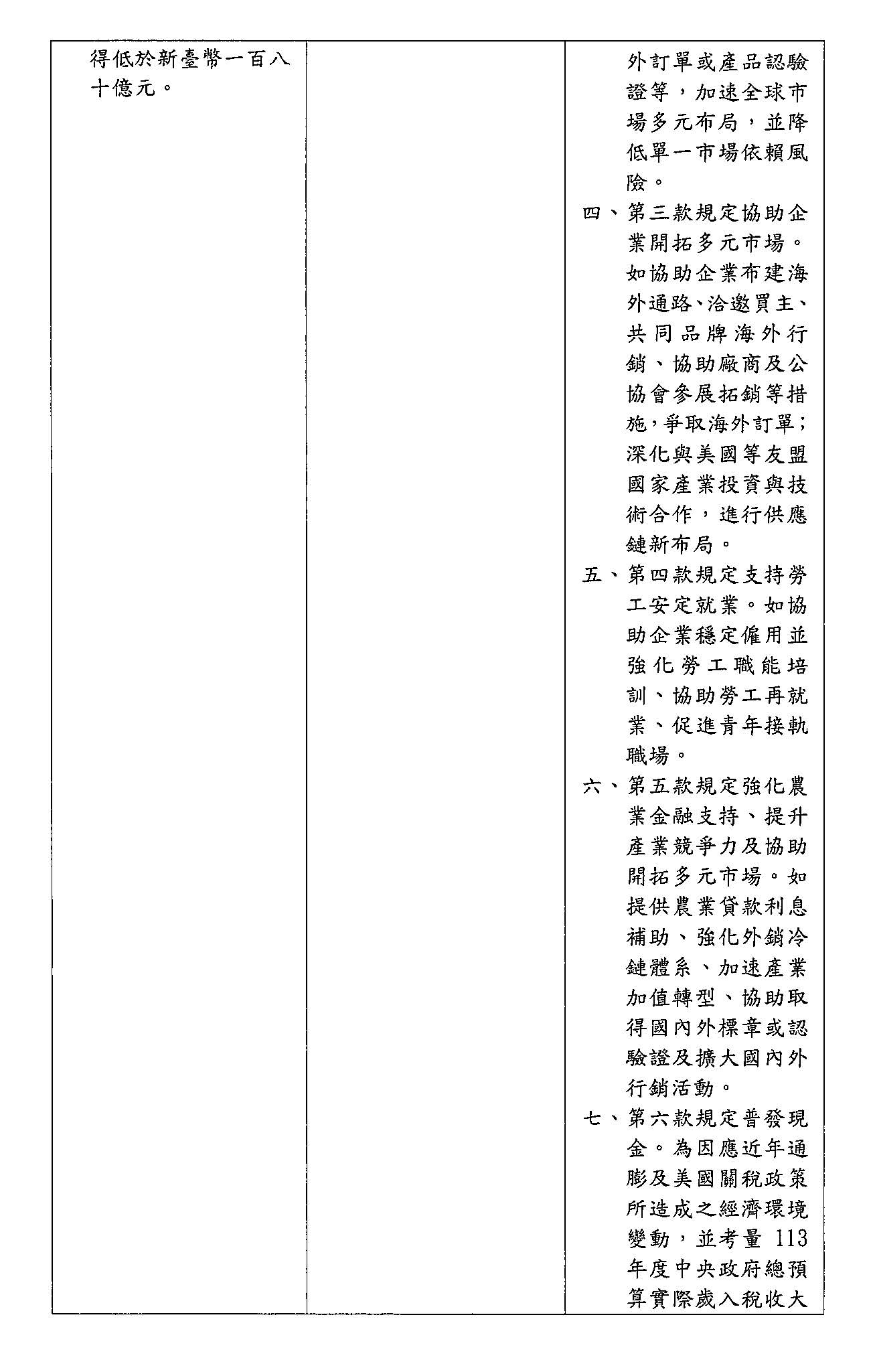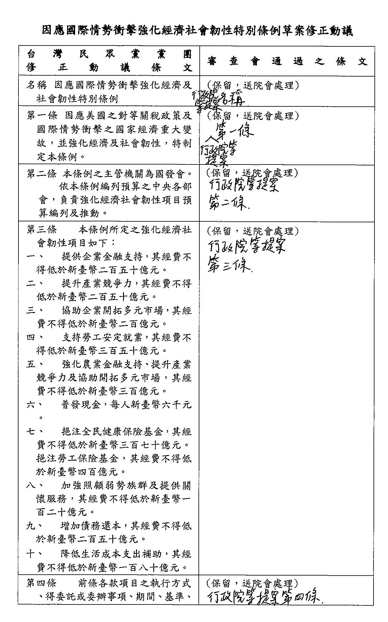 一、針對「因應國際情勢強化經濟社會及國土安全韌性特別條例草案」,應對美國之關稅變革可能對我國經濟、社會各層面之衝擊,用於照顧民生有健保200億、勞保100億、協助弱勢120億,共420億。