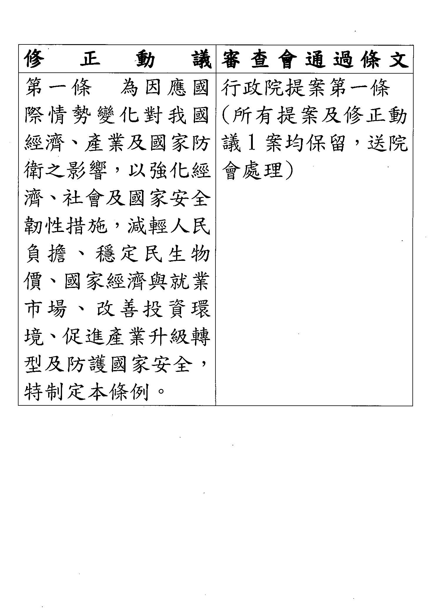 主席:現在作以下決議:因應國際情勢強化經濟社會及民生國安韌性特別條例制定通過。