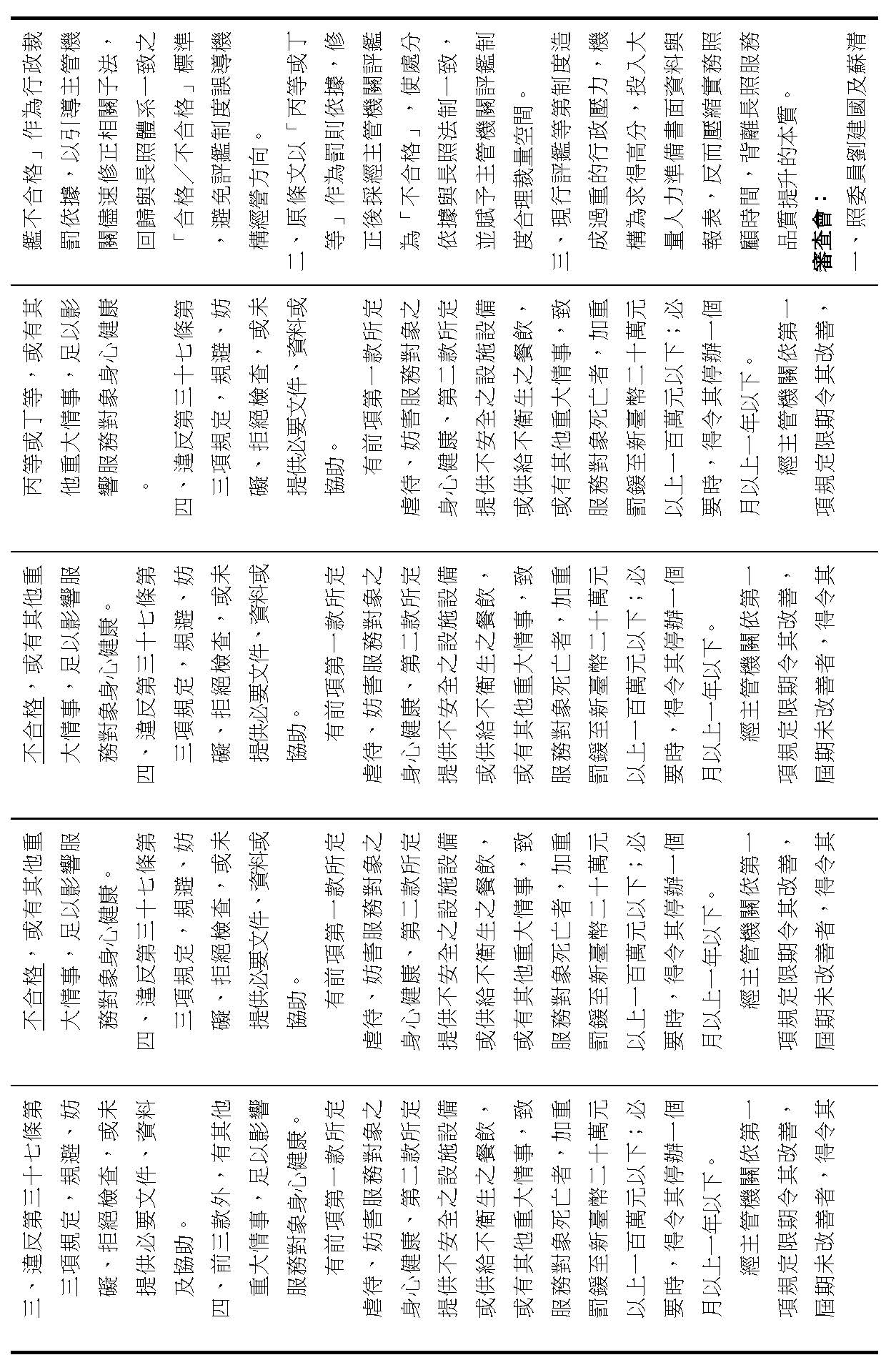 這次修法通過後,我們將以不合格作為處分的依據,讓所有的長照機構都在同樣一個標準下受到公平的對待,有助於制度的簡化,以及讓資源回歸到照顧的本質。我要強調,這樣的修法並非放水哦!機構若有重大的疏失,評鑑結果仍然會是屬於不合格,該有的處分、限期改善、公告廢止等等機制都還是存在的,我們只是希望避免讓第一線的照顧人員被過度的書面化、行政化,才能把真正的照顧品質放回、放在照顧的現場。