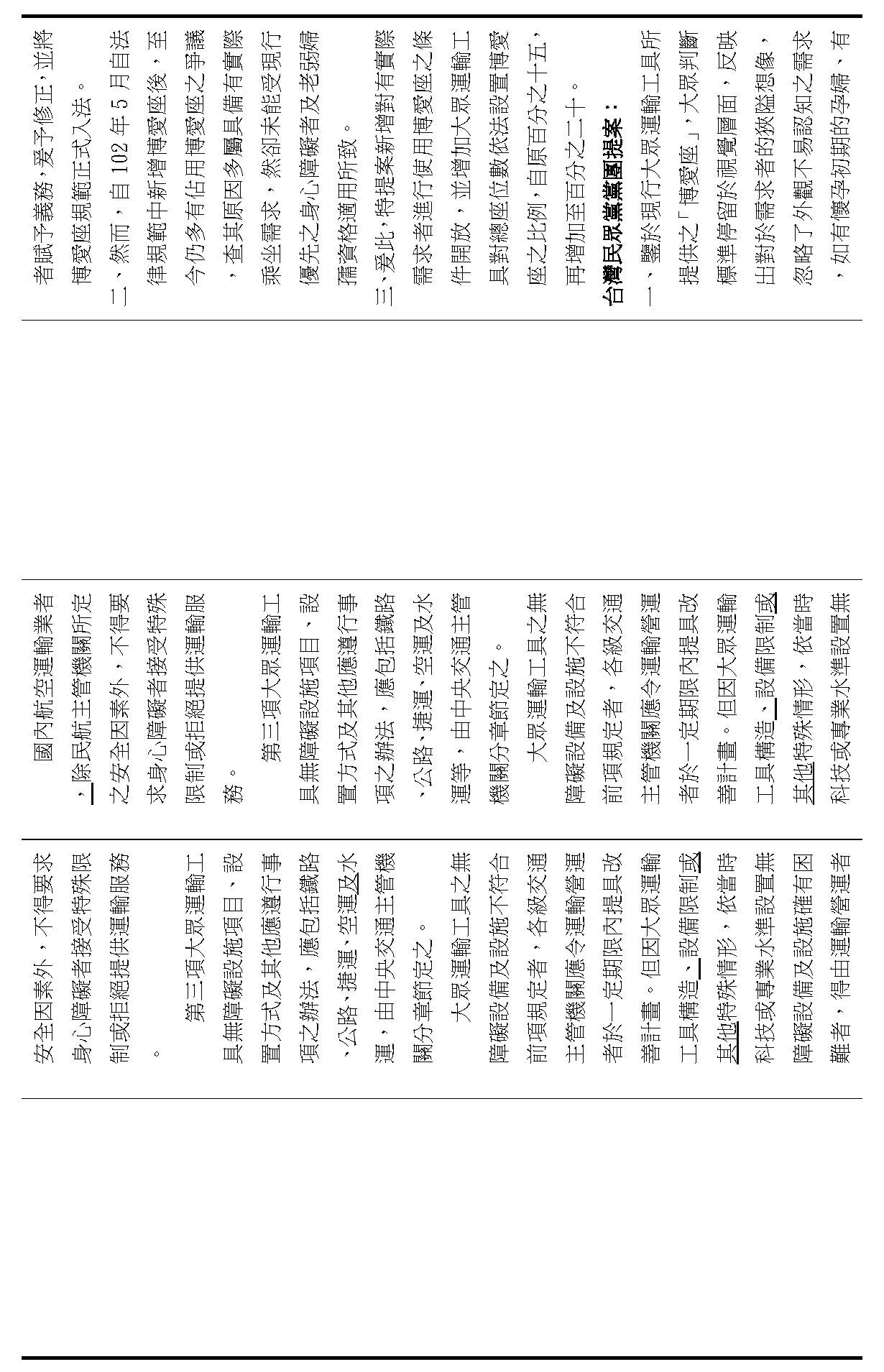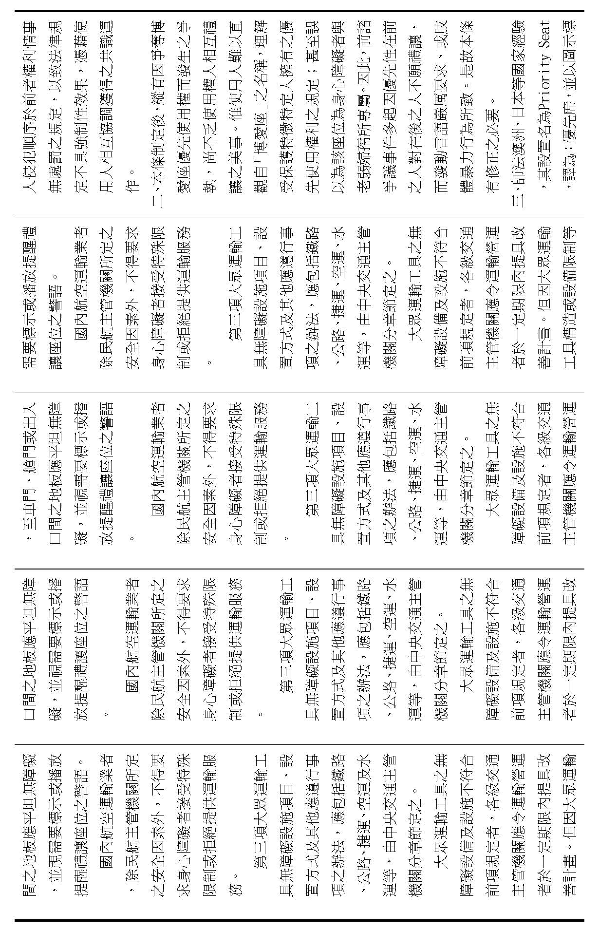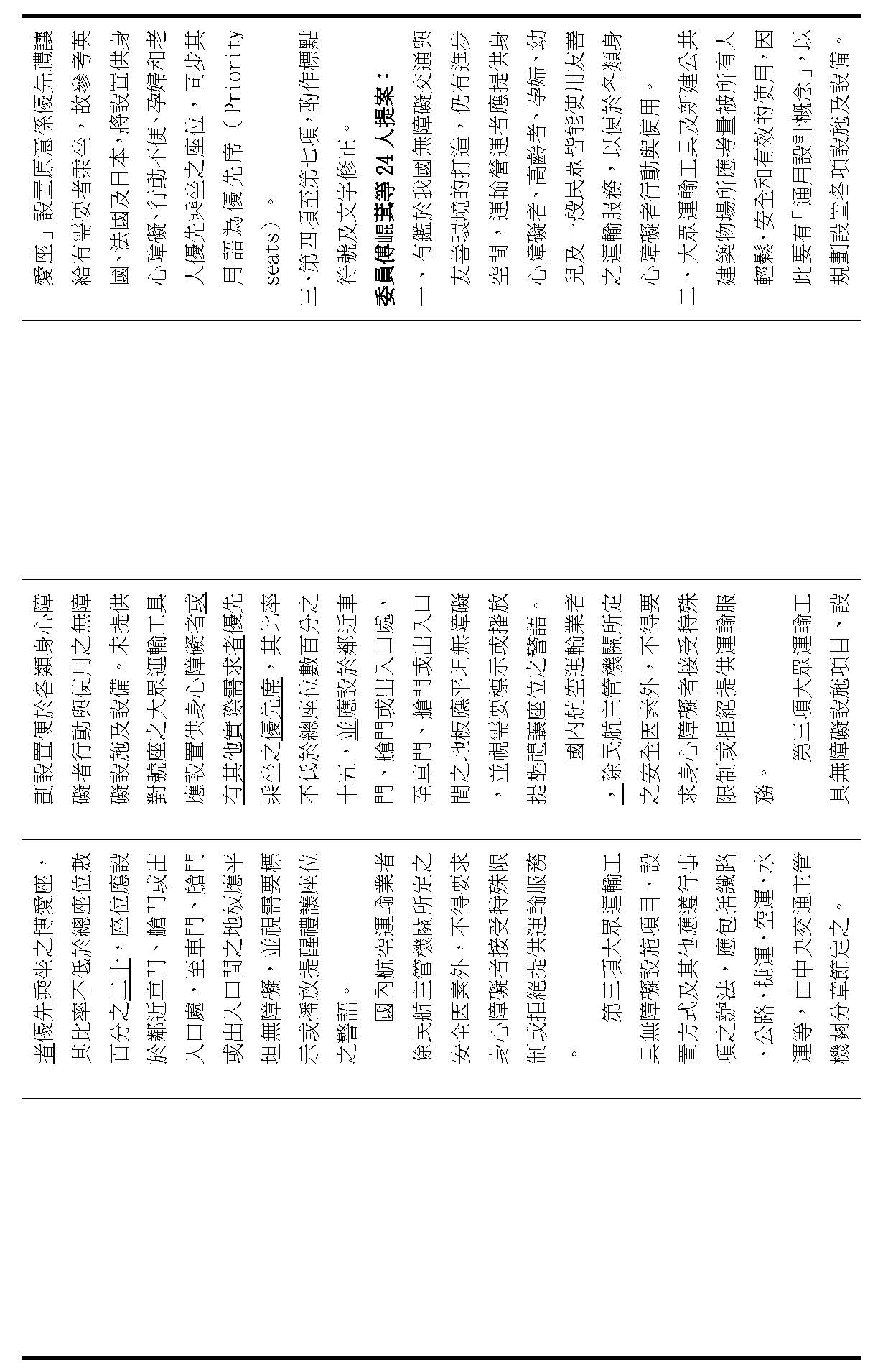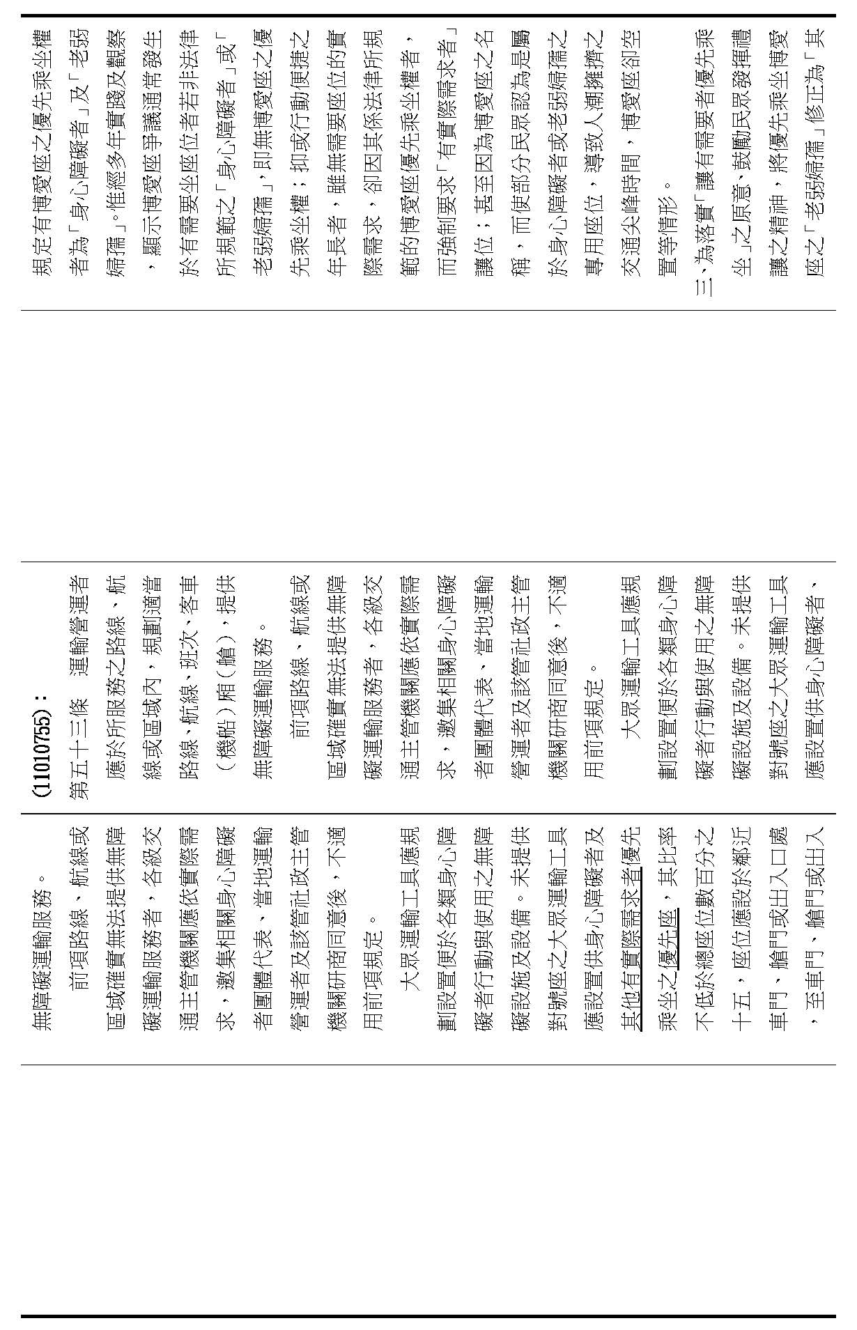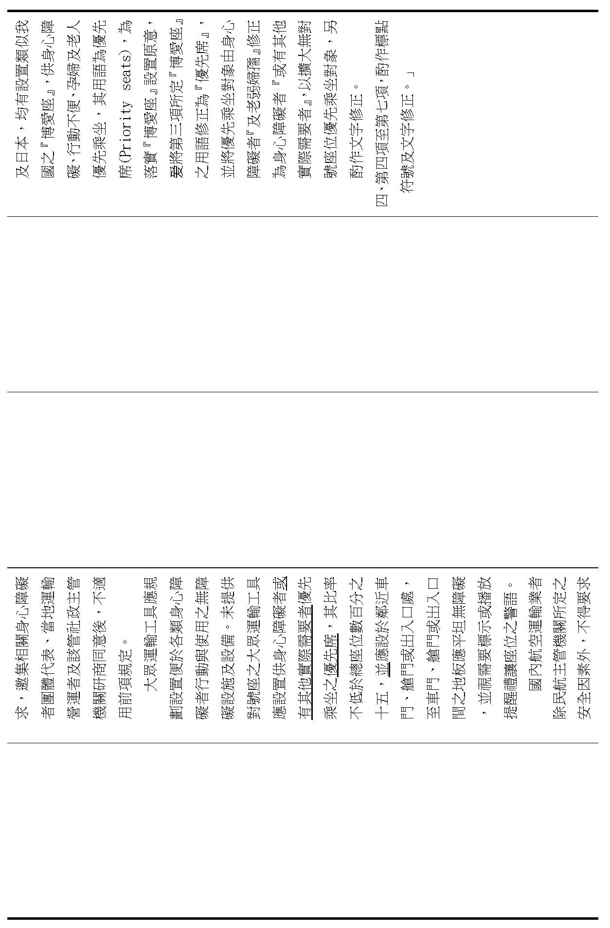 大眾運輸工具應規劃設置便於各類身心障礙者行動與使用之無障礙設施及設備。未提供對號座之大眾運輸工具應設置供身心障礙者或有其他實際需要者優先乘坐之優先席,其比率不低於總座位數百分之十五,並應設於鄰近車門、艙門或出入口處,至車門、艙門或出入口間之地板應平坦無障礙,並視需要標示或播放提醒禮讓座位之警語。