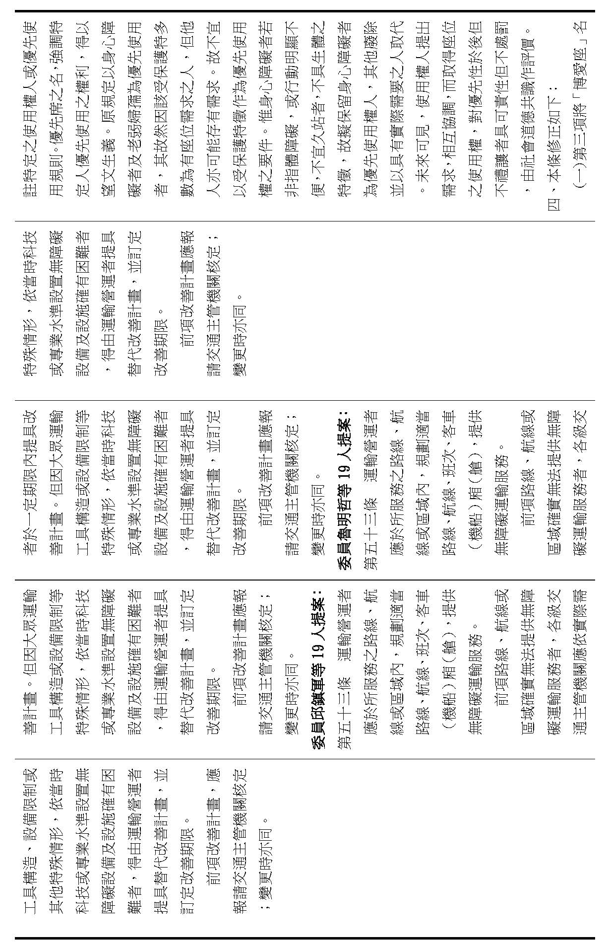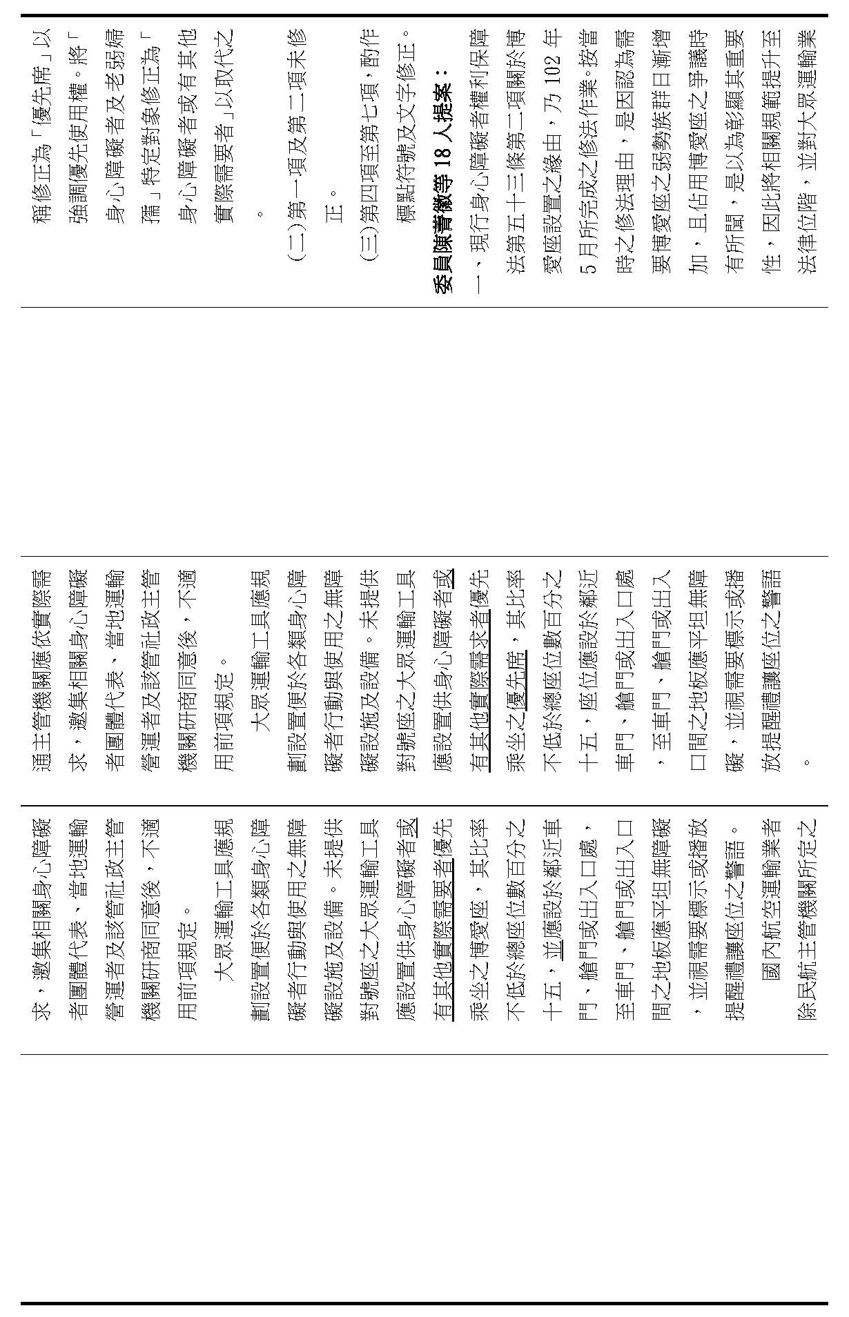 有關建議將優先乘坐博愛座對象之老弱婦孺修正為其他實際需要者,並將「博愛座」之用語修正為「優先席」,本部予以支持。另有關將「博愛座」設置比例自不低於總座位數之比例由百分之十五增加至百分之二十、大眾運輸工具應考量通用設計概念、大眾運輸工具之無障礙設施及設備不符規定者,應提具改善計畫於一定期限內調整為一年內,以及公車停靠站應依周遭環境配置並設置身心障礙者專用停靠搭車區等,事涉交通部權責,宜請該部表示意見。