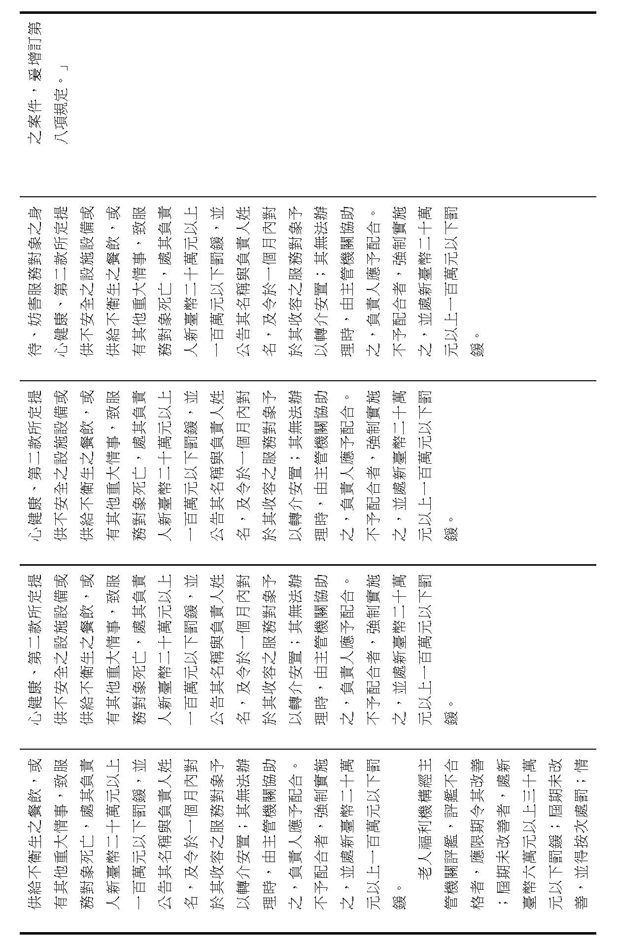 未依第三十六條第一項規定許可設立者,有第一項第一款所定虐待、妨害服務對象之身心健康、第二款所定提供不安全之設施設備或供給不衛生之餐飲,或有其他重大情事,致服務對象死亡,處其負責人新臺幣二十萬元以上一百萬元以下罰鍰,並公告其名稱與負責人姓名,及令於一個月內對於其收容之服務對象予以轉介安置;其無法辦理時,由主管機關協助之,負責人應予配合。不予配合者,強制實施之,並處新臺幣二十萬元以上一百萬元以下罰鍰。