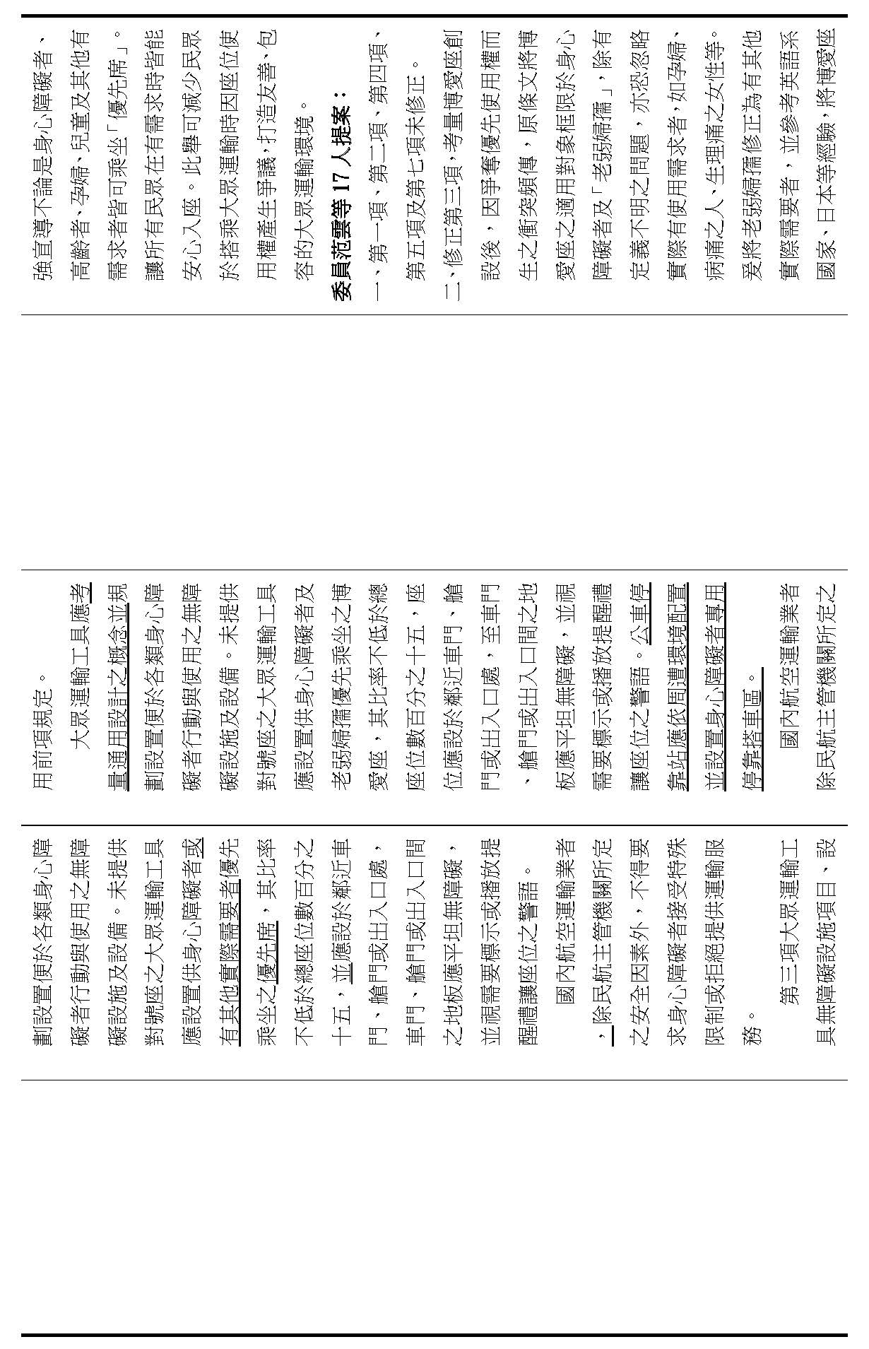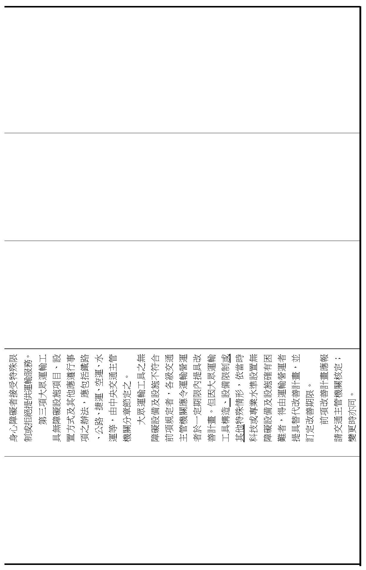 第三項大眾運輸工具無障礙設施項目、設置方式及其他應遵行事項之辦法,應包括鐵路、公路、捷運、空運及水運等,由中央交通主管機關分章節定之。