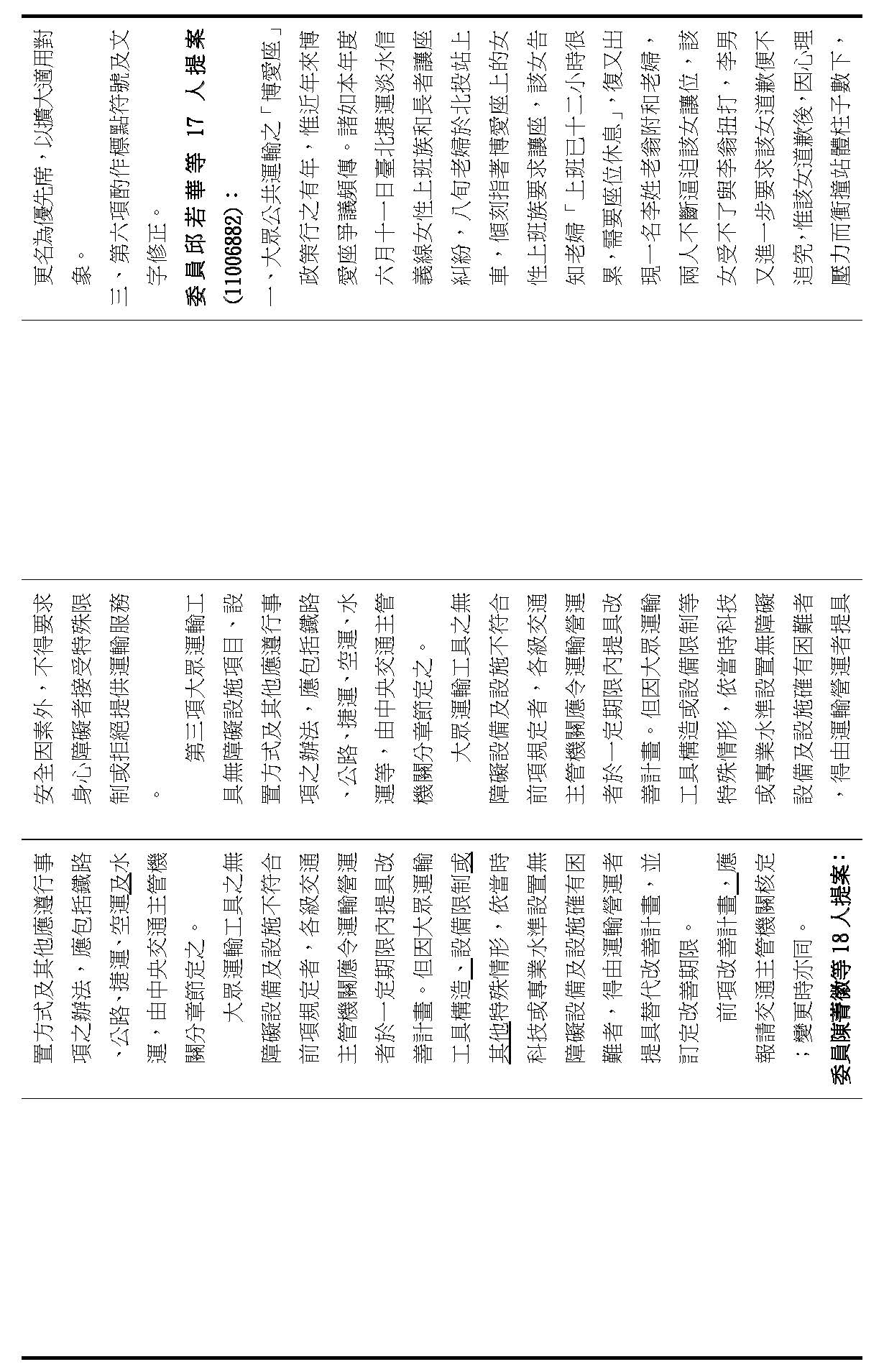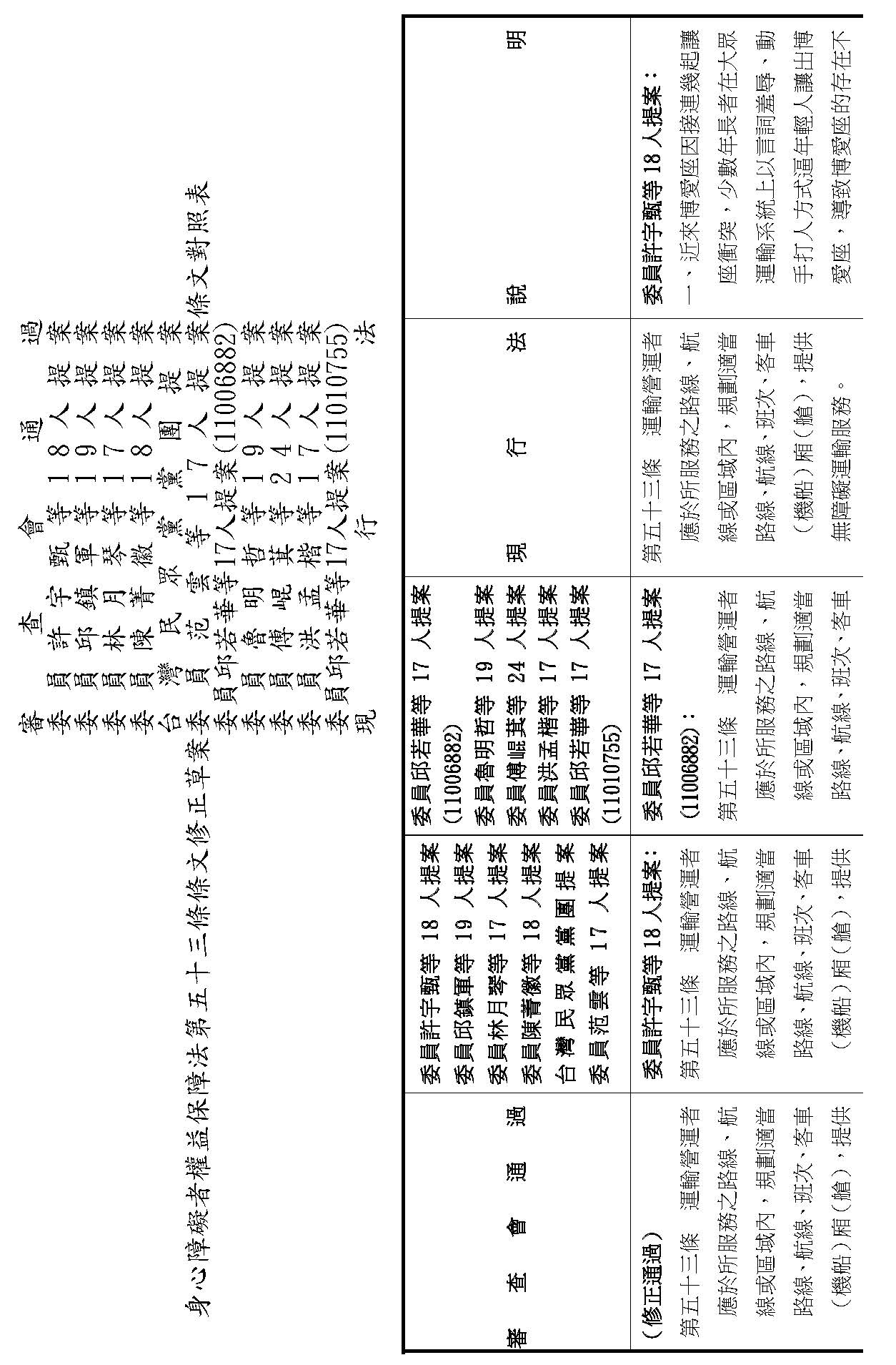 主旨:院會交付本會審查委員許宇甄等18人、委員邱鎮軍等19人、委員林月琴等17人、委員陳菁徽等18人、台灣民眾黨黨團、委員范雲等17人、委員邱若華等17人(提案第11006882號)、委員魯明哲等19人、委員傅崐萁等24人、委員洪孟楷等17人、委員邱若華等17人(提案第11010755號)分別擬具「身心障礙者權益保障法第五十三條條文修正草案」等11案,業經併案審查完竣,不須黨團協商,復請查照,提報院會公決。