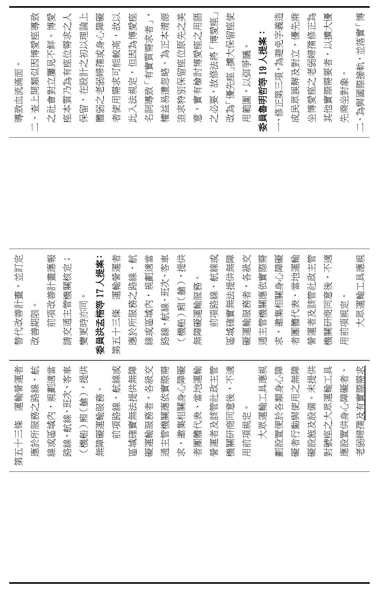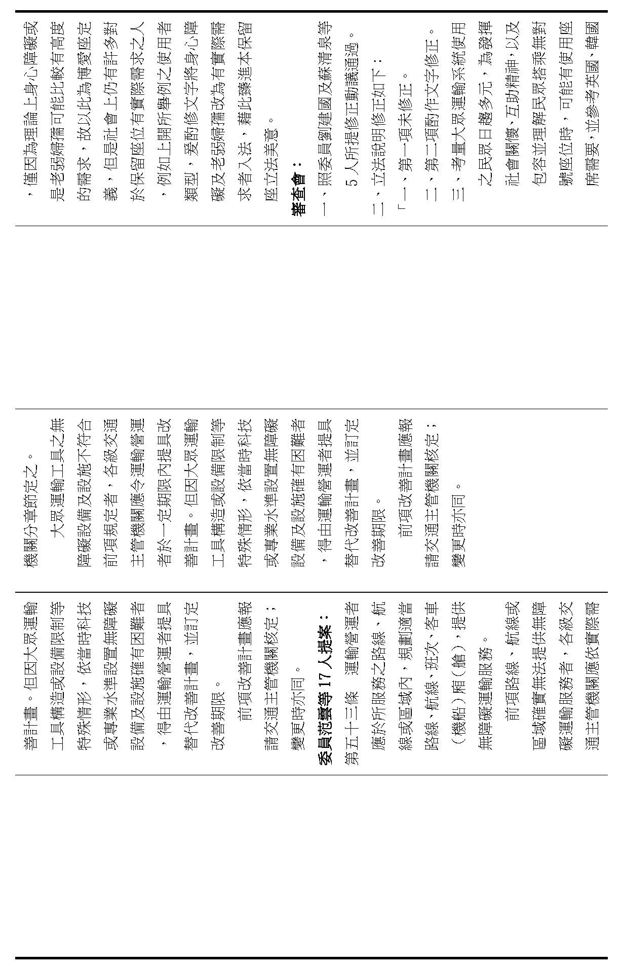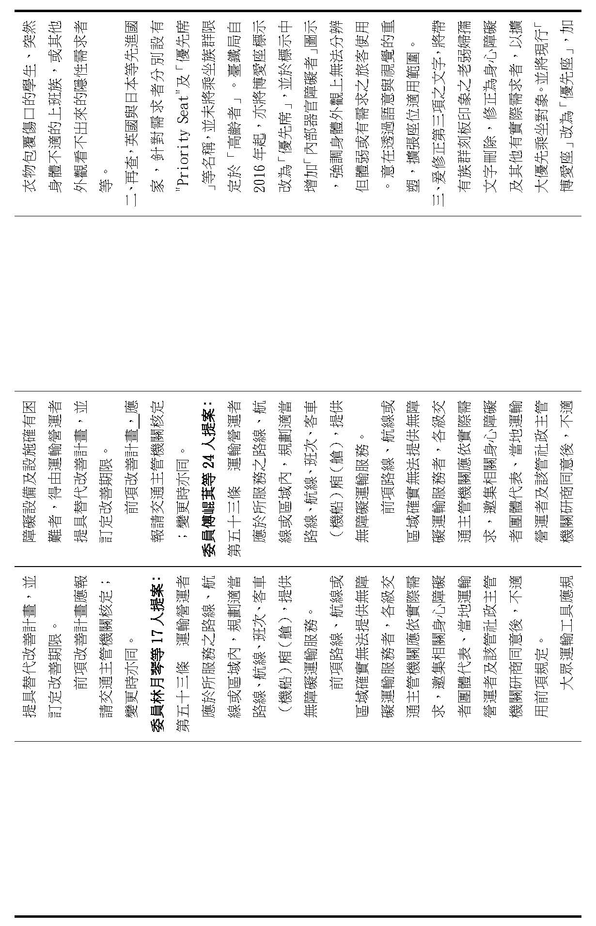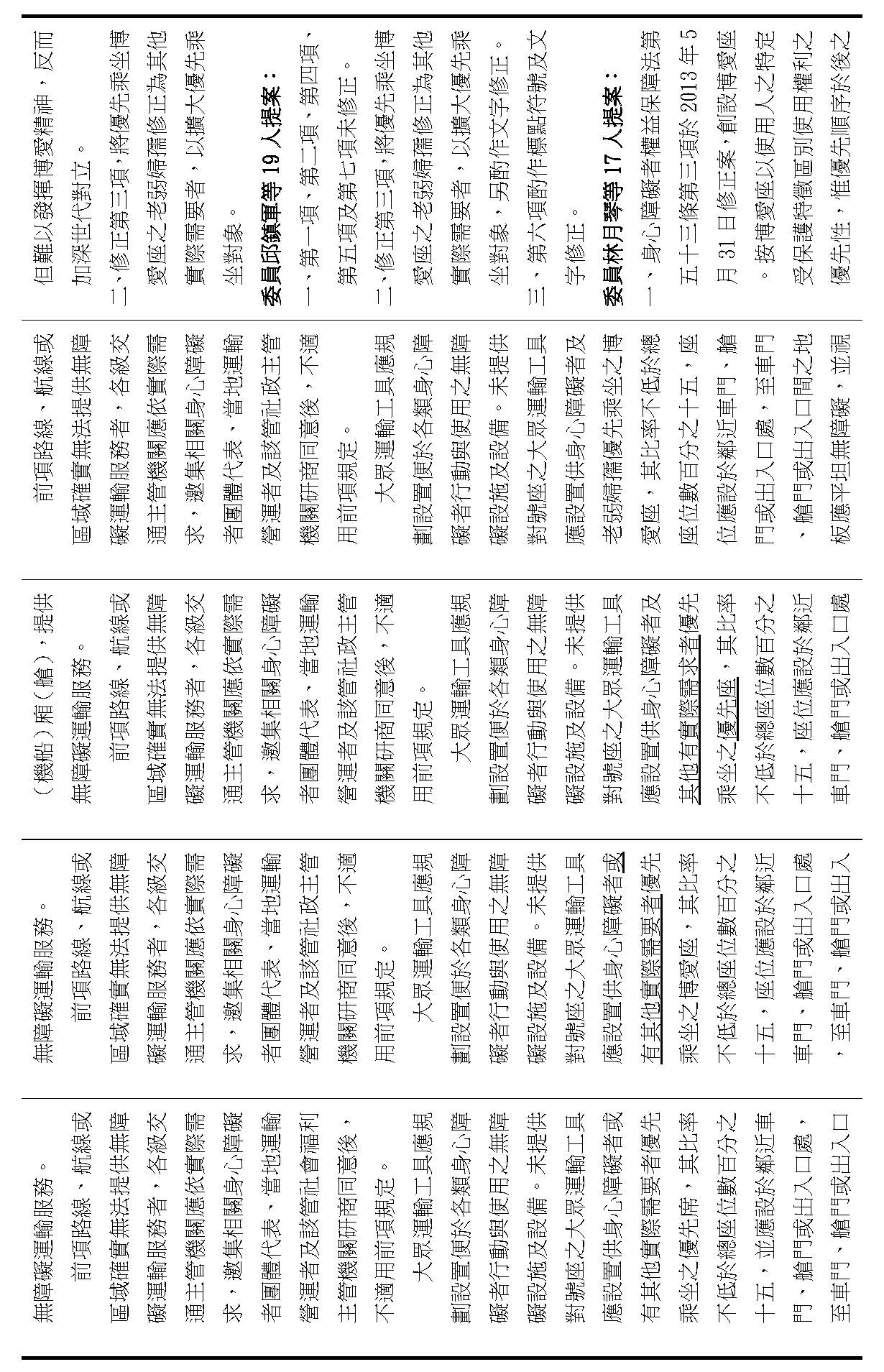 另外,本次修法對我而言仍有一些遺憾,就是針對法定特定座位的比例問題,無論是原本的博愛座或修法後的優先席,在提案中主張應將最低座位比例從15%提高到20%,可惜交通部卻反對擴大保障,明明2013年修法65歲以上人口僅12%,如今已突破了20%,十年間老人人口暴增七成,我們已經是超高齡社會了,所以維持舊標準早已無法因應當前的需求,未來若再推動保障擴大修法時,還請交通部不應再拒絕而從善如流,以上,感謝大家。