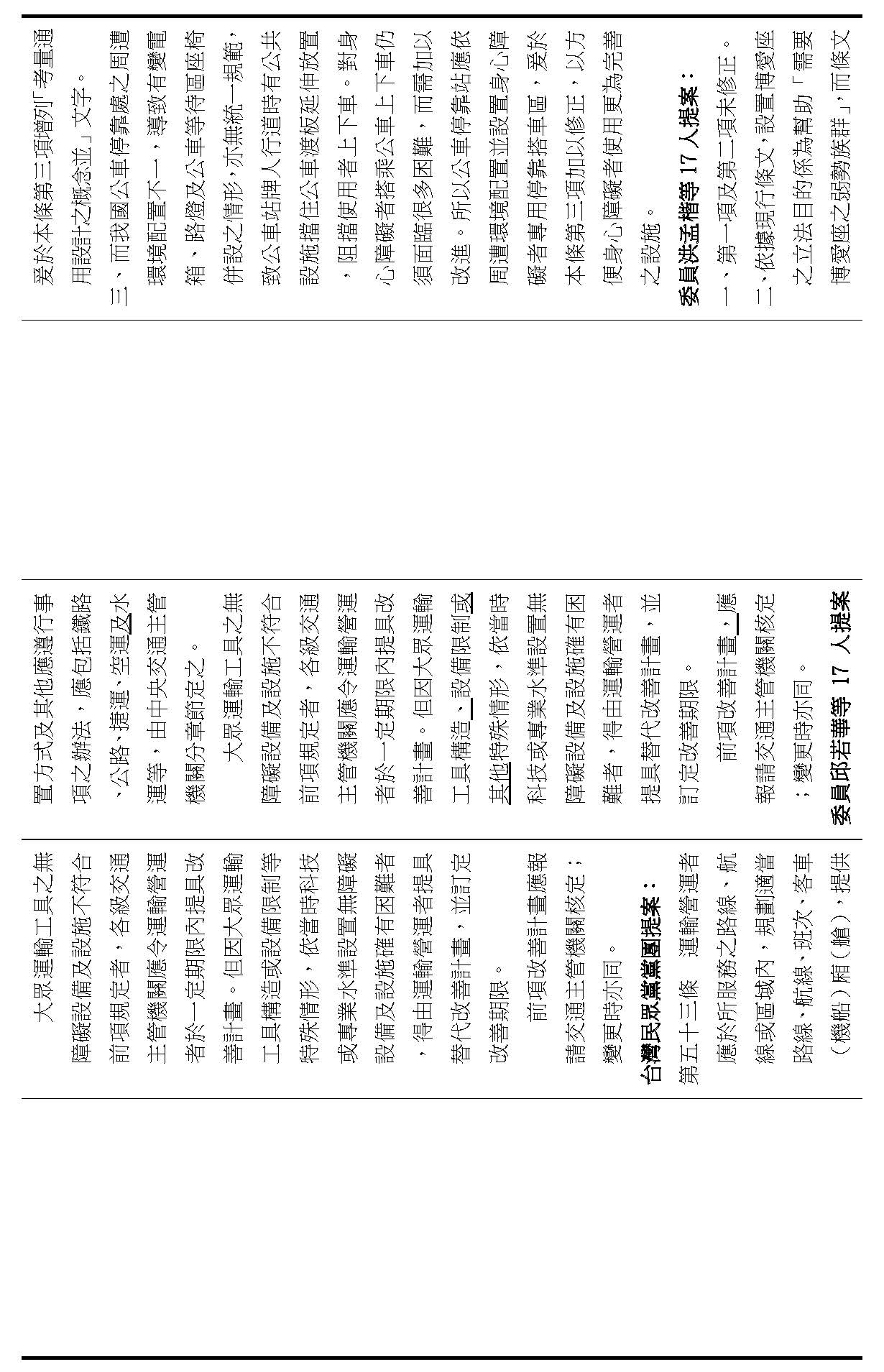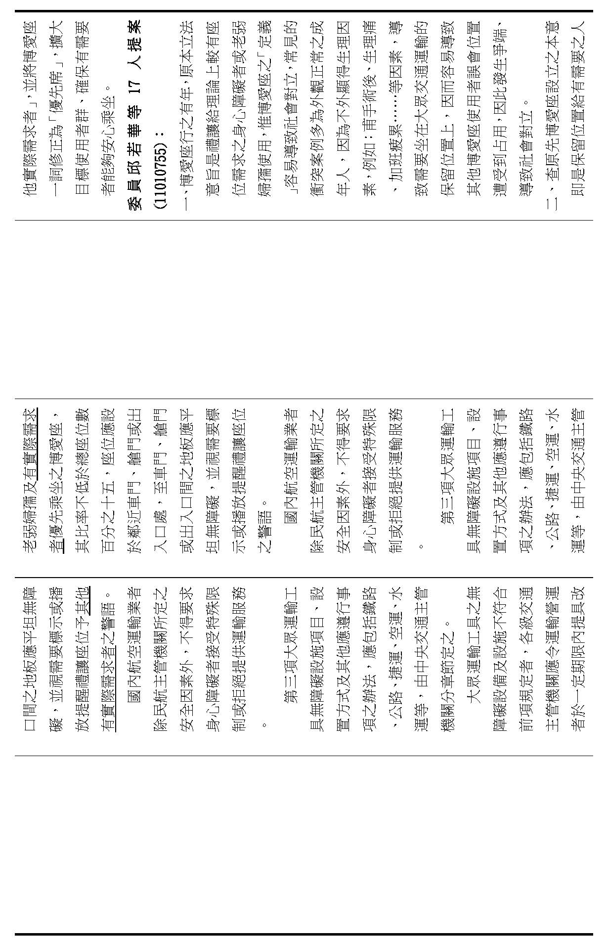 林委員月琴:(9時42分)主席、各位在場的委員。本席提出的身心障礙者權益保障法第五十三條修正案,不只是調整一張座位的名稱,而是回應社會觀感跟公共空間長期存在的矛盾跟誤解。博愛座最早源自於民國65年臺北市公車業者自行設置,後來於民國102年正式入法,明定大眾運輸交通工具應設置博愛座,提供老弱婦孺跟身心障礙者優先乘坐,隨後交通部也訂定了設施設計規範,全面來做推行。然而這幾年博愛座的爭議不斷,媒體跟社群平臺屢屢報導年長者要求讓坐,年輕人被指責自私、冷漠的衝突案例成為新聞焦點,導致原本善意的制度反而成為製造對立跟道德壓力的來源,不少民眾即使身體不適也不敢坐下,或在讓坐時遭婉拒的時候而陷入尷尬,這些情況都凸顯出臺灣社會對於博愛概念的混淆跟焦慮。我們應該理解,讓坐是基於同理心的自主選擇,而不是基於社會壓力的義務,這些人表面上看起來年輕、健康,但其實可能有隱性需求,我們不應該急著用道德眼光評價每一位乘客。