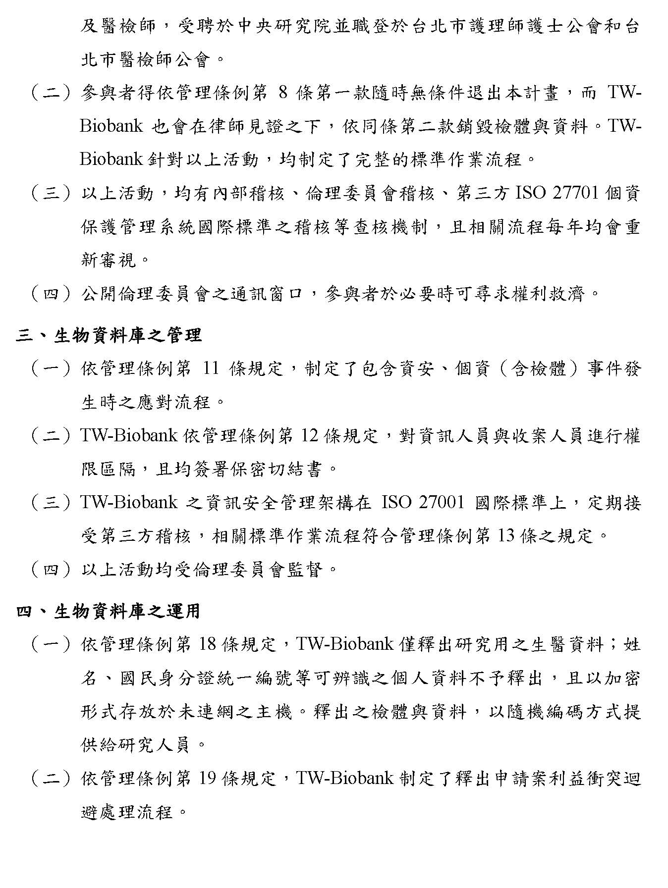 以上所有工作不光是接受倫理委員會的監督,也會由TW-Biobank內部持續檢視它的合規性,主管機關衛福部的醫事司也會定期拜託醫策會進行實地查核,確保各項作業完全符合法規。敬請各位委員、長官與先進未來繼續不吝指導。謝謝。