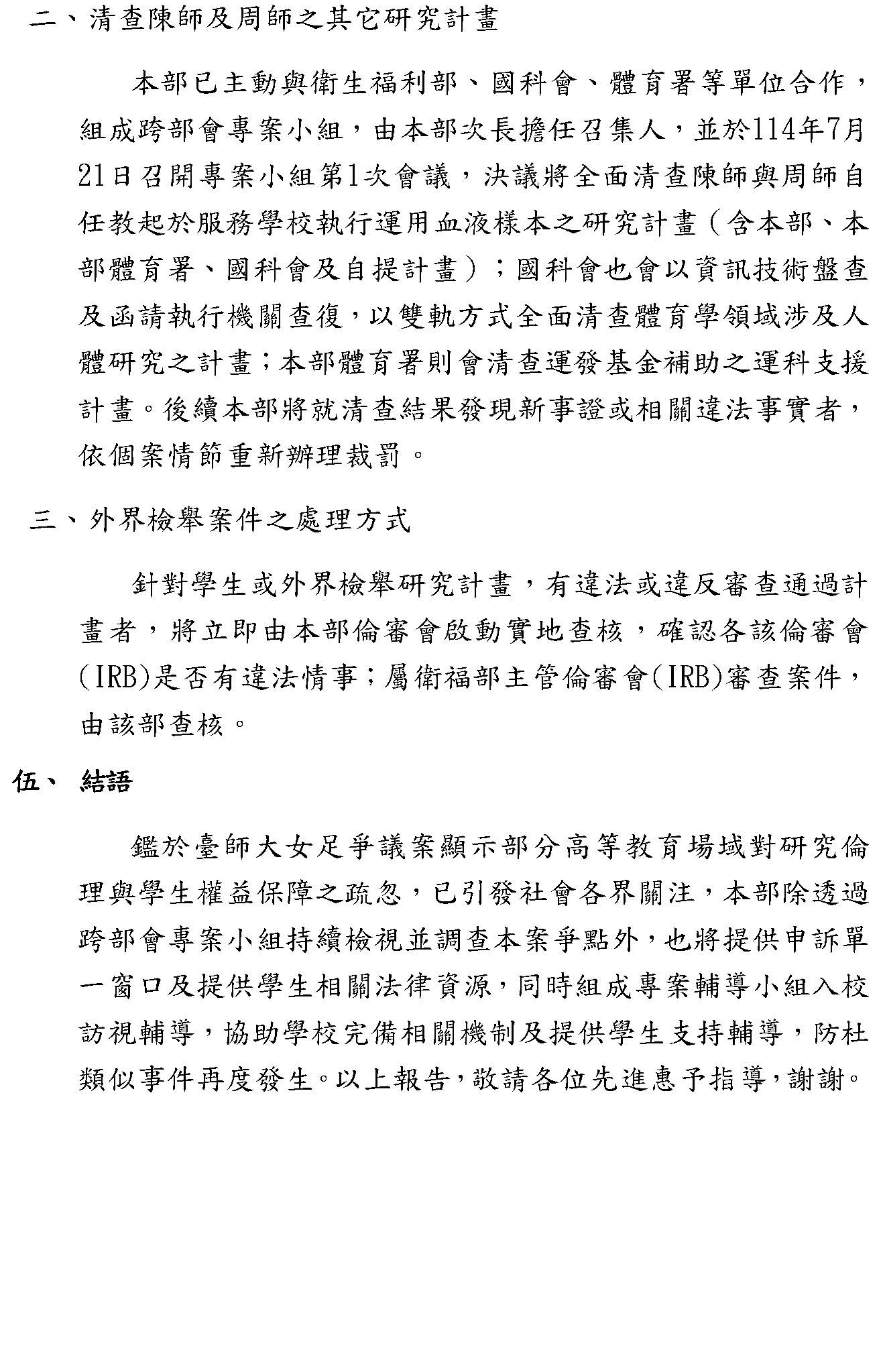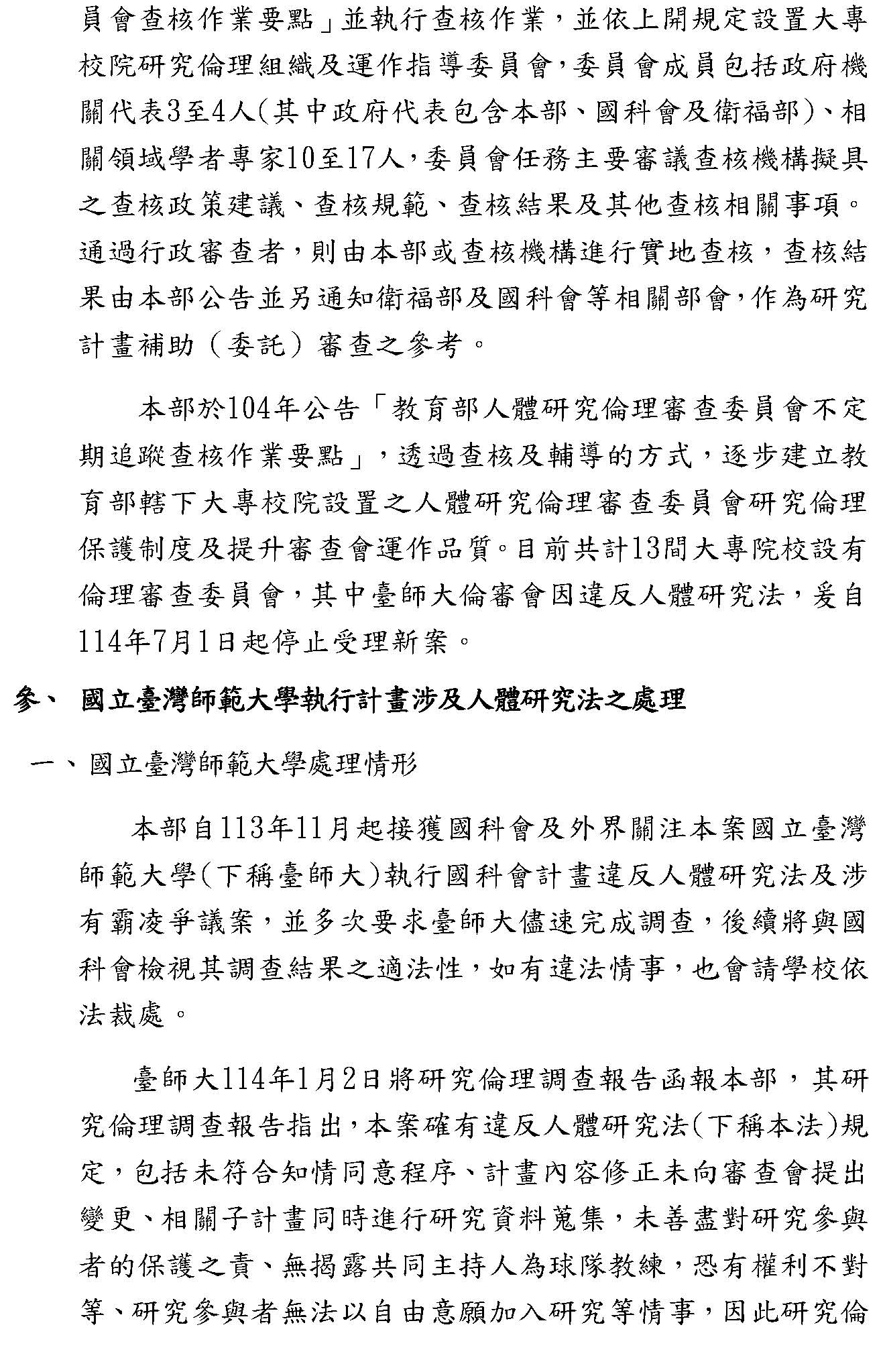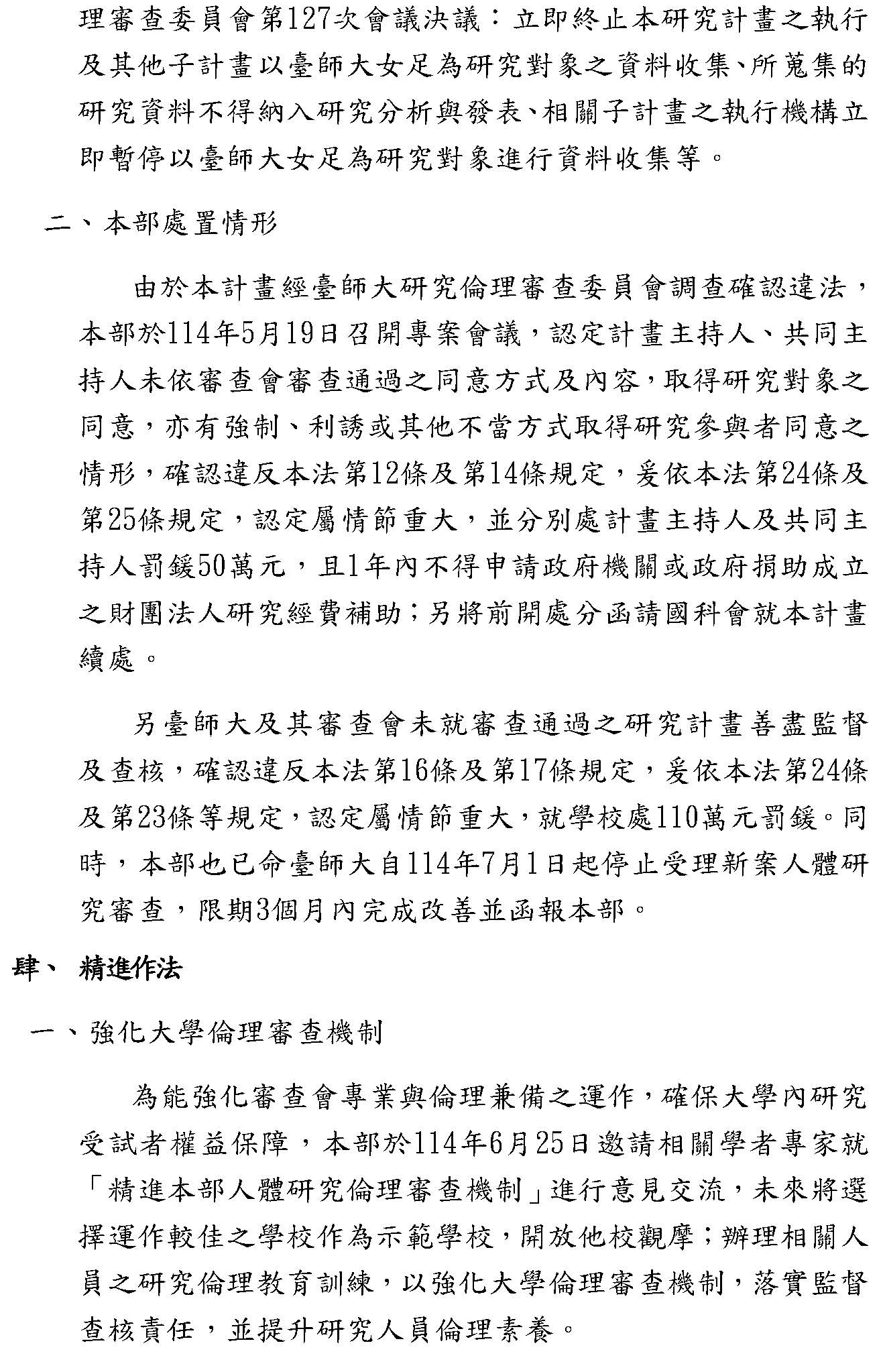 第二點,有關於臺師大執行國科會計畫,其計畫主持人陳忠慶教授以及計畫內所載的共同主持人周台英教授,依據臺師大倫理審查委員會所提的IRB報告指出,有違反人體研究法的部分,所以本部在114年5月19號組成委員會,經過審查之後發現有幾項缺失。第一個是知情同意書未事先給受試者簽署,而是以事後補齊的方式;第二個是計畫執行期程並沒有在IRB審查當中,未依照所規定的期程來實施,以及在這份研究計畫當中未充分揭露周師為女足隊的教練,導致有可能產生受試學生與周師的不對等權力關係,讓學生成為易受傷害的研究對象,因此我們分別依照其違反了人體研究法的第十二條、第十四條、第十六條以及第十七條,所以予以裁罰陳忠慶教師以及周台英教師各新臺幣50萬元的行政罰鍰,以及臺師大110萬元的行政罰鍰,命其7月1號停止受理相關的新案申請,限期3個月內要完成改善,並報教育部。