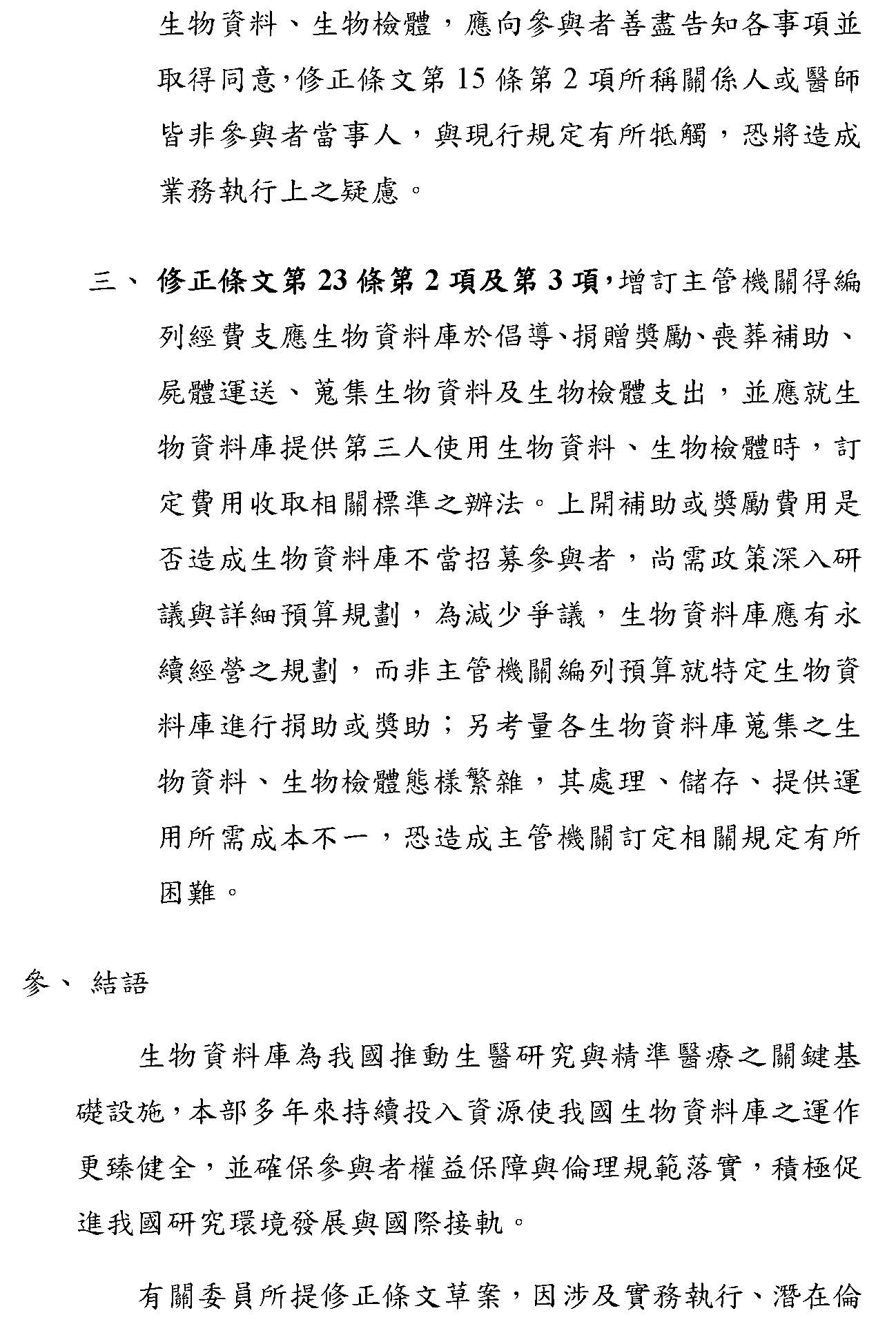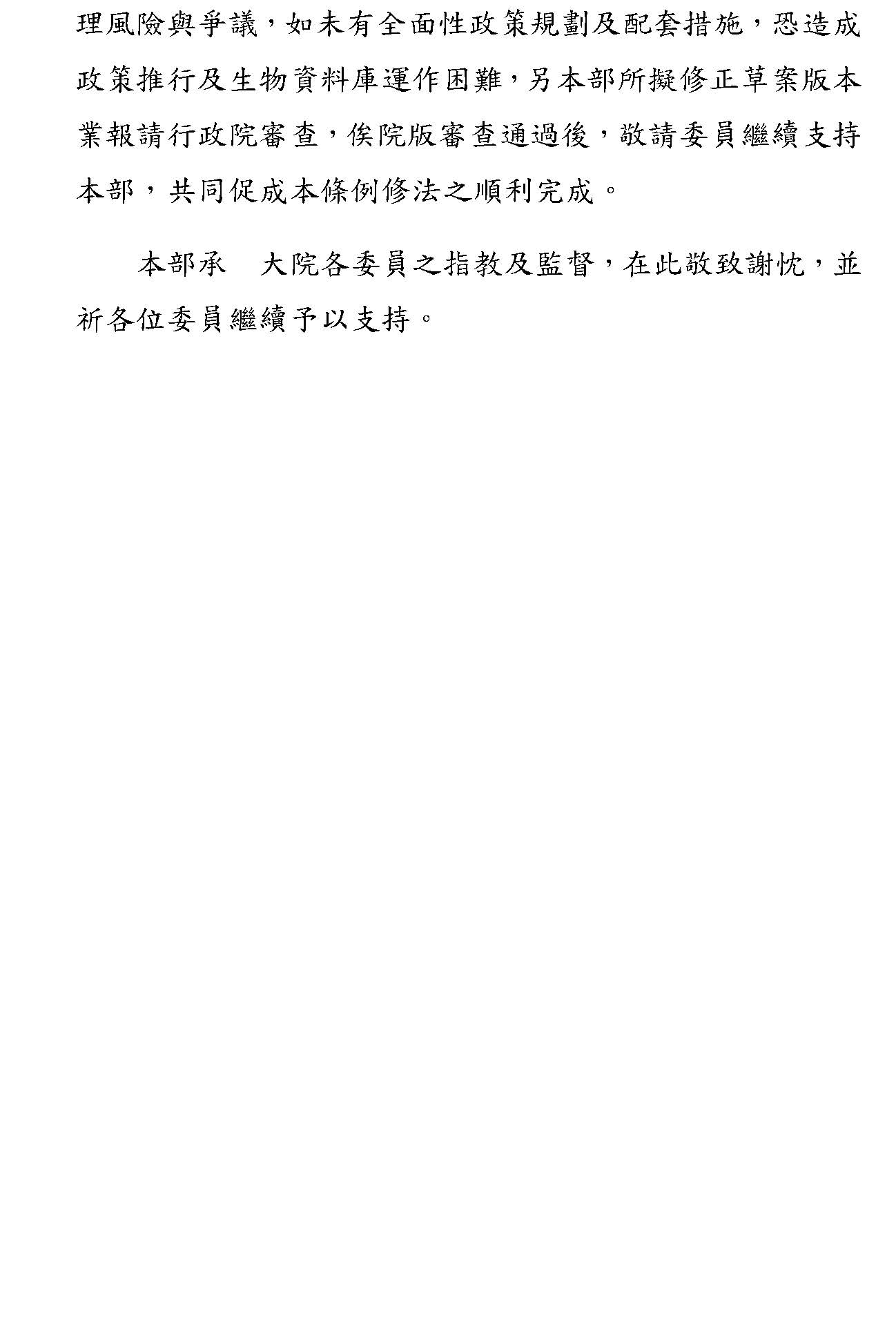 有關委員所提修正條文草案,因涉及實務執行、潛在倫理風險與爭議,如未有全面性政策規劃及配套措施,恐造成政策推行及生物資料庫運作困難,另本部所擬修正草案版本業報請行政院審查,俟院版審查通過後,敬請委員繼續支持本部,共同促成本條例修法之順利完成。