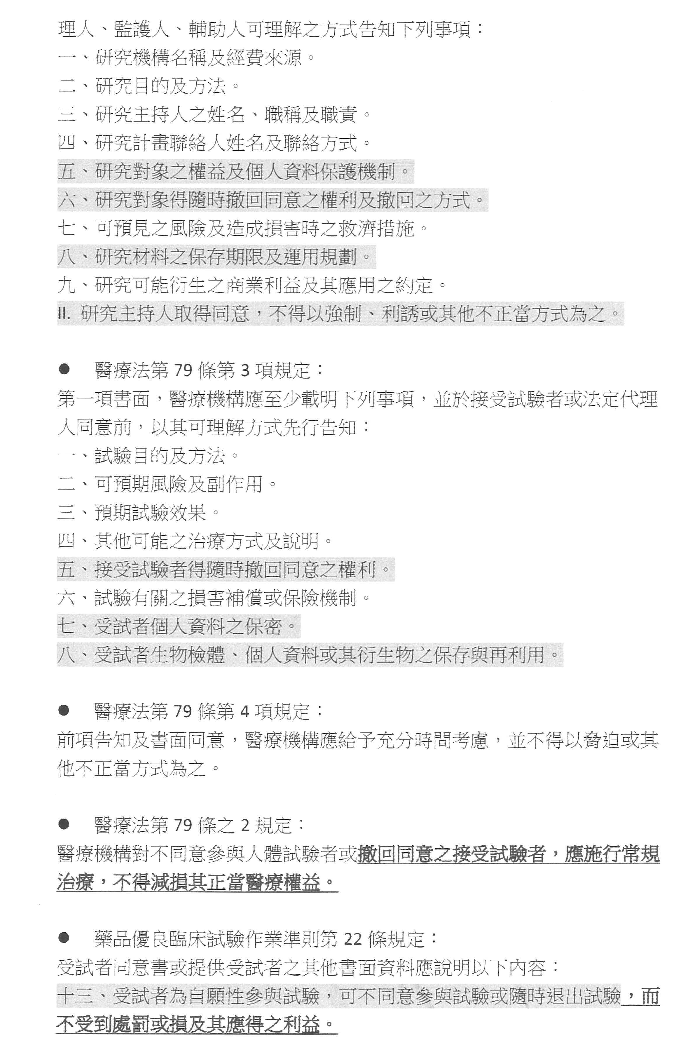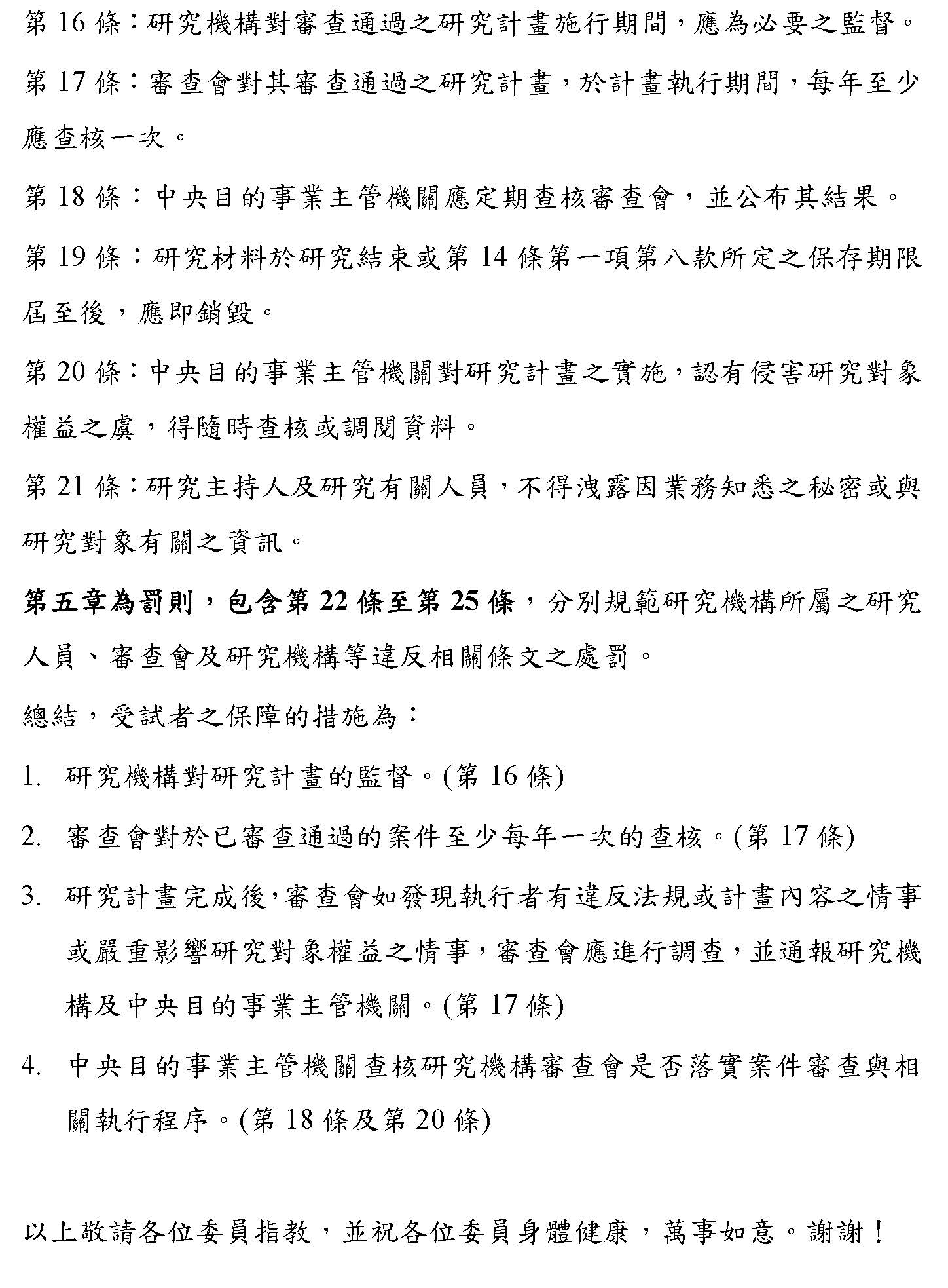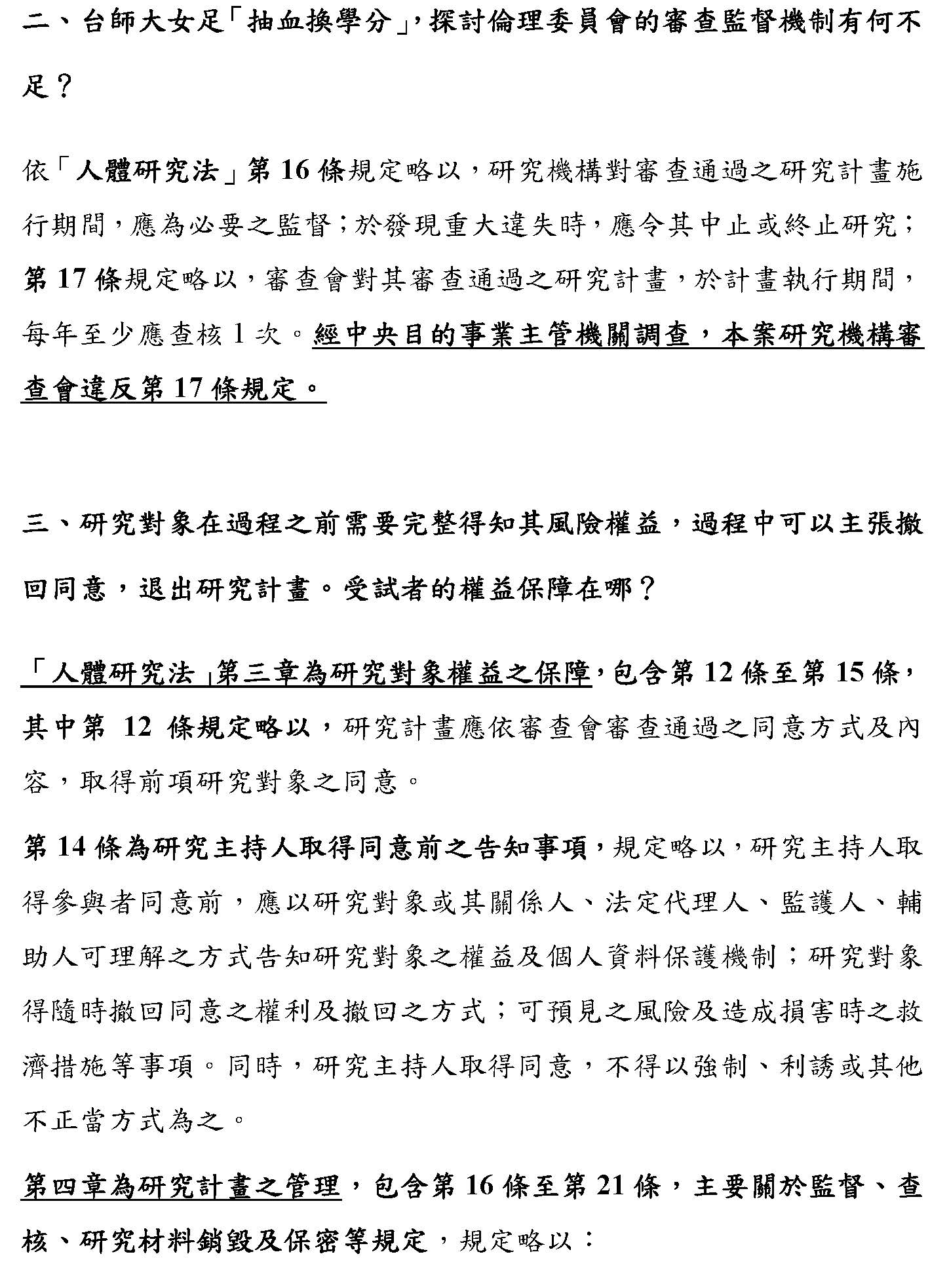 第二個部分,也請主席再給我一個時間,我再針對今天的提綱有提到這次臺師大相關抽血案的幾個部分,在這邊補充,把一些相關的法令跟各位做個報告。第一個部分,其實在人體研究法第五條跟第六條都有規定,研究主持人在實施研究之前,必須擬定計畫,經過倫理審查委員會審查通過才可以為之。這些研究計畫必須要載明下列事項,包含:一、計畫名稱、主持人及研究機構;二、計畫摘要、研究對象及實施方法;三、計畫預定進度;四、研究對象權益之保障、同意之方式及內容;五、研究人力及相關設備需求;六、研究經費需求及其來源;七、預期成果及主要效益;八、研發成果之歸屬及運用;九、研究人員利益衝突事項之揭露。另外,在人體研究法也訂定了研究對象權益保障,第十四條第一項第六款跟七款有載明研究主持人取得同法第十二條之同意前,應以研究對象或其關係人、法定代理人、監護人、輔助人可理解之方式,告知研究對象得隨時撤回同意之權利及撤回之方式,以及可預見之風險及造成損害時之救濟措施。這個部分當然今天也有很多的先進提到,在相關的研究主持人跟被研究對象之間,有權利義務不對等的情況,其實在人體研究法裡面就有特別提到,它其實在人體倫理試驗審查的過程中,事實上就應該要被討論,也應該要在這個過程要求主持人確保不對受試者的權益造成剝奪,這是第一個部分。