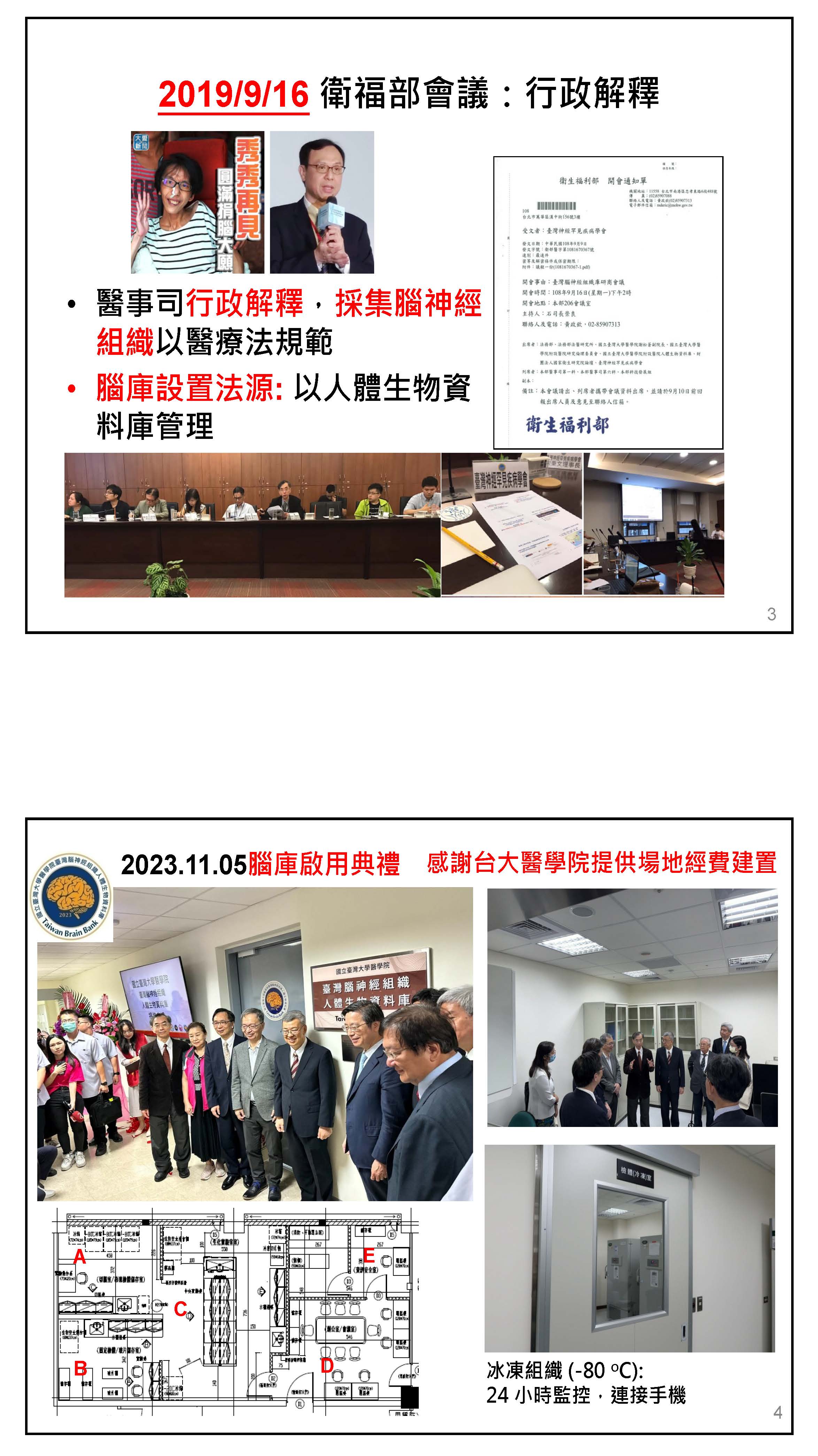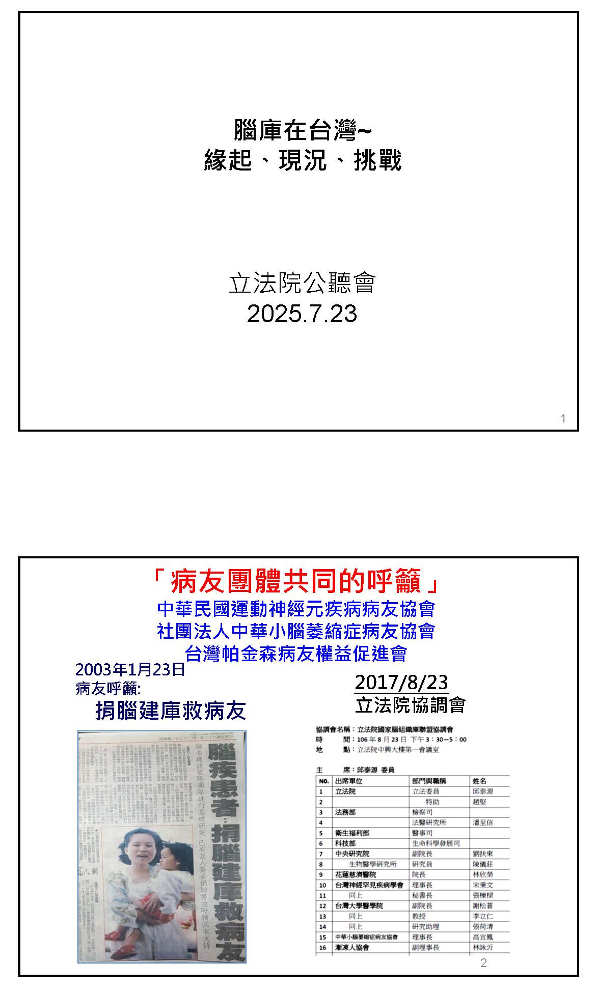 我再來分享另一個個案,這個個案沒有放在簡報資料裡,是一位83歲的媽媽,她嫁進夫家後,公公就生病臥床,她生了4個孩子,先生後來也生病臥床,她跟我分享她過去必須要靠雙手來養全家9口人,她的雙手是做什麼?幫人家洗衣服,她才能夠養活全家9口人。在那樣艱苦的歲月裡面,她先生後來也過世了,她很奮力的把孩子培養到大學畢業,結果沒想到孩子在25歲進入銀行上班後,老大也發病了,老二、老三、老四也陸續發病,這一個有婦德的媽媽、這一個有慈愛的媽媽,卻因為小腦萎縮症這個疾病的摧殘,使得這個家族就像被洪水猛獸、被毒蛇猛獸摧殘一般,這個家庭導致她人生的歲月裡飽受困苦。這位媽媽在兩個孩子過世之後,跟著剩下的兩個孩子,但一個已經臥床,一個行動不方便,這位83歲的老媽媽現在罹患失智症。其實失智症跟我們這三個神經退化性疾病的團體一樣,也跟我們所有在座的每一個人、每一個家庭息息相關,因為現在是高齡化的社會,每一個家庭都有可能面臨失智症,腦庫的建立,運用腦庫進行藥物的研發就更不可退卻了。我們一直呼籲政府要建立腦庫,2017年8月份立法院有一個協調會,終於在2019年,衛福部通過行政解釋來採集腦神經組織設置腦庫,經過了4年,腦庫終於在臺大醫學院提供場地還有經費之下開始啟用了。