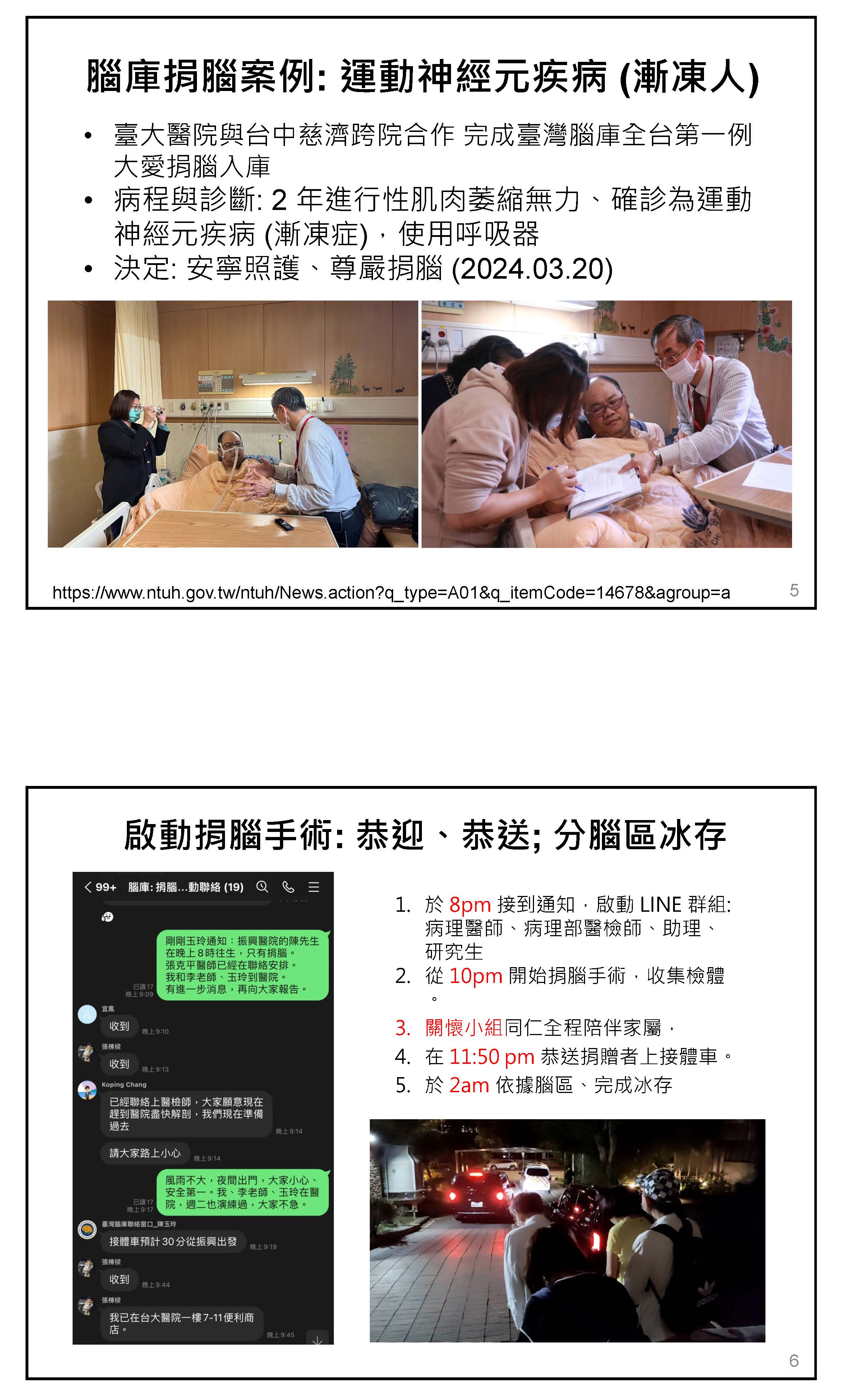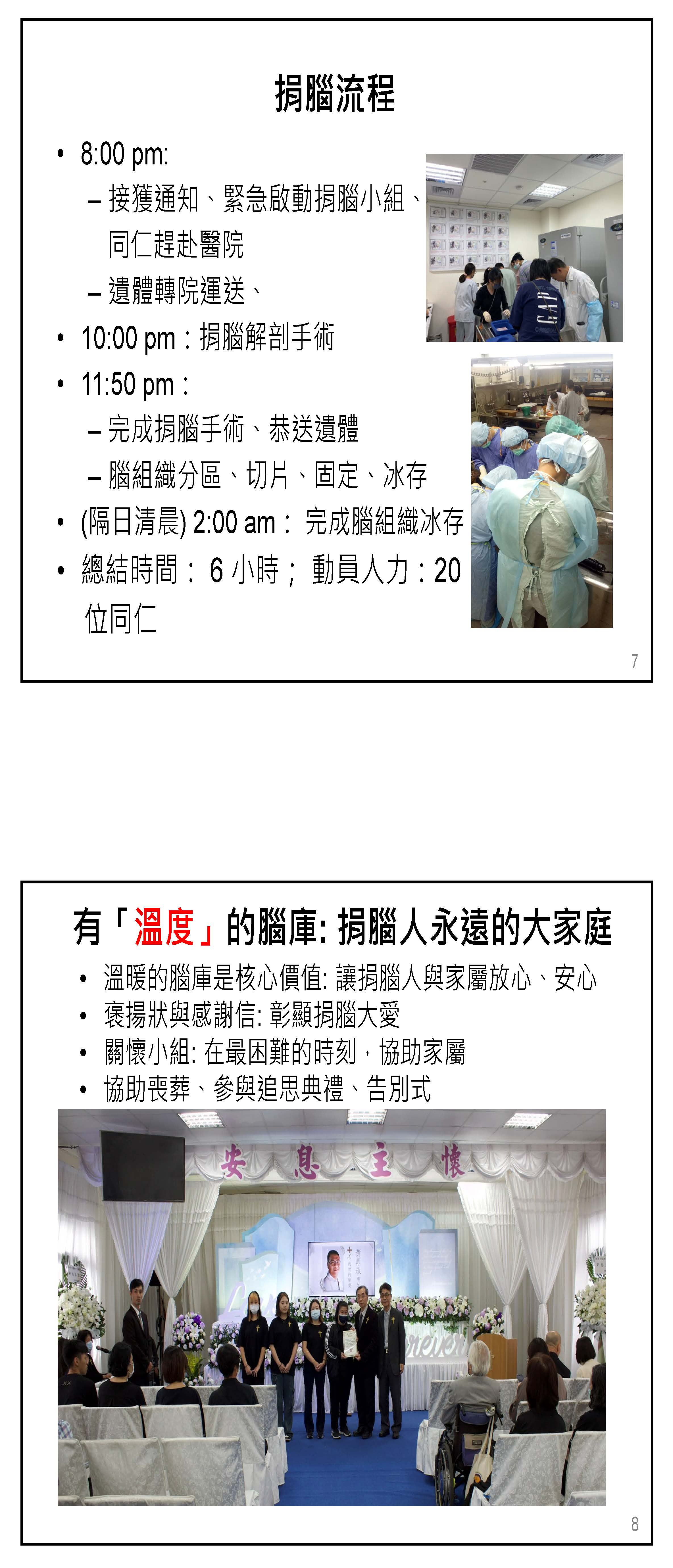 這個案例是捐贈者簽署同意書,還有家屬也要同意。這個是在一個颱風夜晚上8點,振興醫院通知臺大病理部,有一個病人過世了,他要捐腦,10點就送到解剖室,大家都趕往臺大醫院,關懷小組也全程陪伴他們家屬。將近晚上12點的時候解剖完成,把捐贈者的遺體送上接體車,然後到了晚上他們要把腦再送到腦庫裡面去,工作人員再花2個小時做切片、固定跟冰存,總共動員20個人力,這個捐腦的過程大概花了6個小時,我們也會經過家屬的同意去參加追思典禮跟告別式。