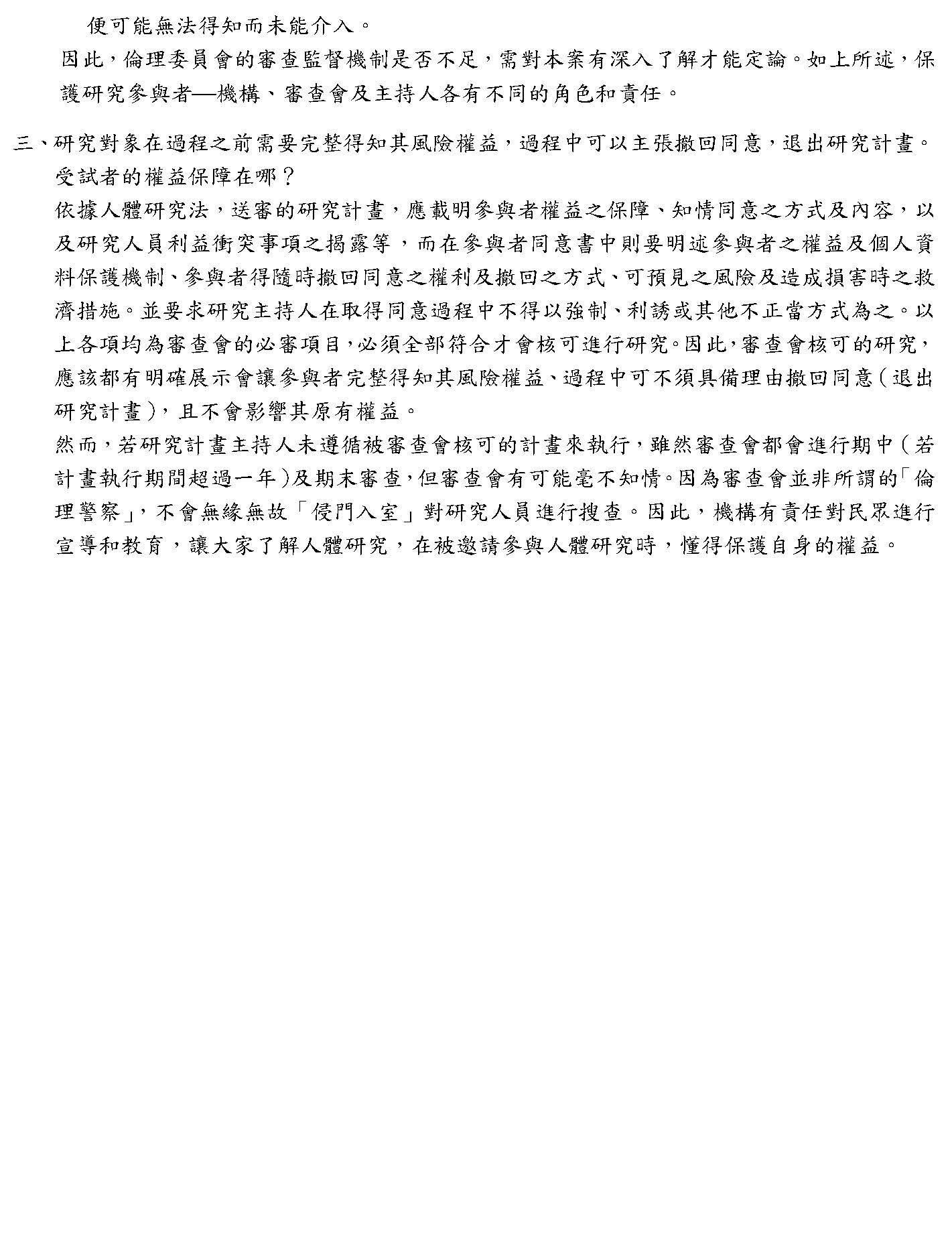 基本上,在對人體具一定傷害性下要阻卻其違法,那麼充分告知也非常重要。當然,就個案來說,有關充分告知是不是應該在IRB審查時,其內容、形式、格式都應該要有完整妥善的規範?這其實是我們比較希望能夠看到的部分。所以IRB在審查時,不僅要做書面審查,人體研究法第七條亦有規定其組成,惟其組成並未要求必須由醫療專業人員進去,我們覺得這是人體研究法中比較遺憾的部分。爰此,是不是應該針對這部分加強?就算不屬於醫療業務或醫療輔助業務,還是應該非常慎重。
