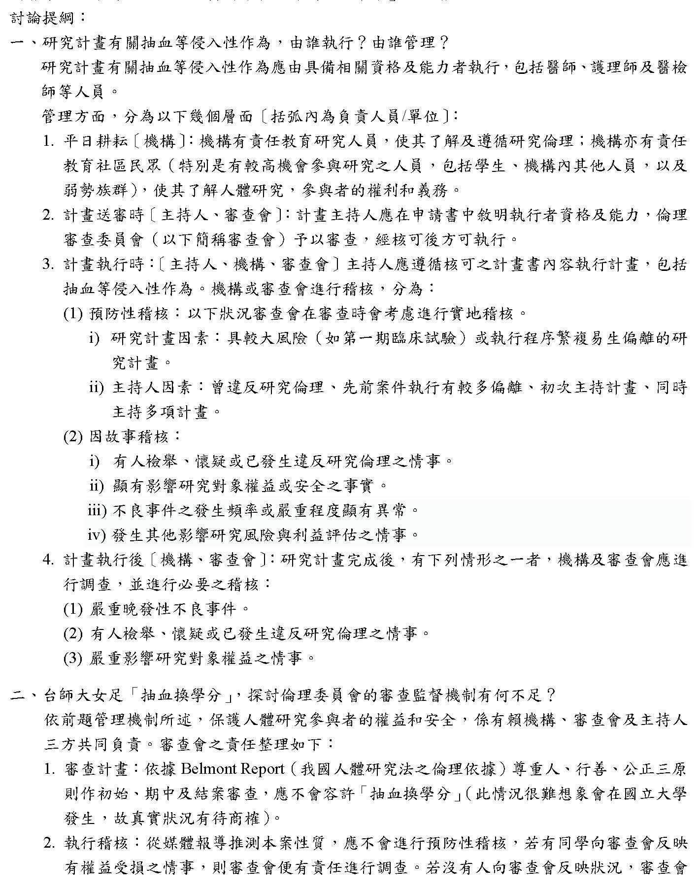 備受爭議的臺師大的事情,在社會引起對學術倫理的廣泛討論,更凸顯了研究倫理委員會在審查監督機制上潛在的不足,我們在這個事件中看到研究計畫、學生的抽血等等,衛福部的看法跟教育部的看法又有一點出入,所以我們要嚴肅的思考這類作為是由誰來核准、誰來執行、過程中由誰來管理跟監督。更重要的是,受試者是學生,這個族群是最容易受傷害的,如何確保他們在研究過程中充分知道風險跟權益,並且能夠在任何時候主張撤回同意、退出研究計畫,這些都是他們的權利,不受任何的影響,這些都是我們保障受試者權益的關鍵環節。
