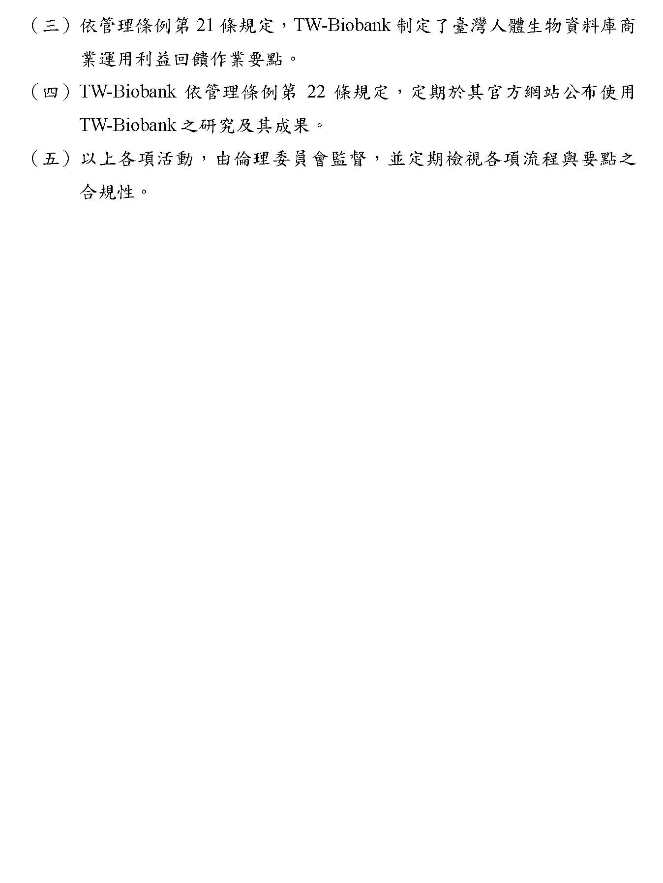 最後,關於資料庫的運用方面,我們依據管理條例第十八條,TW-Biobank所釋出的僅限於研究用的生醫資料,所有可辨識的個人資訊,例如姓名、身分證字號等等,都不會釋出,而且這些資訊會以加密的方式存放於沒有連網的主機,而提供給研究人員的檢體跟資料都會以隨機編碼的方式來處理。此外,根據同法第十九條、第二十一條和第二十二條,我們訂定了利益衝突迴避、商業運用利益回饋等相關規範,而且在官網定期公布使用狀況和研究結果。