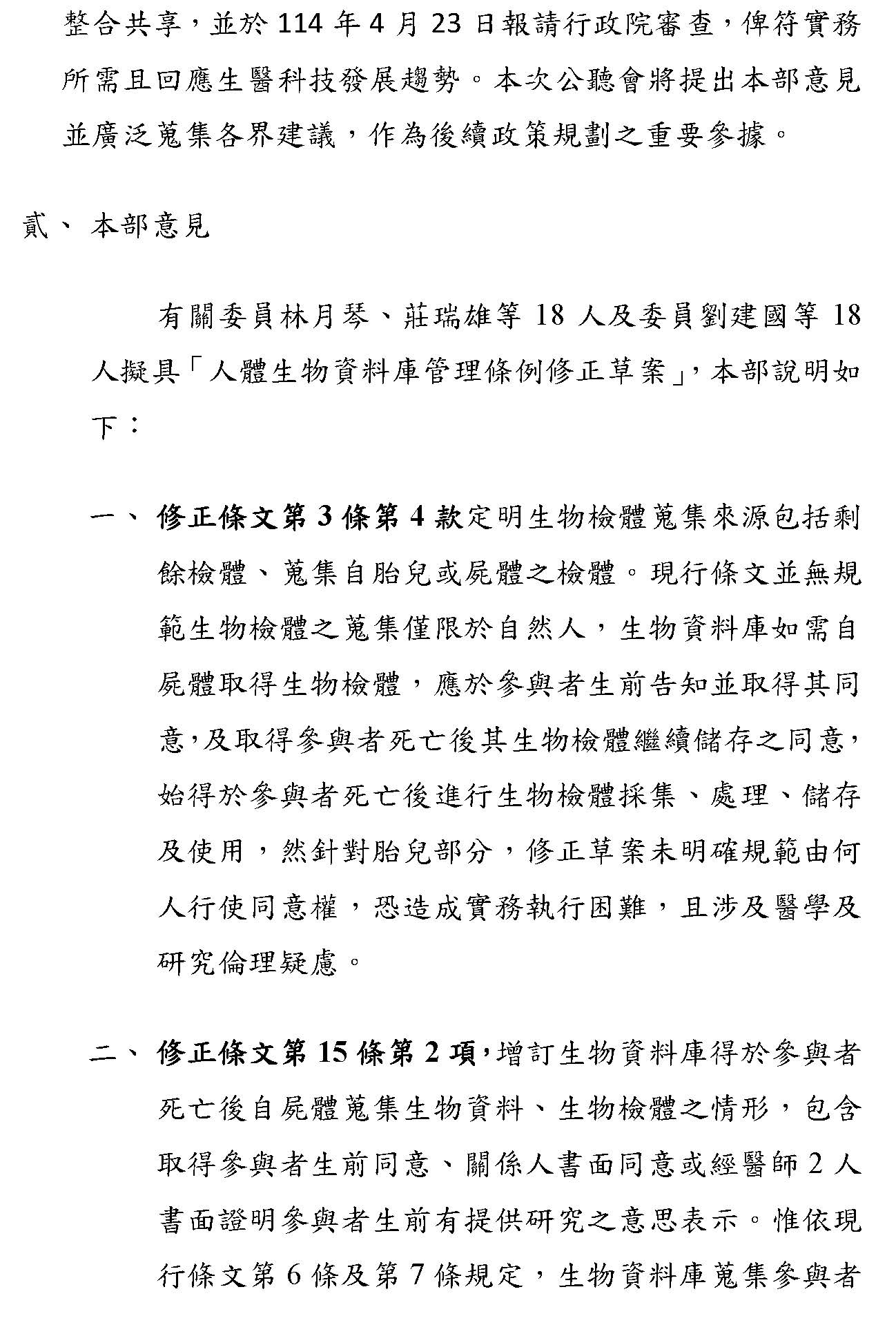 有關委員林月琴、莊瑞雄等18人及委員劉建國等18人擬具「人體生物資料庫管理條例修正草案」,本部說明如下: