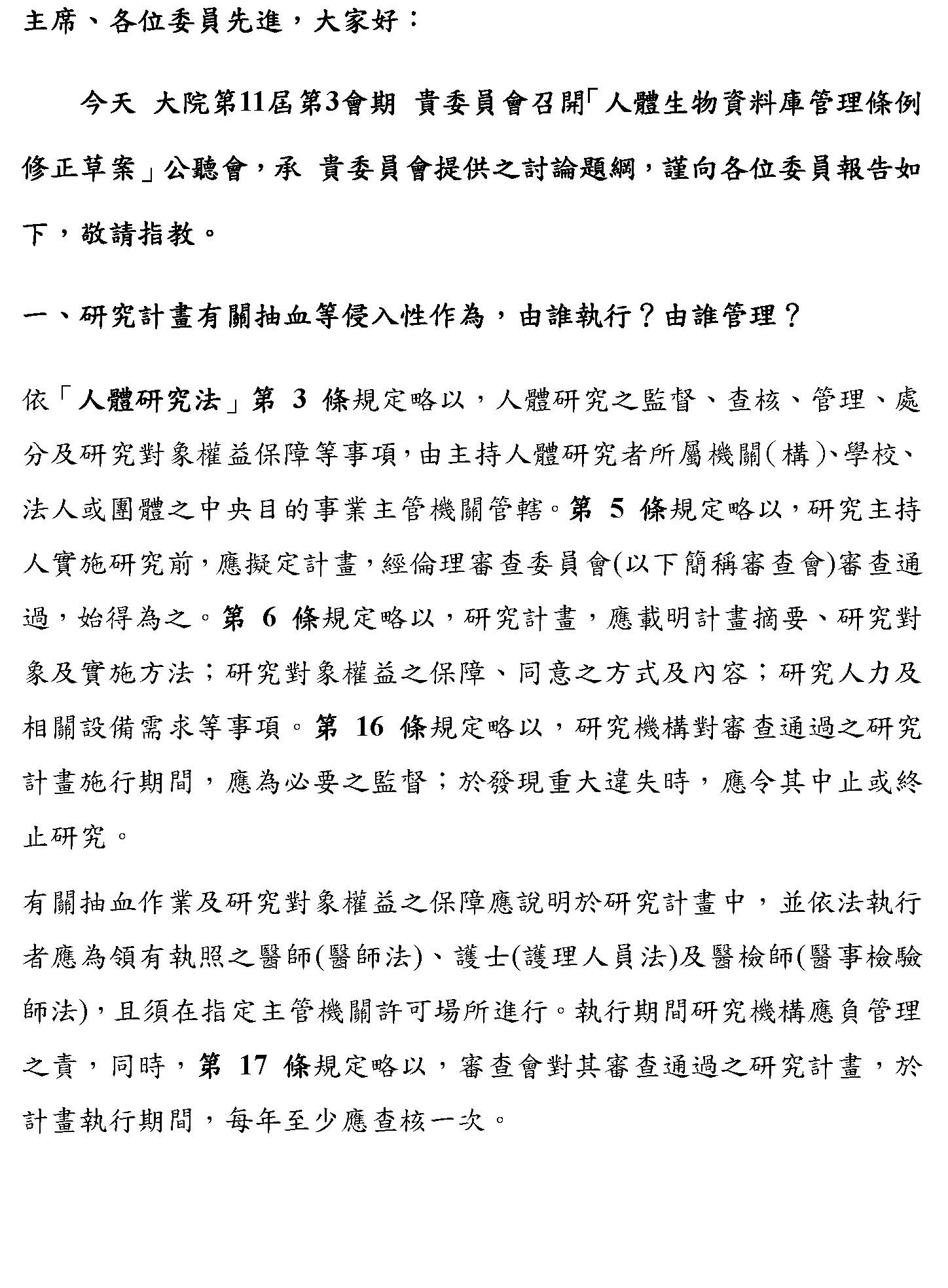 有關人體生物資料庫管理條例修正草案的部分,謝謝專家學者能夠針對這個需求,提出未來修法的相關依據或者是有哪一些需要再擴展的部分。可是從提綱來講,其實就只有兩個重點,就是針對臺師大這個個案,一個是抽血本身對受試者的影響,第二個是有關受試者的保護如何能夠更嚴謹。