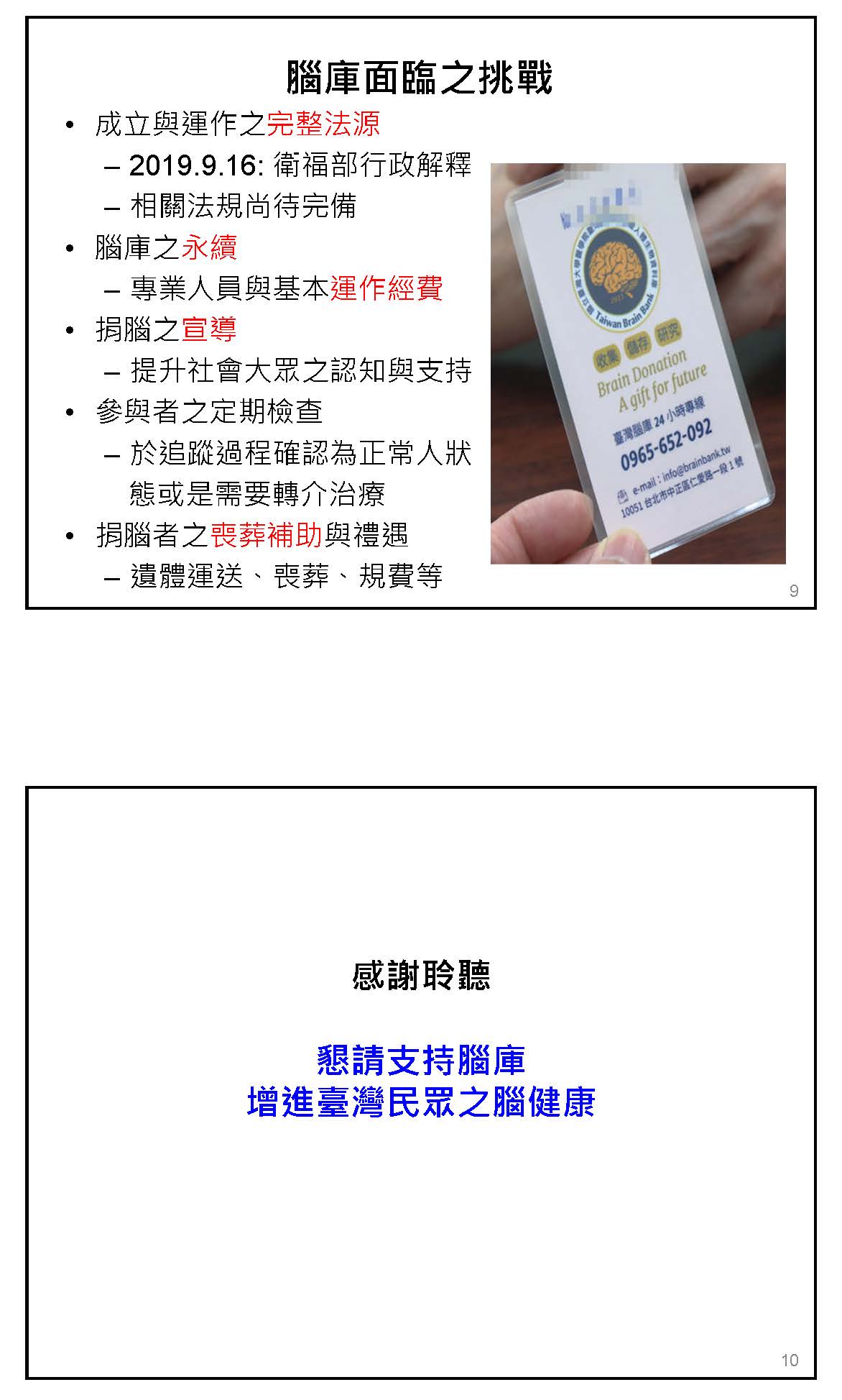 腦庫面臨最大的挑戰就是完整的法源,因為它是衛福部的一個行政解釋,法規尚待完備。因為腦庫需要永續經營,運作的經費其實有別於一般的生物資料庫,參與者的定期檢查跟遺體的運送及喪葬補助,其實都牽扯著腦庫對於捐贈者的一些補助,所以我們期待衛福部在運作經費上面,能夠提供有別於一般生物資料庫的經費。為了增進臺灣民眾的腦健康,懇請支持腦庫,感謝。以上。