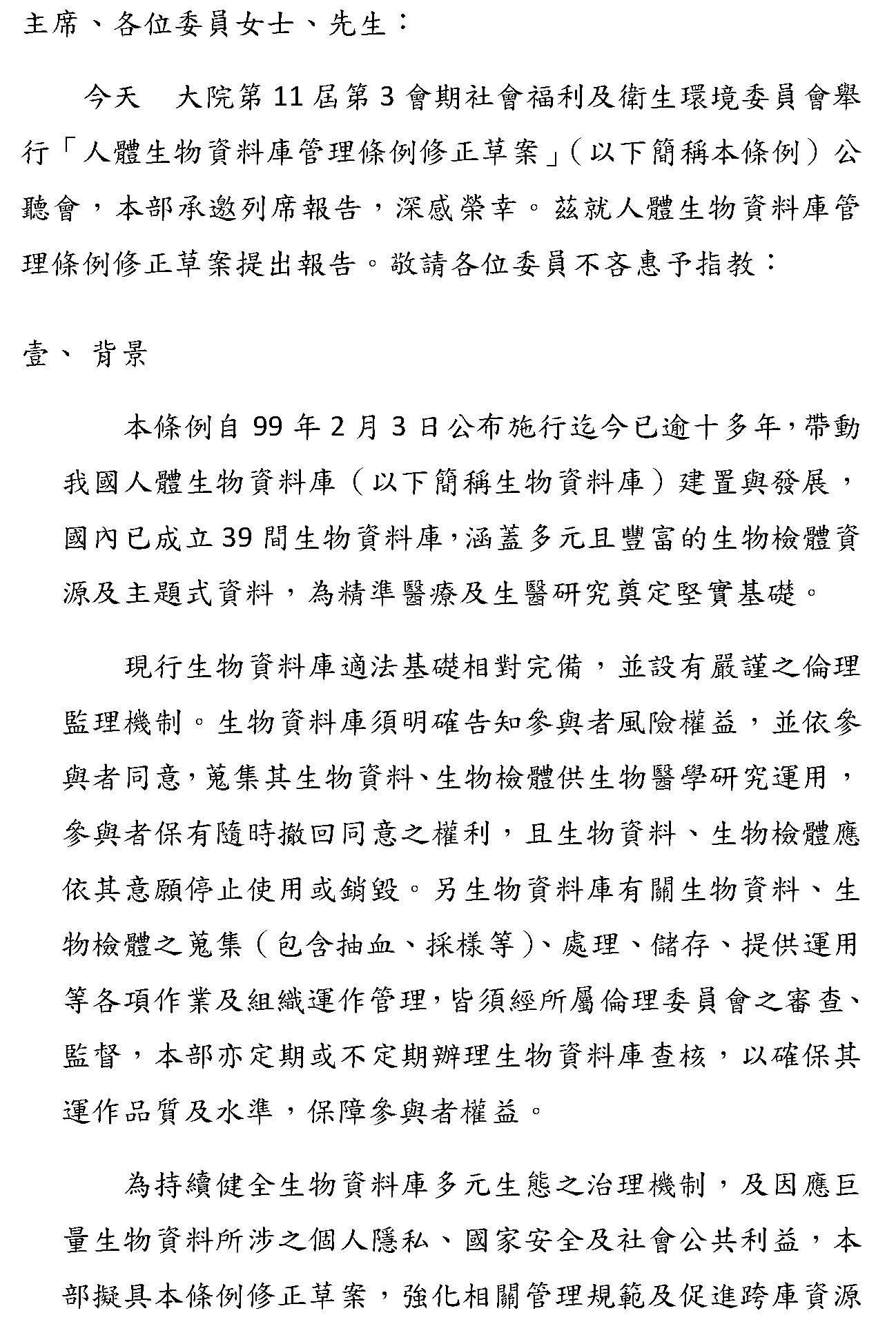 林次長靜儀:謝謝主席、各位委員女士、先生。今天大院第11屆第3會期社會福利及衛生環境委員會舉行「人體生物資料庫管理條例修正草案」(以下簡稱本條例)公聽會,本部承邀列席報告,深感榮幸。茲就人體生物資料庫管理條例修正草案提出報告。敬請各位委員不吝惠予指教: