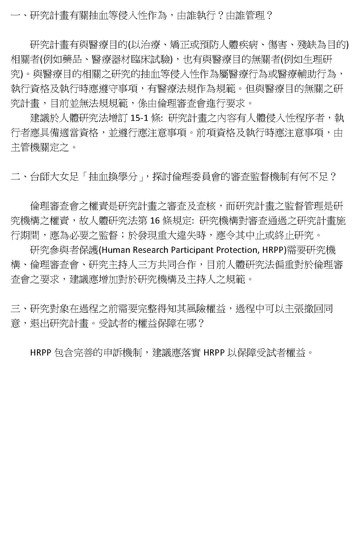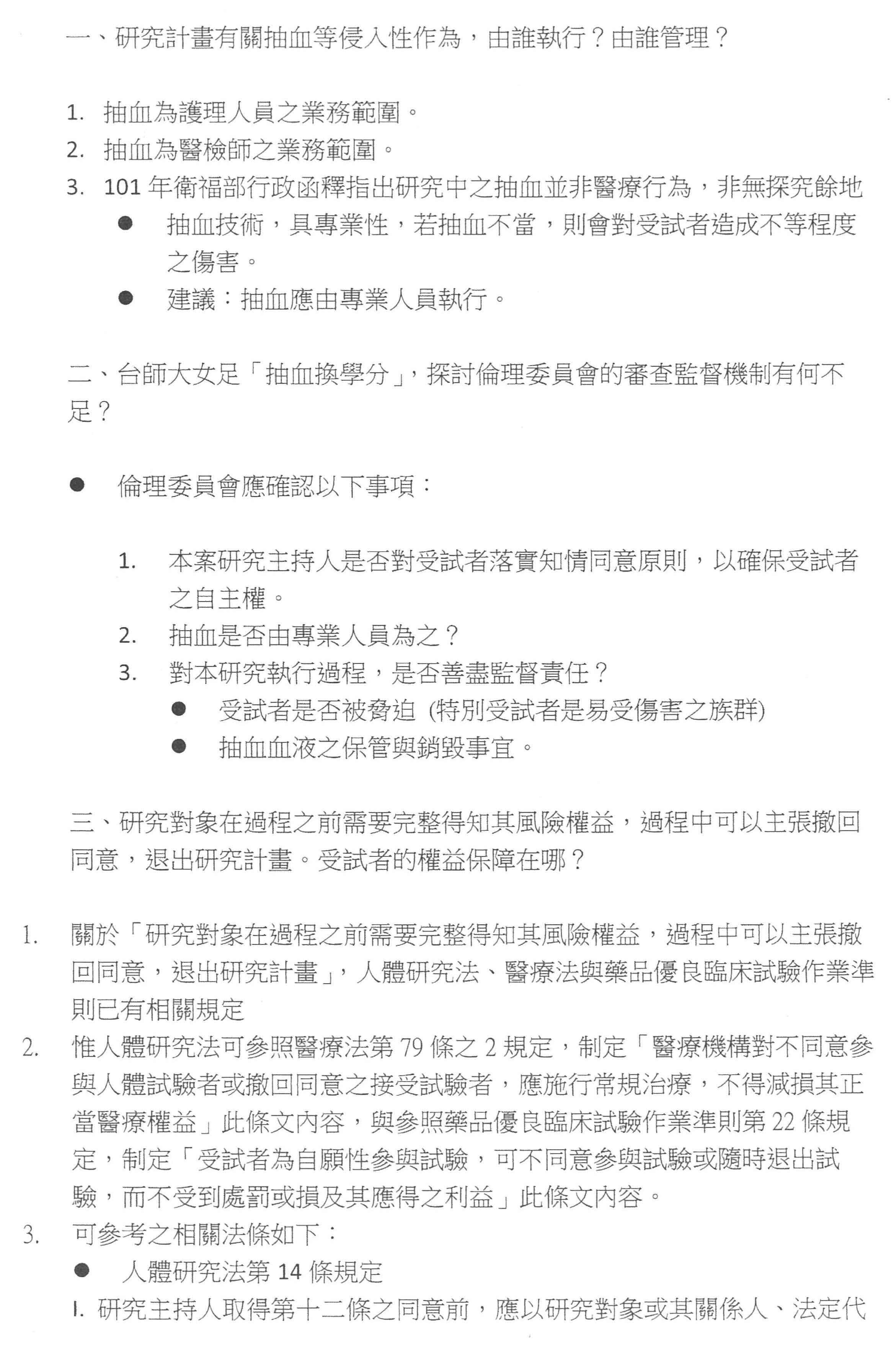剛剛委員有提到權力不對等的狀況,對於提綱二的部分,就是抽血換學分,我有一個小小的建議,就是在一個功能很健全的IRB審查過程中,我其實可以看得出來,老師請同學來抽血,這個部分是一個權力不對等的好例子,所以我們必須在審查過程中強烈的提出來,你如何去解除權力不對等這件事情,這是當他在簽知情同意書時的一個策略,那個策略其實要提出來的,我想到以前是學生的時候,老師請我做這件事情,我要如何去拒絕,這是在簽同意書的時候,後面要附帶讓他知道什麼時候可以抽離這個計畫,然後當你覺得不舒服或怎麼樣的狀況之下,是可以馬上停止的,就等於有一個投訴的機制,就像性別平等委員會的概念一樣,他可以立即去反映,同學才不會拖到這麼多年以後,因為他不知道什麼時候可以說不。