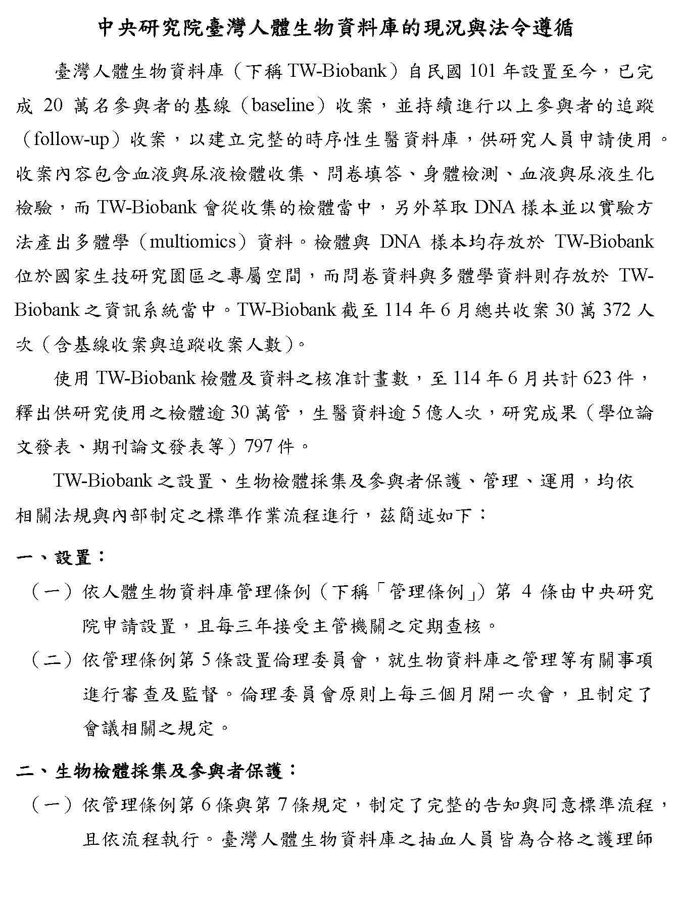 楊代表人懷壹:謝謝主席。主席、各位委員、各位長官以及各位先進,大家好。今天非常榮幸有機會代表Taiwan Biobank(下稱TW-Biobank)來這邊發言,首先要非常同意剛剛劉教授提到的,這是公眾信任、對於生物醫學研究的一個危機,但也因為有大院召開這個公聽會,所以是危機化為轉機。