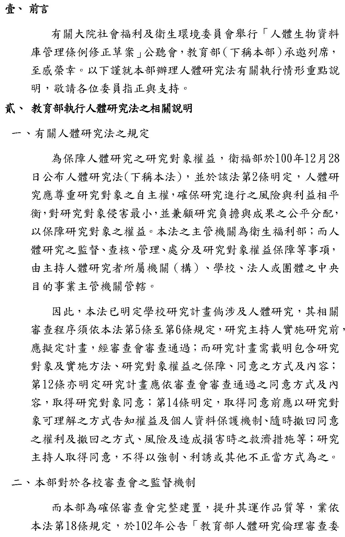 黃主任仲毅:主席、各位委員、各位長官以及各位先進,大家早。我過去大概參與了滿長時間的受試者保護相關工作,包括體制的建立,我也必須先揭露我是師大畢業的,所以有利害關係,不過今天的發言應該不會特別針對個案。