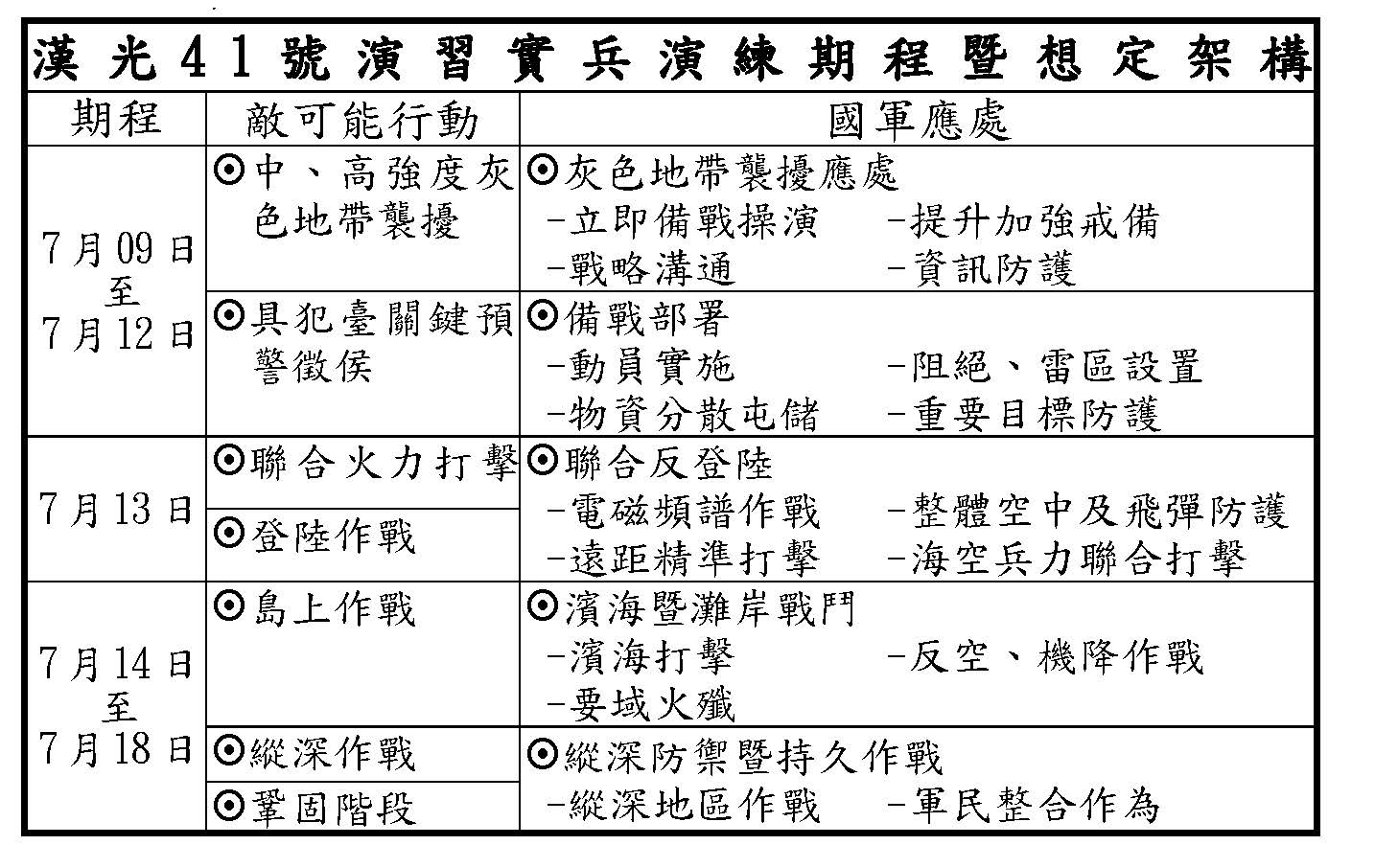 國軍依共軍犯臺關鍵預警徵候,於7月9日至12日間,漸次提升戰備等級至二級、一級加強戒備,三軍各級部隊異地同時執行人員召返,藉應變中心、指揮所發布作戰指導、授權矩陣及交戰規則,啟動戰備部署機制,並以心理及網路作戰部隊之戰略溝通與資訊防護行動,應對共軍輿論戰、心理戰及法律戰等3戰作為,完整演練平戰轉換及灰色地帶襲擾應處機制。