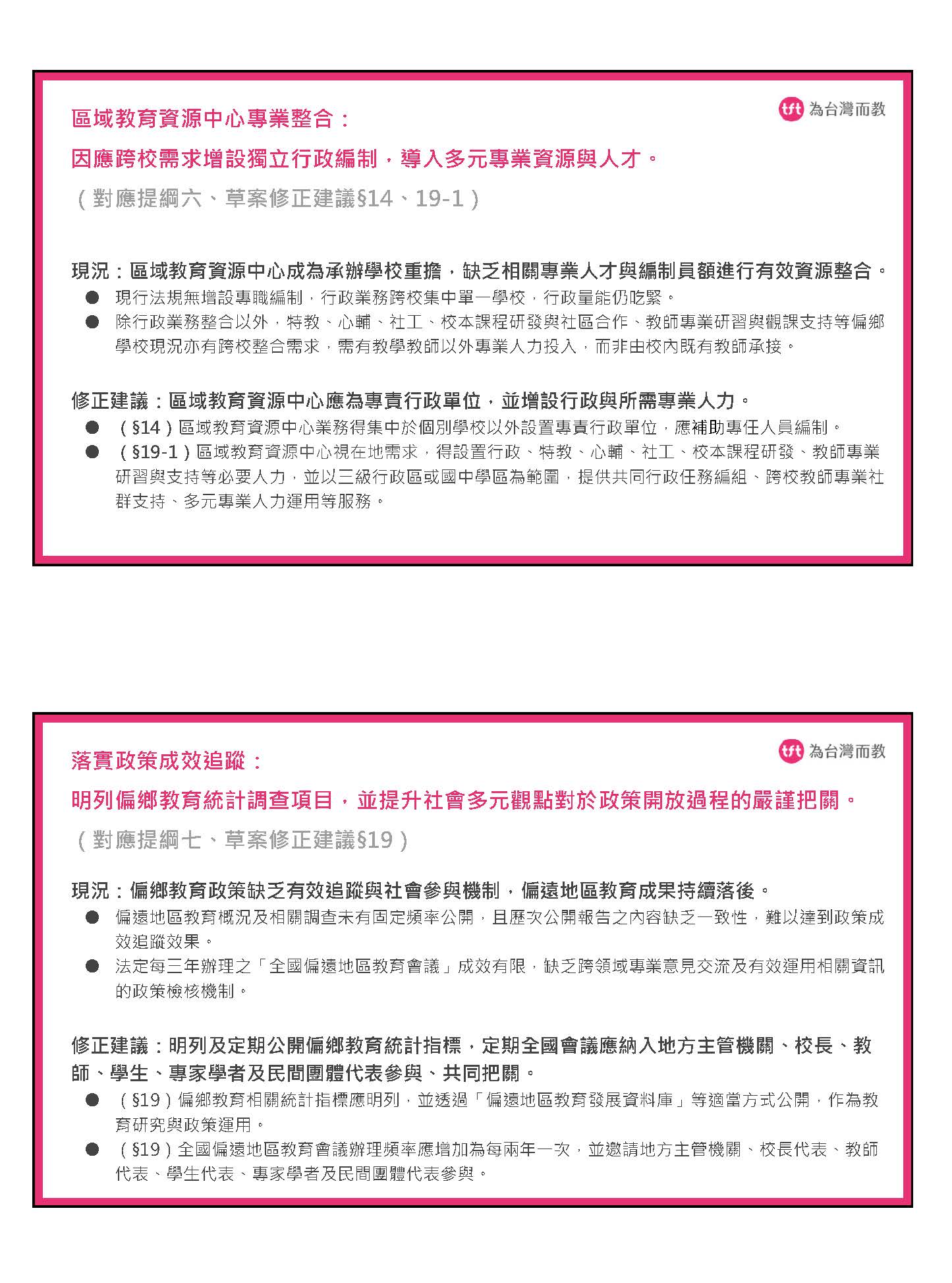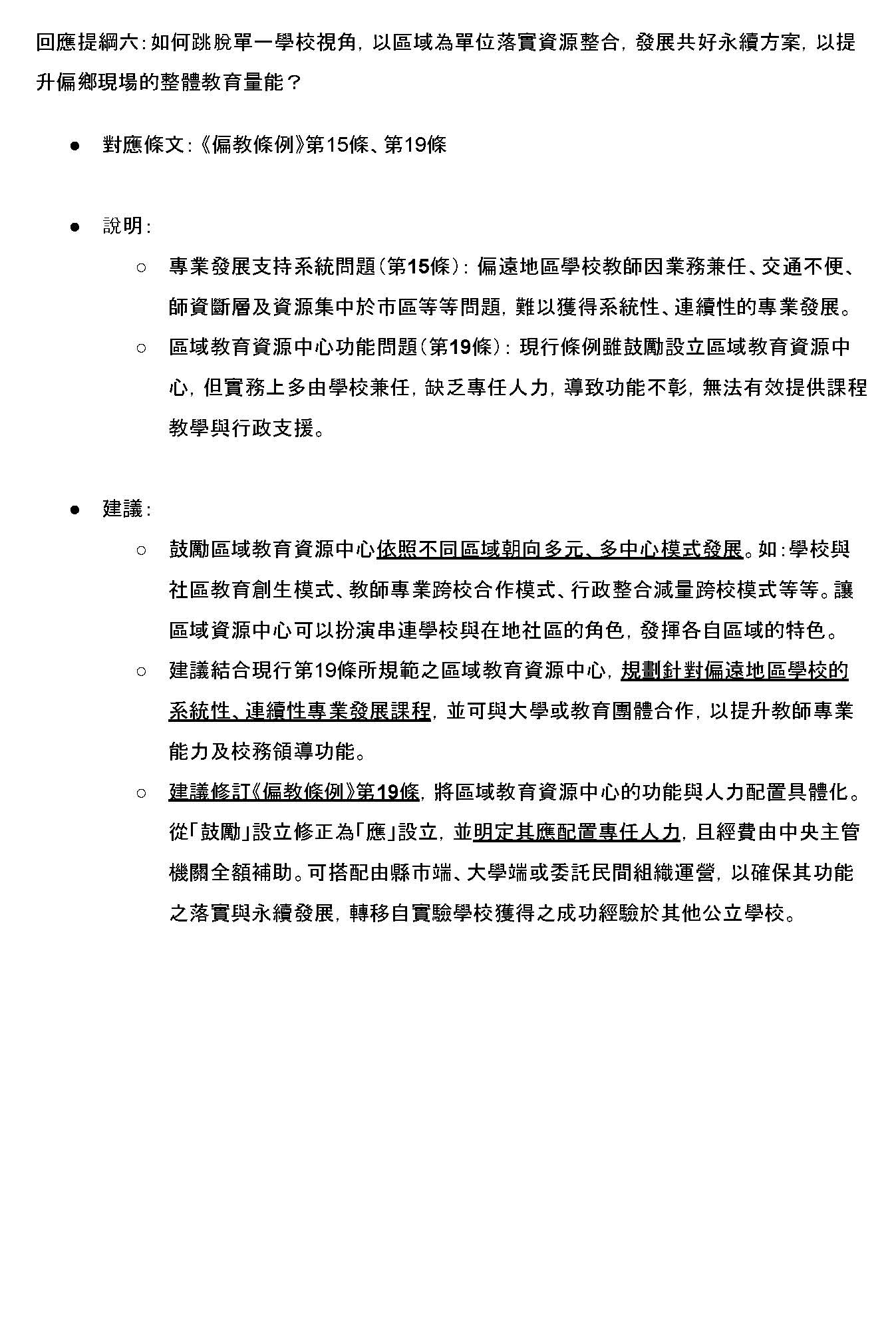 第二個是區域資源中心的整合,其實現在在條例中已經有,這對於偏鄉行政量能非常缺乏的學校是非常重要的,可是如果這個區域資源中心只是由既有承辦學校校內的校長或者是主任、老師來兼任,其實這是另外一個行政過量的開始,另外這裡面所需要的專業人才需求跟編制沒有辦法做有效的資源整合。所以我們會建議區域資源中心接下來應該可以設立一個專責的行政單位,無論在校內或獨立於校外的機構,以及透過特別經費去增設裡面所需要的行政跟專業人力編制員額,這是我們希望在區域資源中心可以去思考的。