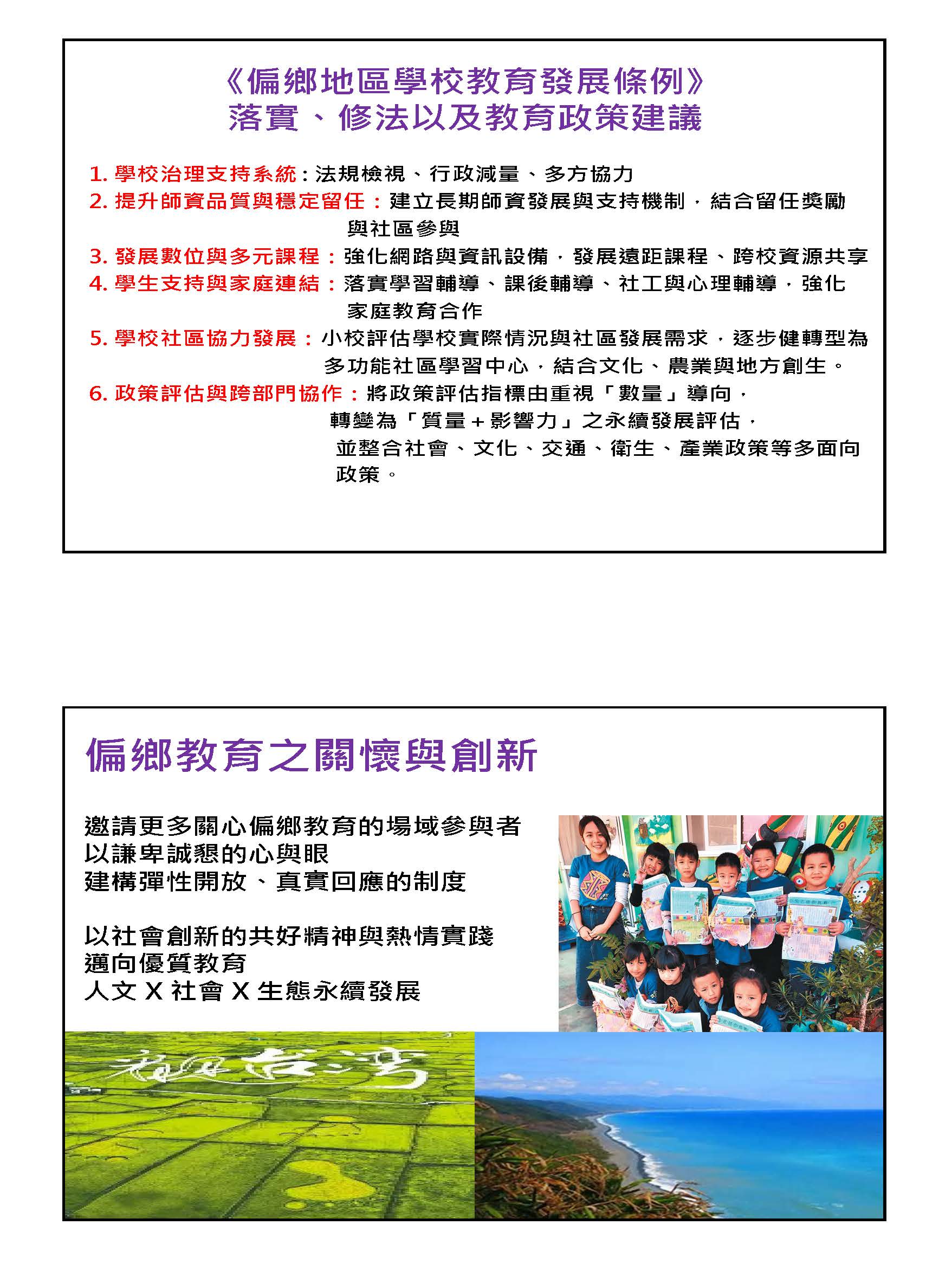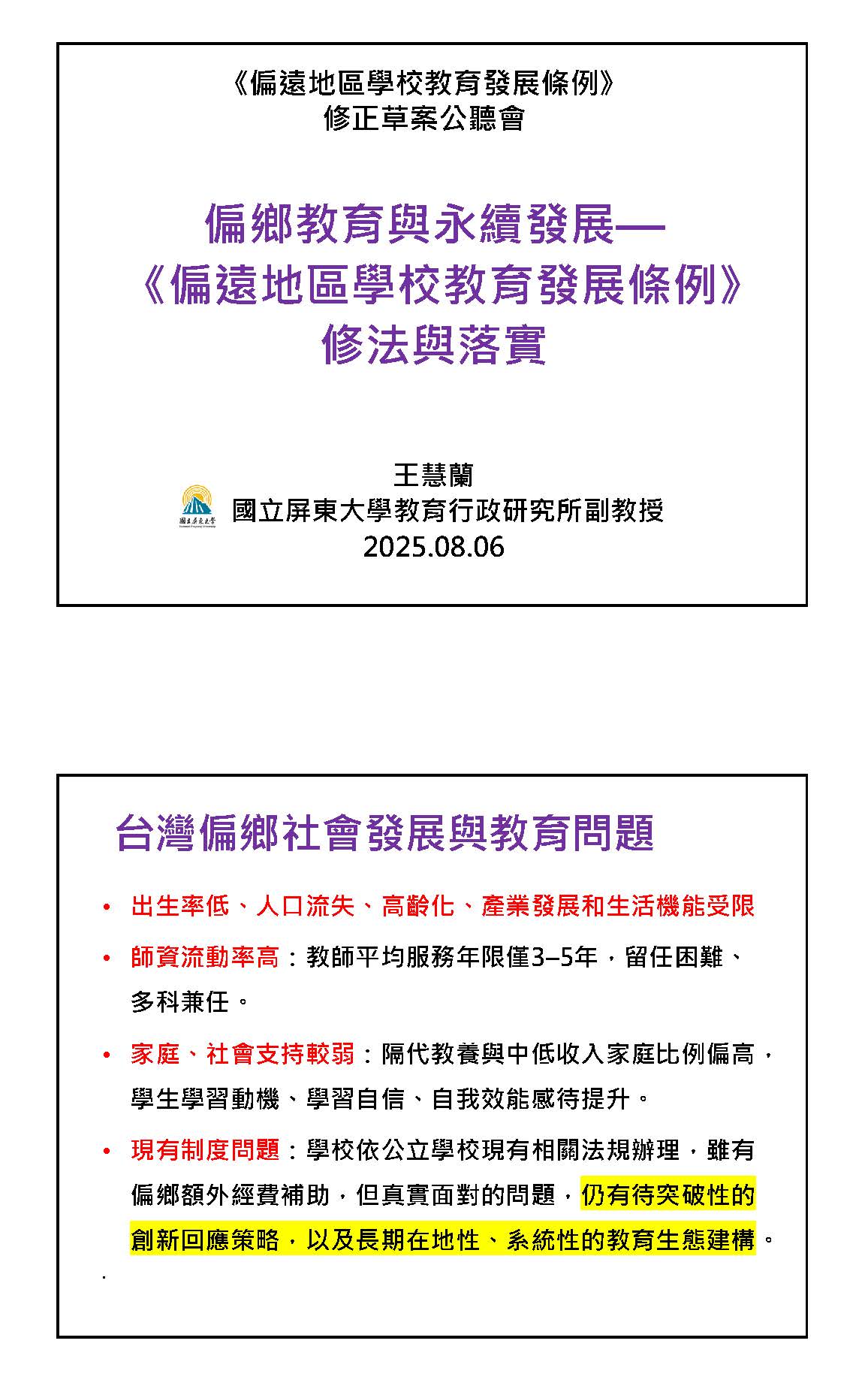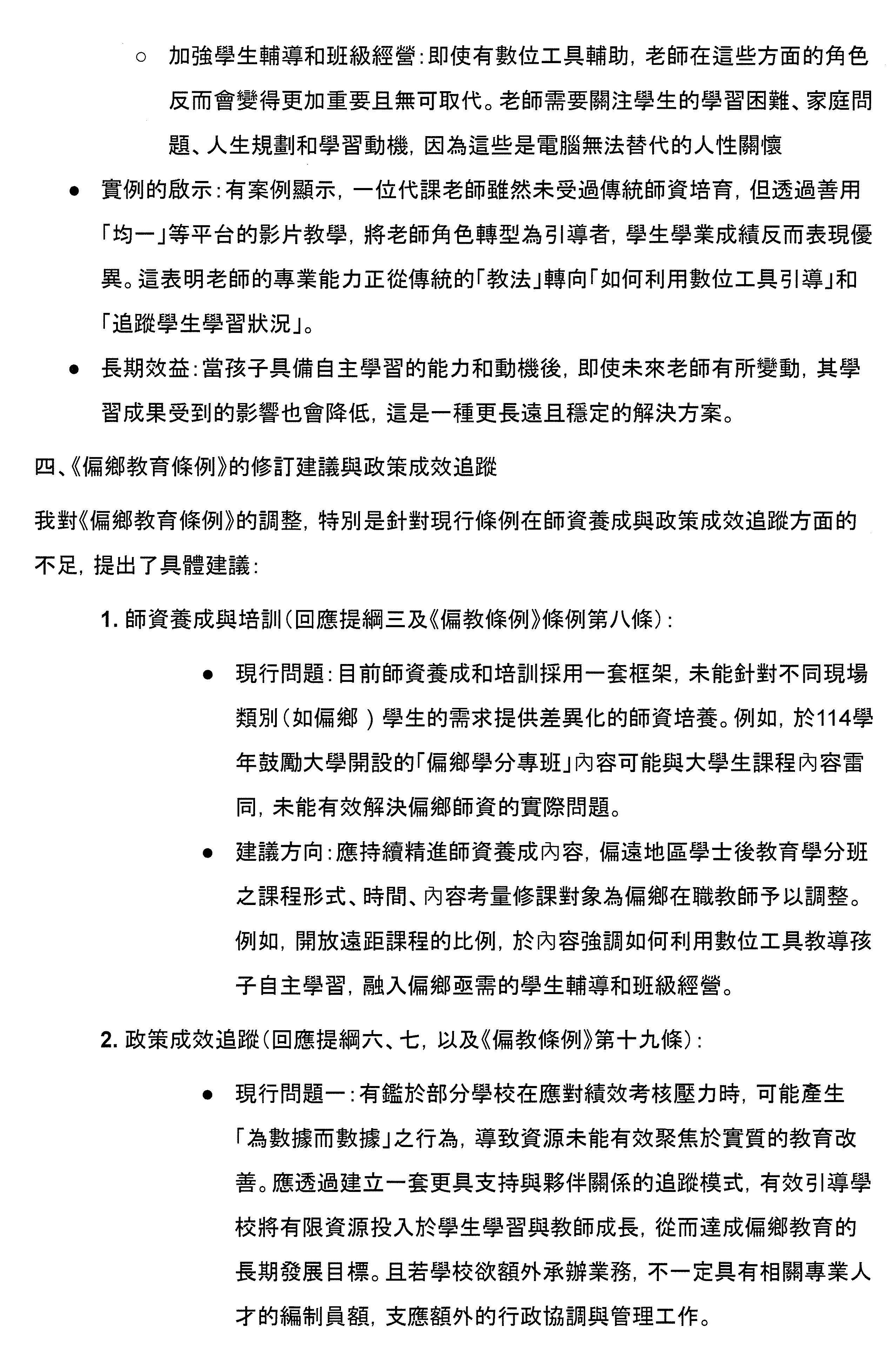8年前在訂偏鄉教育條例的時候,我也曾來參加過兩次公聽會,那時候鍾佳濱立委著力甚深。但是從去年開始,因為我在寫報告,我很注意立法院的立法院公報有關於偏鄉的一些意見跟看法,我非常擔心立法院把偏鄉教育條例給修惡了,所以我今年的期中報告出來之後,也分別傳送給三黨的立委及師藝司武曉霞司長作為參考。以目前的專聘教師而言,事實上就是在當年的公聽會當中,由當時的嘉義縣王建龍處長提出來的概念,我在8年前也撰寫了一篇小文章,今天也放在書面資料裡面,就是偏鄉師資優質才是關鍵。我前幾天拿出來看一看,其實目前還是一樣,該解決的問題沒有解決,大家還是想用舊方法來解決存在已久的問題,那當然是無解。我個人在偏鄉實地服務過5年,我從大學就開始擔任偏鄉的課業輔導,這十幾年來也在做偏鄉研究,目前是在做偏鄉師資的研究,我越發覺得偏鄉的問題其實就是師資的問題,師資解決了,其實其他問題也沒那麼大,臺灣的偏鄉其實也沒那麼偏鄉。
