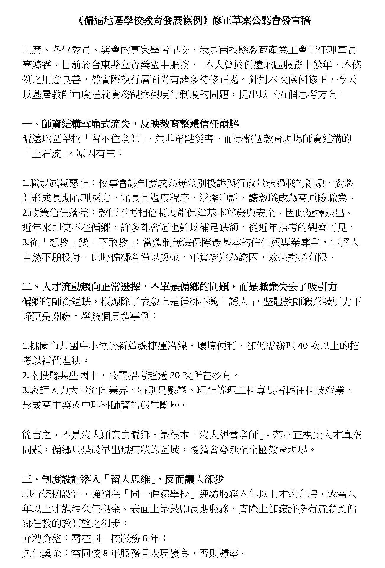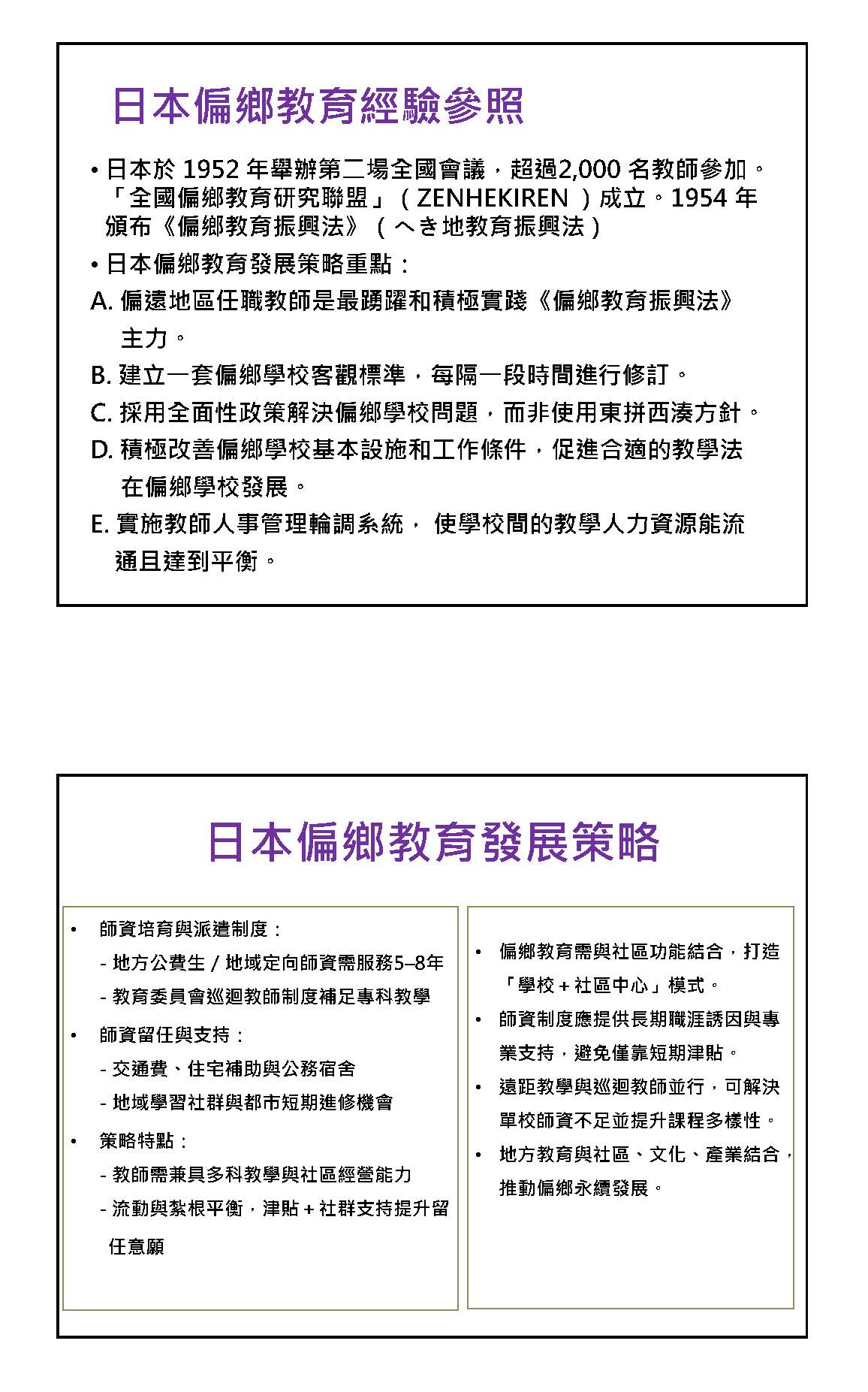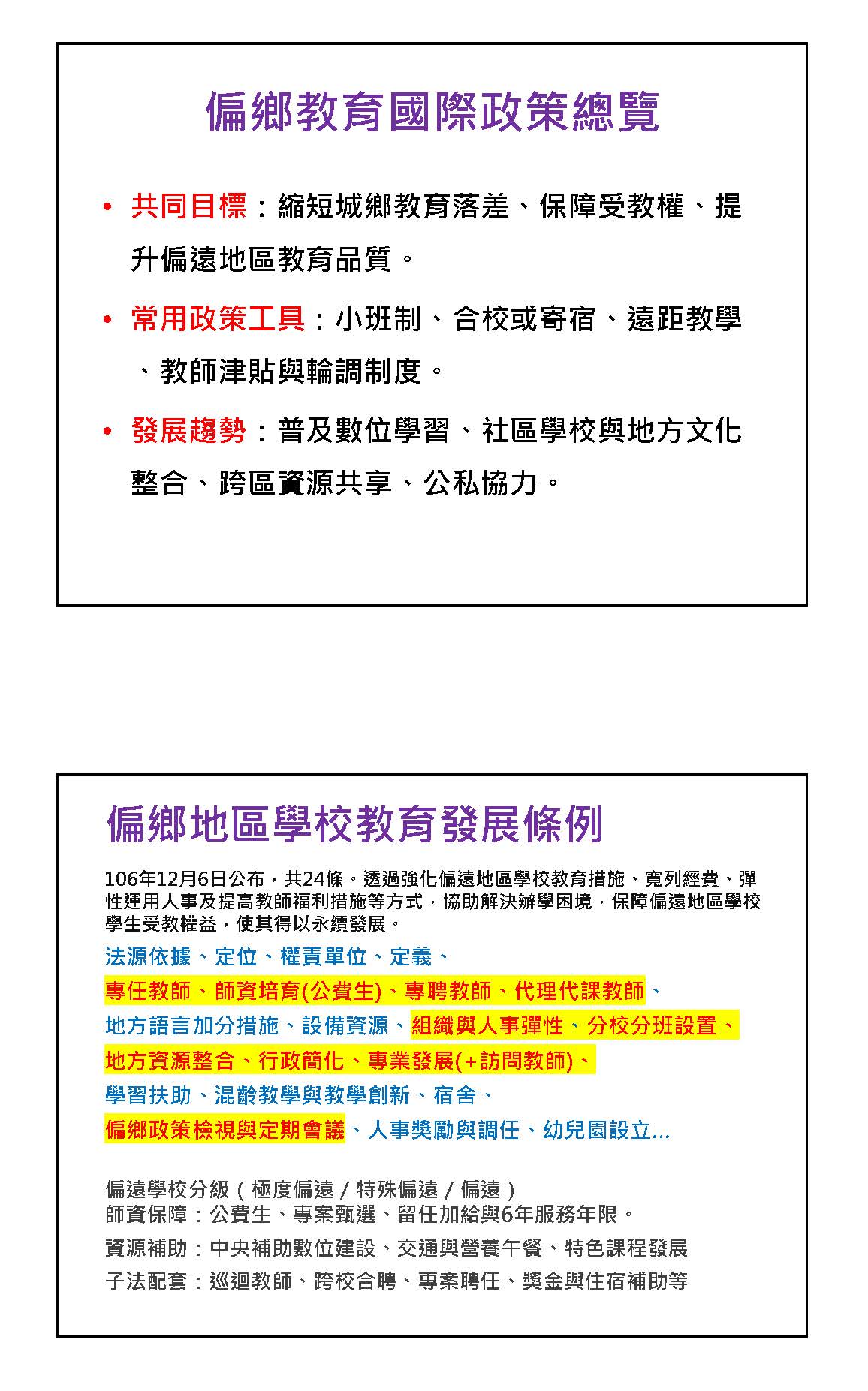 8年前在訂偏鄉教育條例的時候,我也曾來參加過兩次公聽會,那時候鍾佳濱立委著力甚深。但是從去年開始,因為我在寫報告,我很注意立法院的立法院公報有關於偏鄉的一些意見跟看法,我非常擔心立法院把偏鄉教育條例給修惡了,所以我今年的期中報告出來之後,也分別傳送給三黨的立委及師藝司武曉霞司長作為參考。以目前的專聘教師而言,事實上就是在當年的公聽會當中,由當時的嘉義縣王建龍處長提出來的概念,我在8年前也撰寫了一篇小文章,今天也放在書面資料裡面,就是偏鄉師資優質才是關鍵。我前幾天拿出來看一看,其實目前還是一樣,該解決的問題沒有解決,大家還是想用舊方法來解決存在已久的問題,那當然是無解。我個人在偏鄉實地服務過5年,我從大學就開始擔任偏鄉的課業輔導,這十幾年來也在做偏鄉研究,目前是在做偏鄉師資的研究,我越發覺得偏鄉的問題其實就是師資的問題,師資解決了,其實其他問題也沒那麼大,臺灣的偏鄉其實也沒那麼偏鄉。