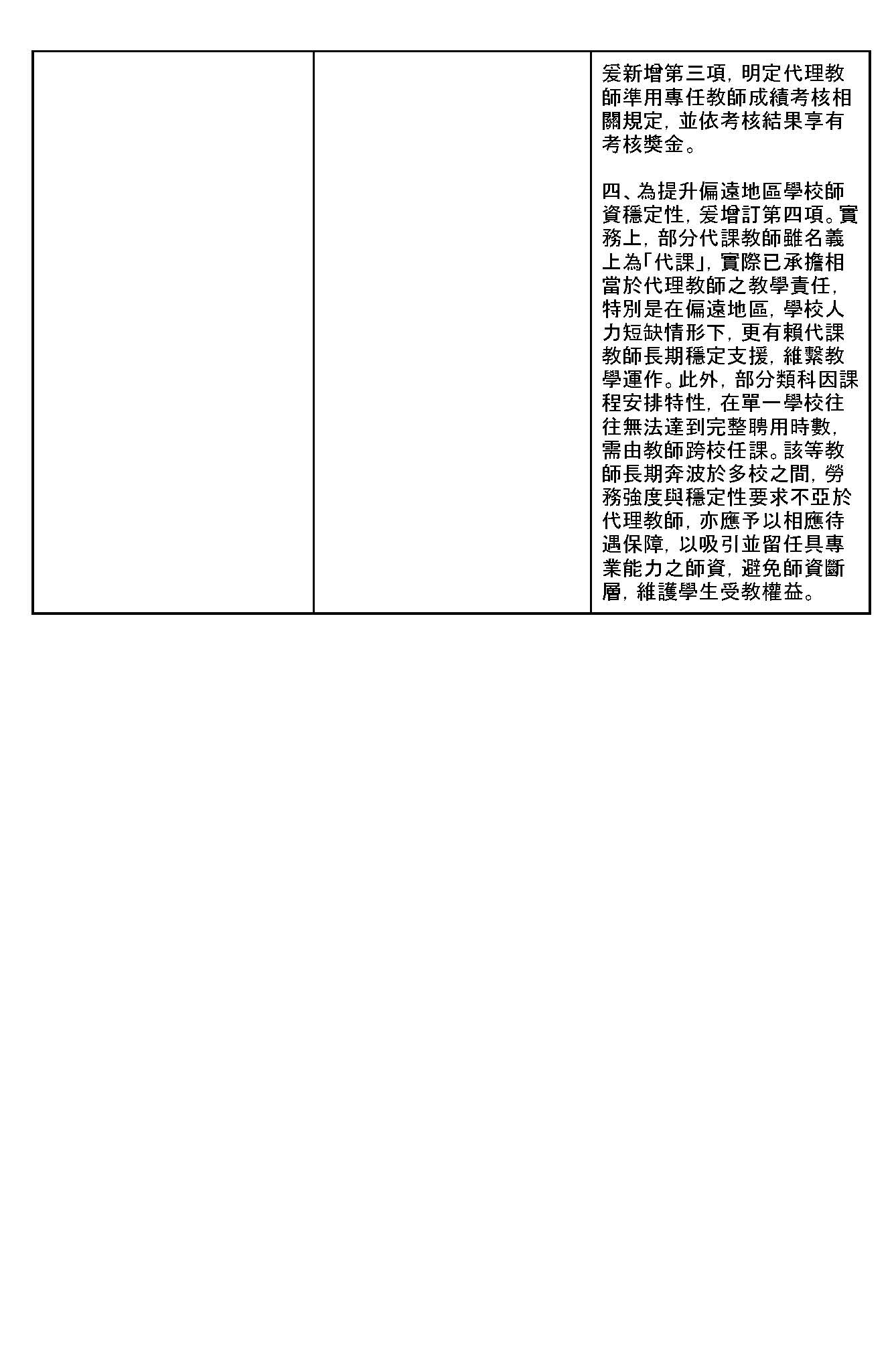 另外,在第八條的部分,關於代理教師的續聘跟偏鄉學士後的學分班進修,我得說,原本的條文在第七條的專聘教師能夠享有再聘,不限次數,結果符合的狀況幾乎不存在,但是配合第七條的開放規定,在偏鄉任教的代理只要經過校內決議,都能夠不受再聘次數的限制。