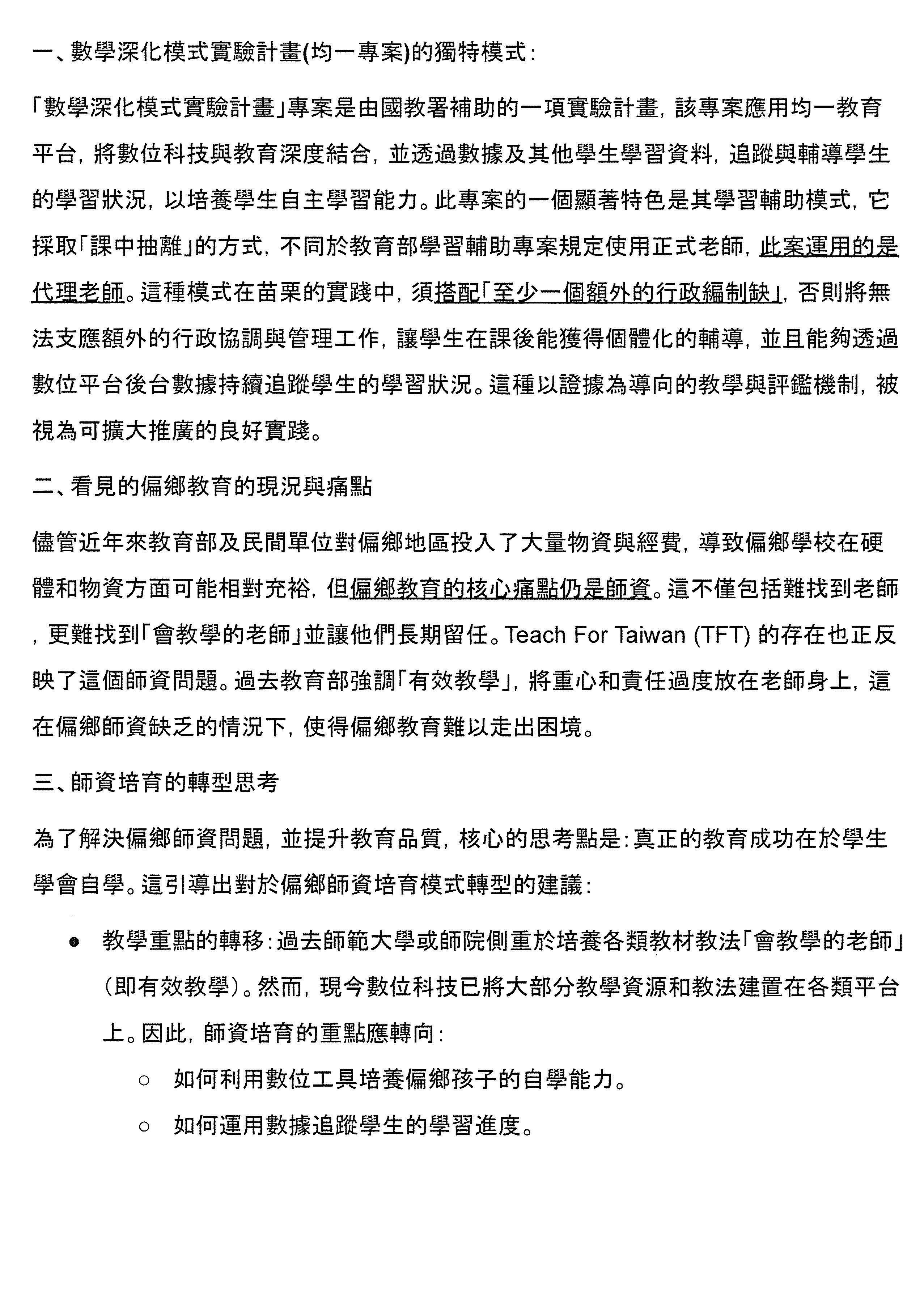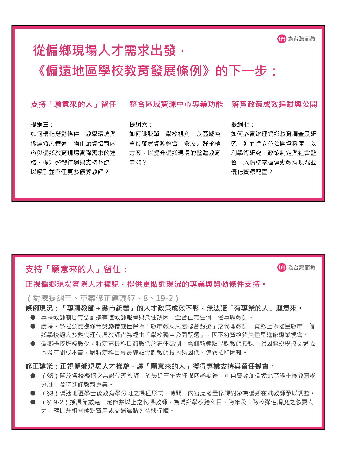 我們看到這個東西的重要性是因為我們都知道,一個老師進入偏鄉會遇到的文化衝擊、生活適應、教學困難,其實在他任教的前兩到三年是最劇烈也是最需要專業投入、支持的時候,如果在這時候他沒有這樣子的管道,對於在現場的任教品質、對學生的權益也是有很大的傷害。因此我們建議偏鄉條例的第八條應該要正視這樣子的實務現場人才樣貌,開放各校獨招的無證代理老師比照原本條例裡面三年內任滿四學期後,可以自費參加偏遠學士後專班的教育學分進修,讓他可以即時獲得他所需要的專業訓練。