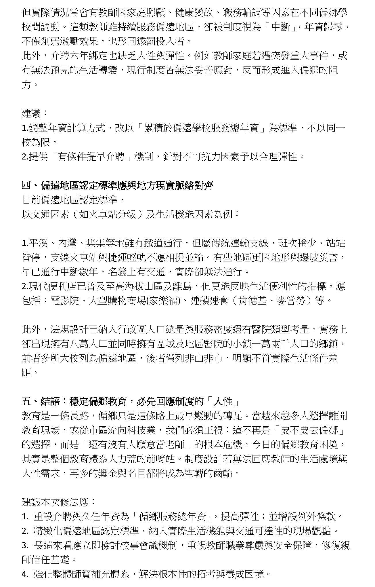 再來,我們看到偏鄉學校因為編制的問題,在一些特定的專長科目上,長期以來沒有辦法獨立聘用一個專任的編制,需要仰賴鐘點代課老師的授課,但是現在鐘點老師的時薪待遇對應起需要付出的交通成本跟時間成本,其實是完全不成比例的,所以這會導致學校在這些特定專長上長期以來面對招聘困難的現象。因此針對這樣子的特定專長代課老師,我們是不是能夠在鐘點費用或交通津貼上酌予相應的待遇保障或是提升,以提高這一些特定專長鐘點代課老師的任教誘因跟穩定性?這也是我們希望在制度上可以思考的。