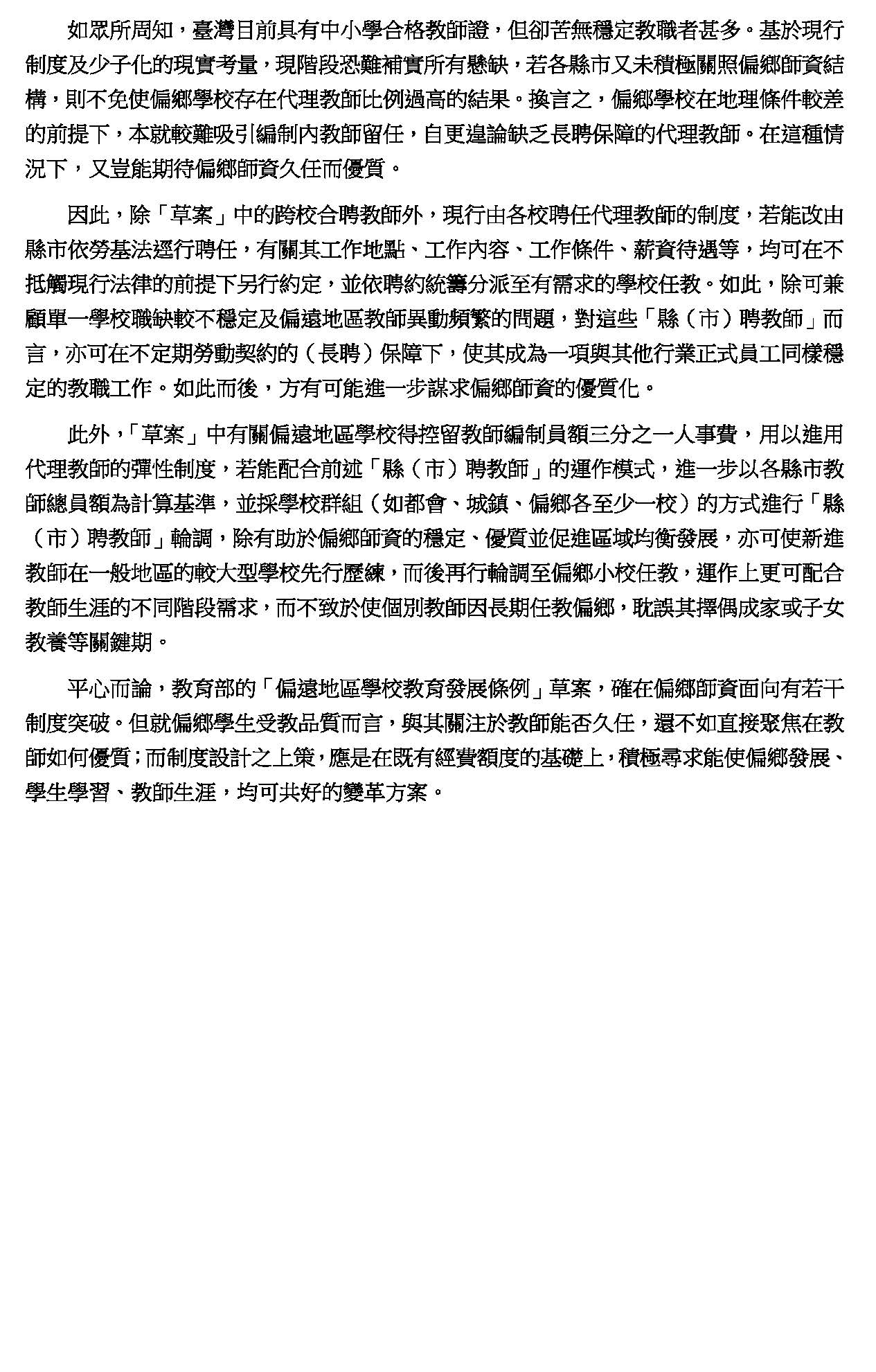 我今天的責任是來盡言責,可能也改變不了什麼事情。偏鄉的問題不是學校的問題,它是區域性的問題,應該用區域性的方法來解決,所以有學者一直主張日本的教師輪調制度應該引進臺灣,8年前就在講了,甚至更早,可是按照目前教師法的規定,這是不可能的,所以如果可以透過偏鄉教育條例的專法制定,讓專聘教師就等於另外一種正式教師,而建立某個縣市轄下的各種偏遠教師的聘任制度,建立縣聘教師的概念,也許可以解決。
