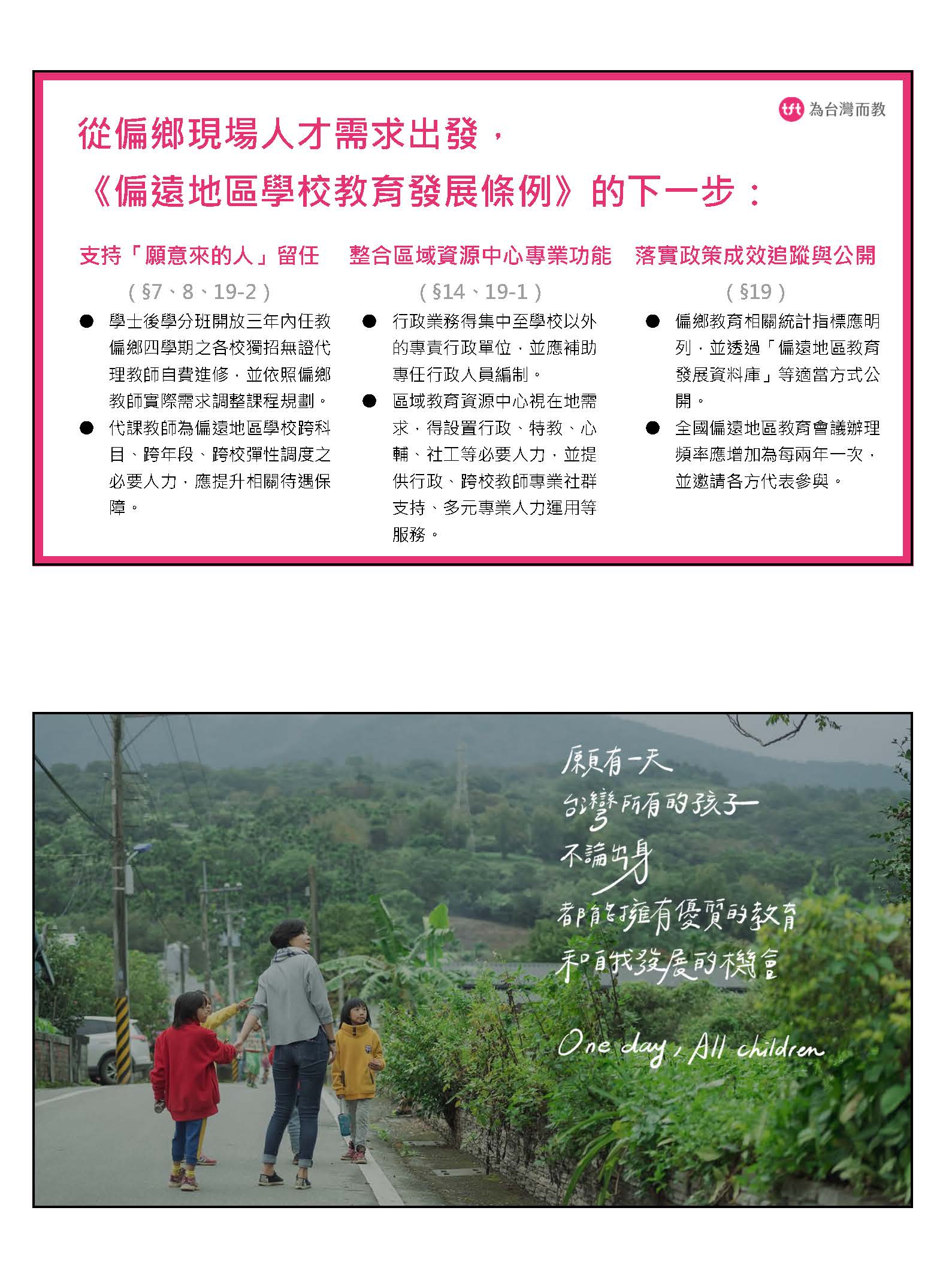 也因為這樣子對人才培育的關懷跟投入,我們透過師藝司跟國北教大的合作,也在探討偏鄉師培所需要的課程內容專業設計;另外,針對在地第一線的現場老師,我們也跟教育局處合作,不管是新進教師的研習或是精進教師的研習,提供這一些偏鄉第一線老師所需要的專業發展跟相應支持。因為有這一些長期以來陪伴偏鄉第一線老師的經驗,我們覺得在思考偏遠教育條例下一步的時候有三個重點題目值得探討。