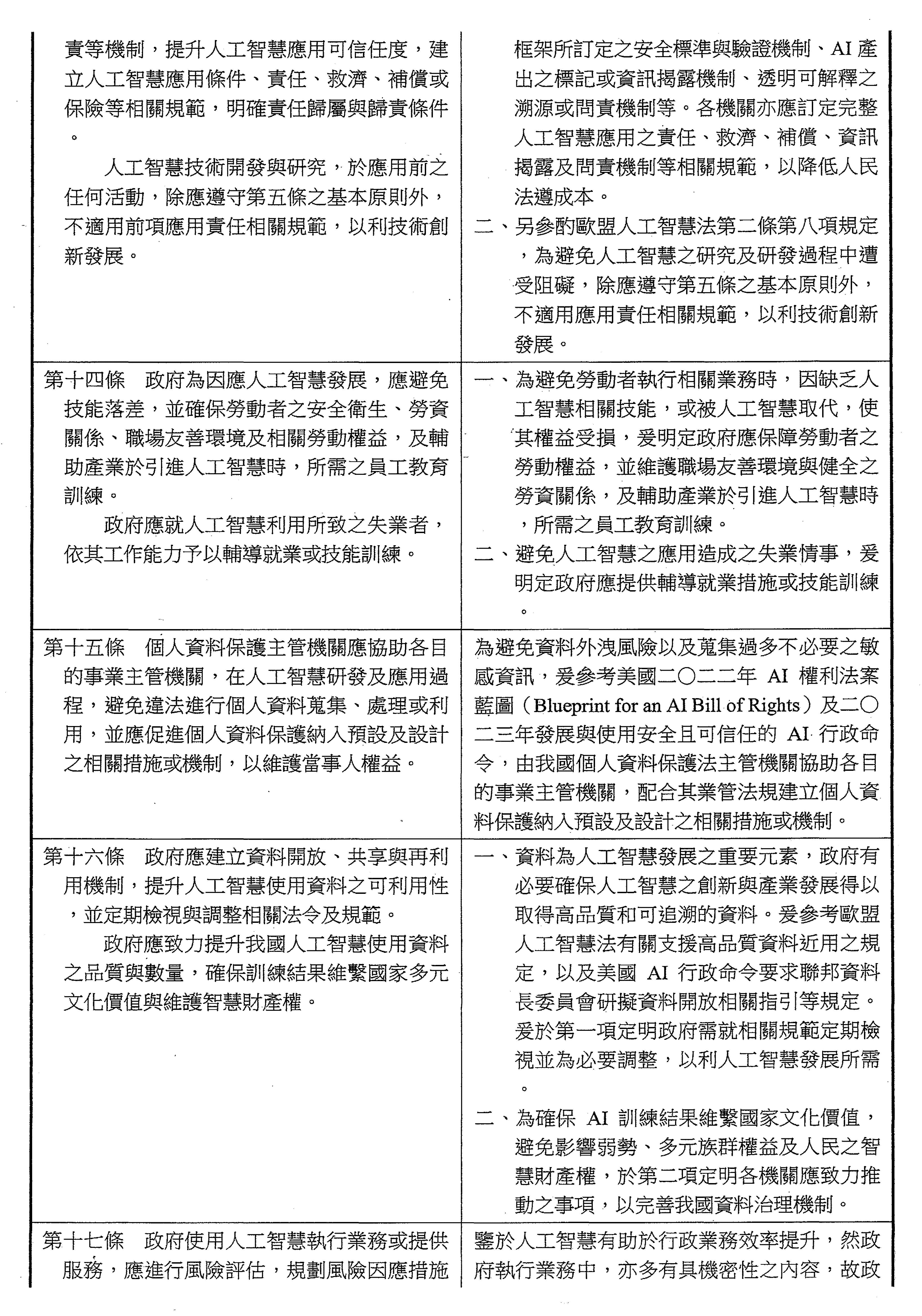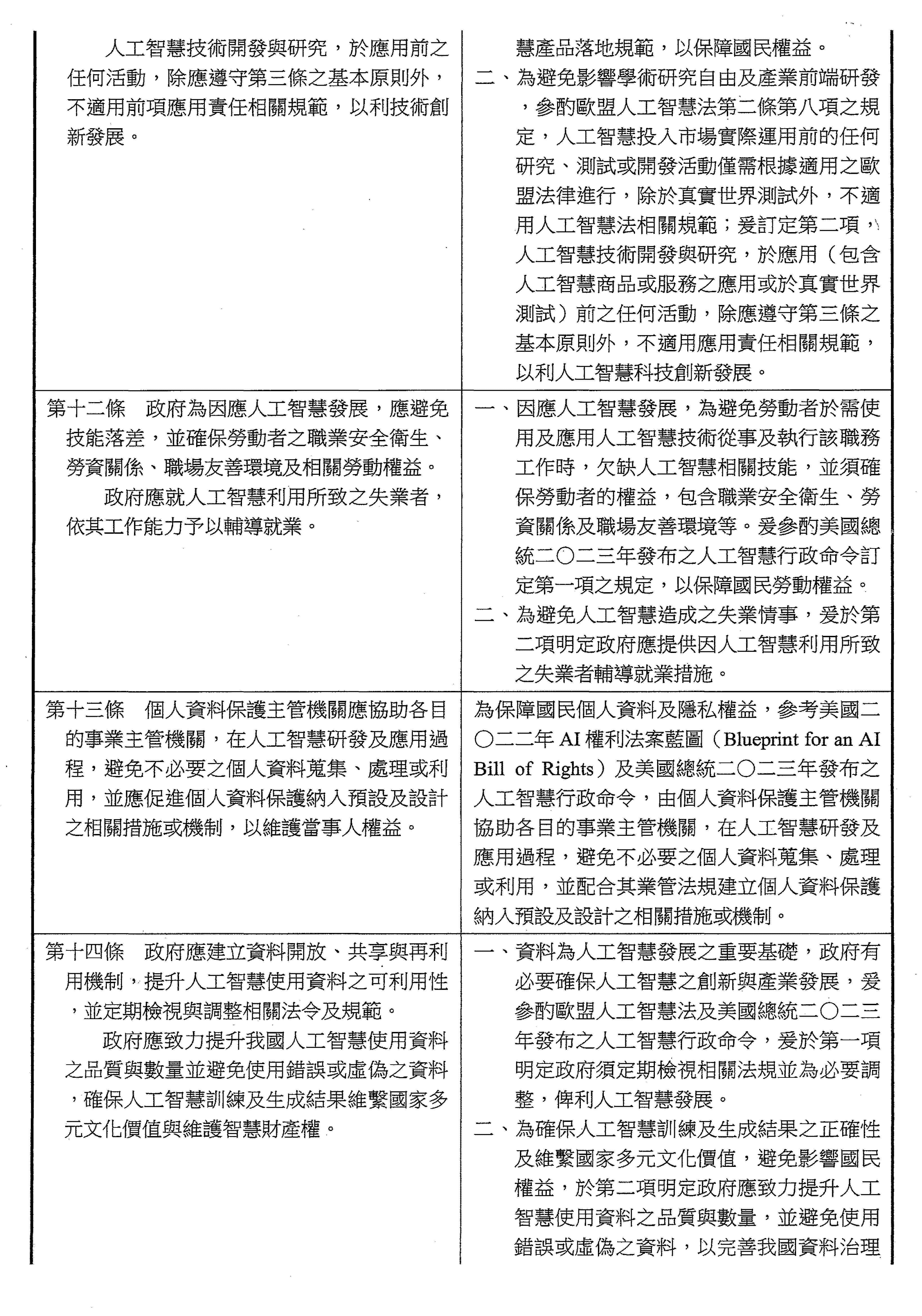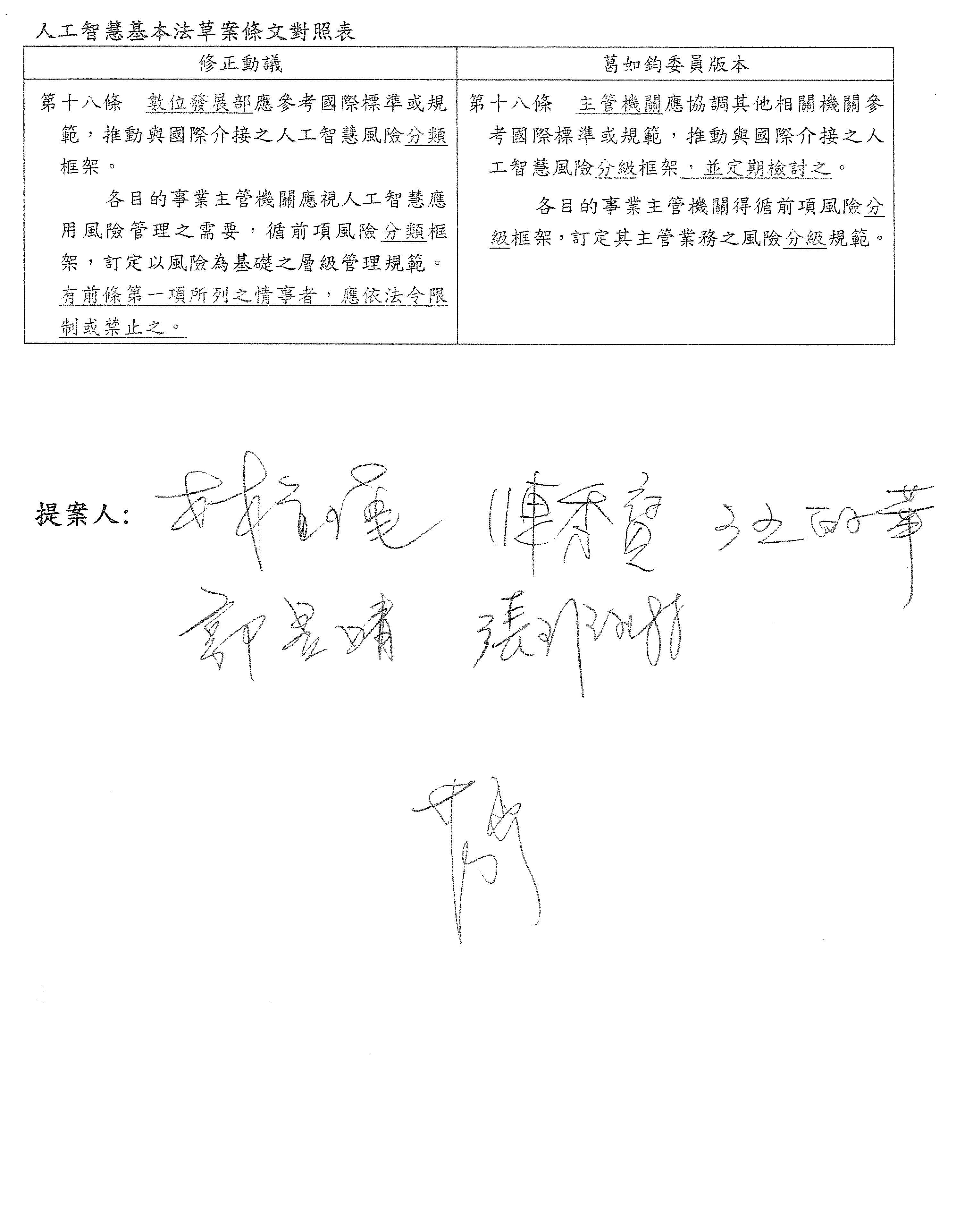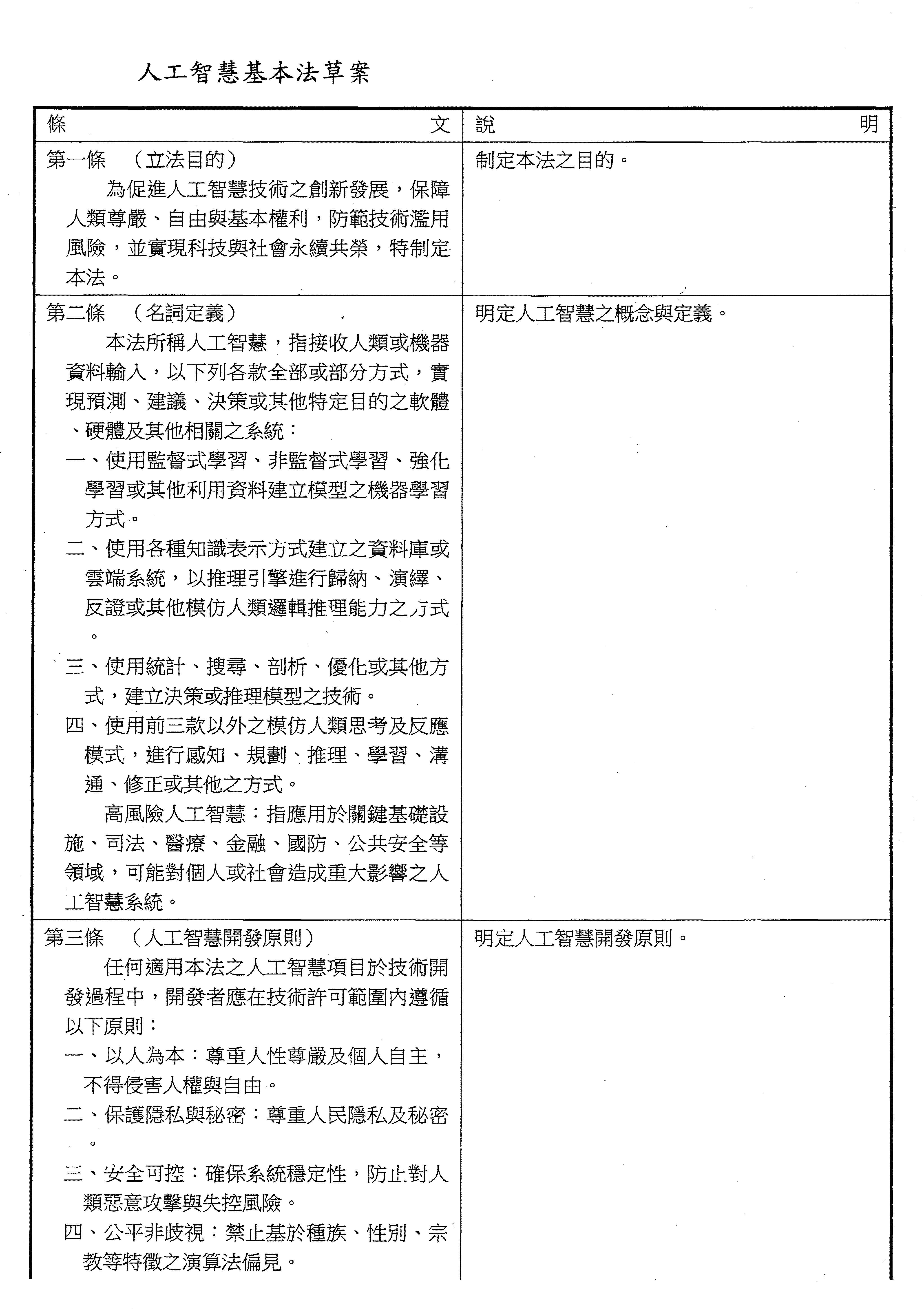 一、繼續審查(一)委員葛如鈞等37人擬具「人工智慧基本法草案」案。(二)委員邱若華等17人擬具「人工智慧基本法草案」案。(三)委員羅廷瑋等17人擬具「人工智慧基本法草案」案。(四)委員萬美玲等18人擬具「人工智慧基本法草案」案。(五)委員許宇甄等20人擬具「人工智慧基本法草案」案。(六)委員張嘉郡等21人擬具「人工智慧基本法草案」案。(七)委員林倩綺等23人擬具「人工智慧基本法草案」案。(八)委員邱議瑩等20人擬具「人工智慧基本法草案」案。(九)委員吳宗憲等17人擬具「人工智慧基本法草案」案。(十)委員賴士葆等28人擬具「人工智慧基本法草案」案。(十一)委員楊瓊瓔等26人擬具「人工智慧基本法草案」案。(十二)台灣民眾黨黨團擬具「人工智慧發展及管理條例草案」案。(十三)委員許智傑等27人擬具「人工智慧基本法草案」案。(十四)委員林宜瑾等26人擬具「人工智慧基本法草案」案。