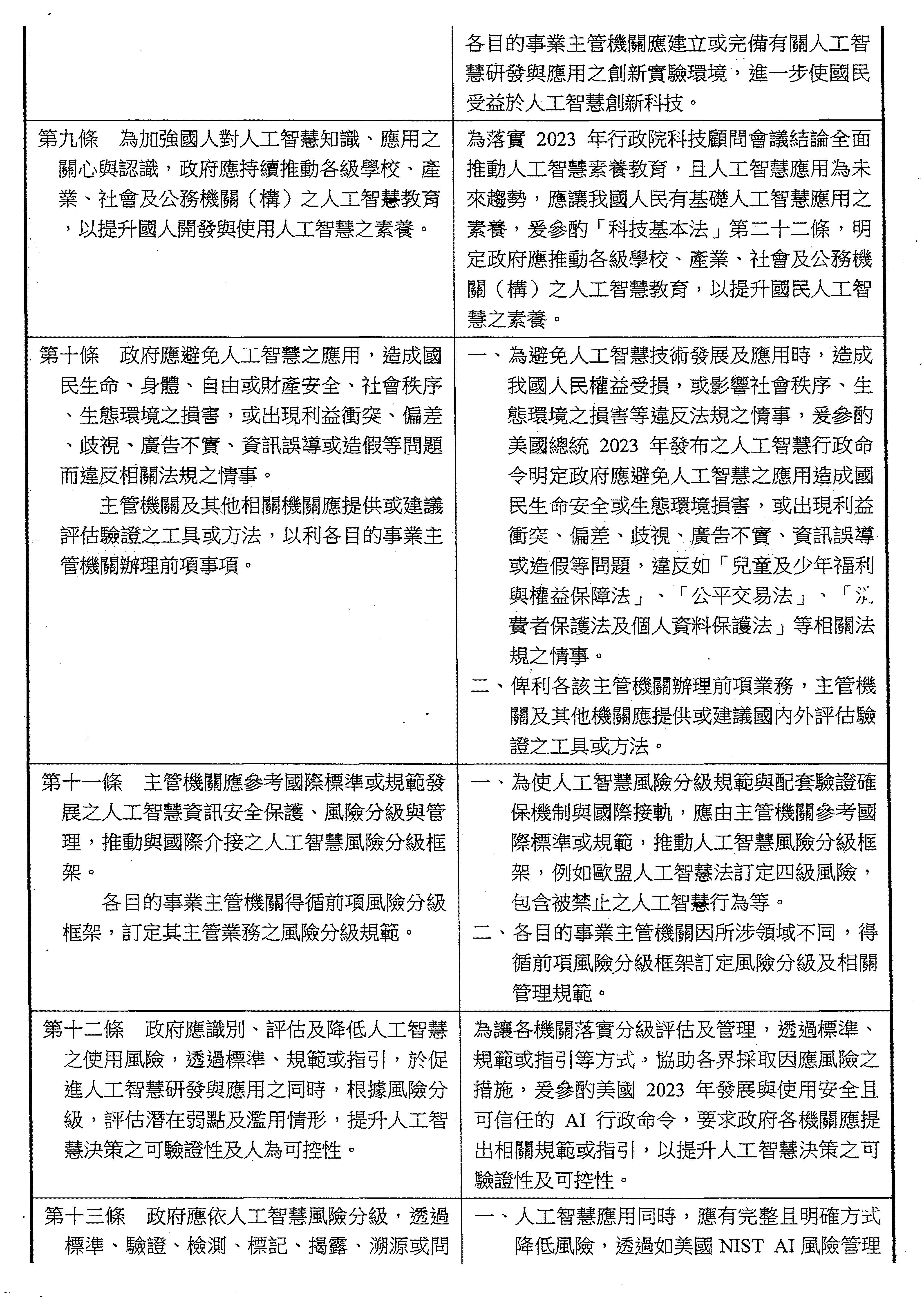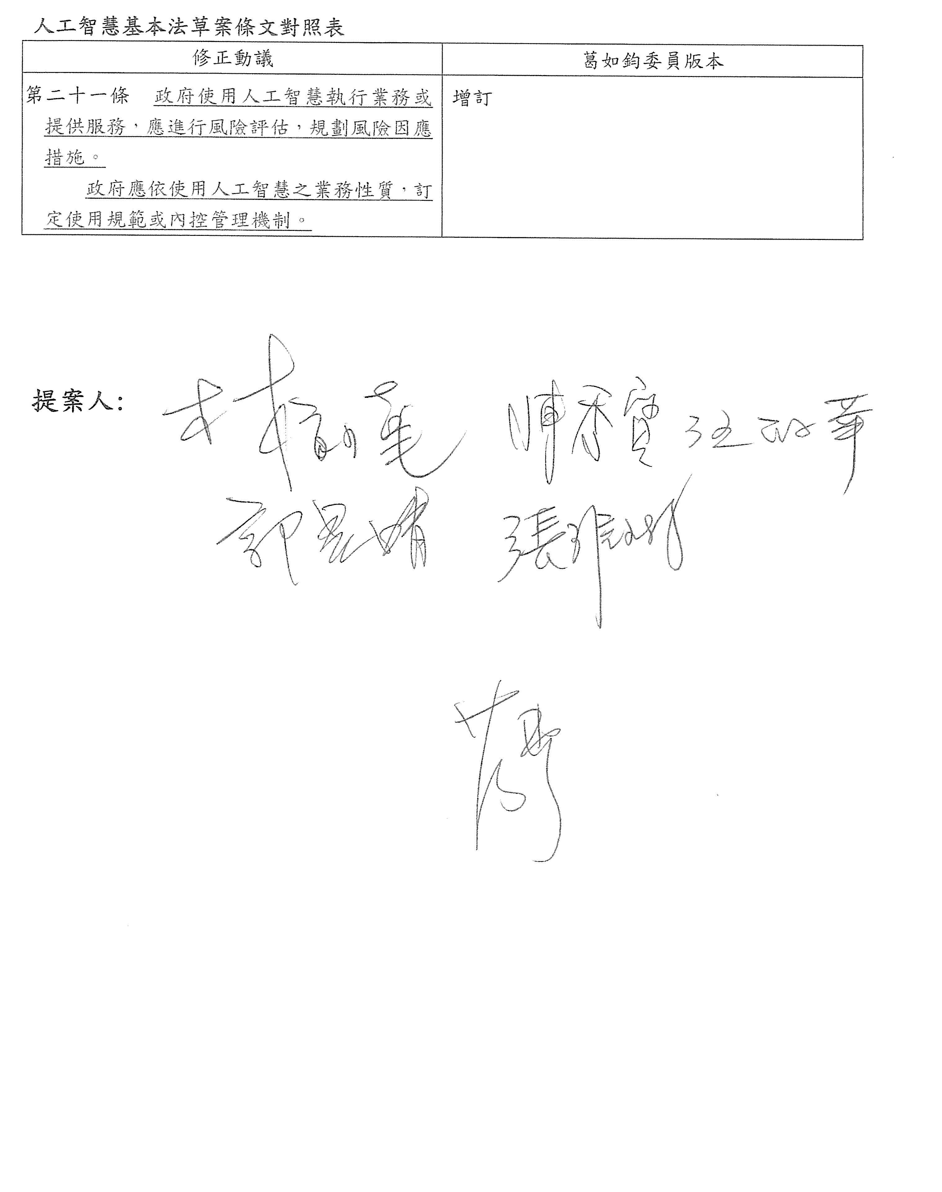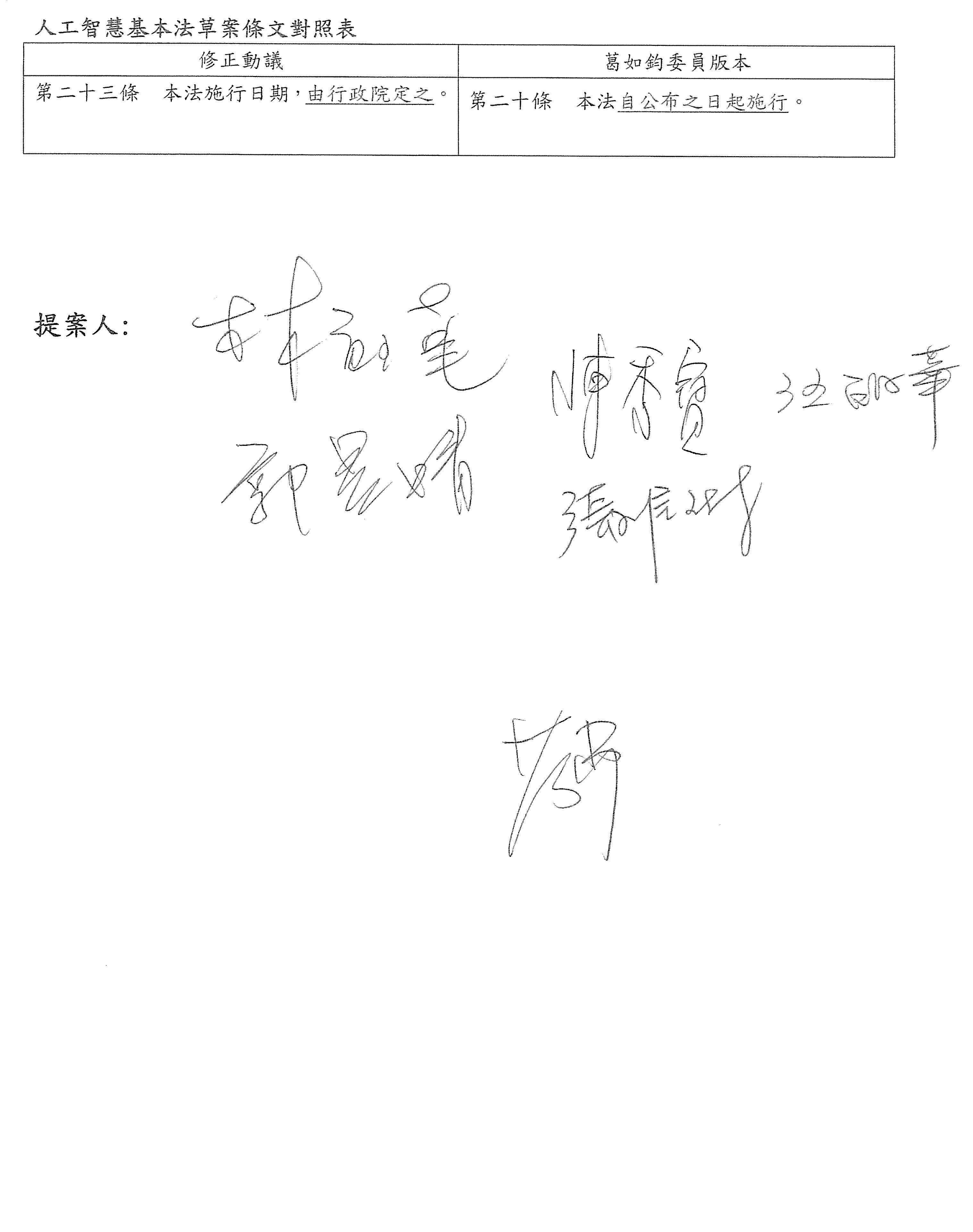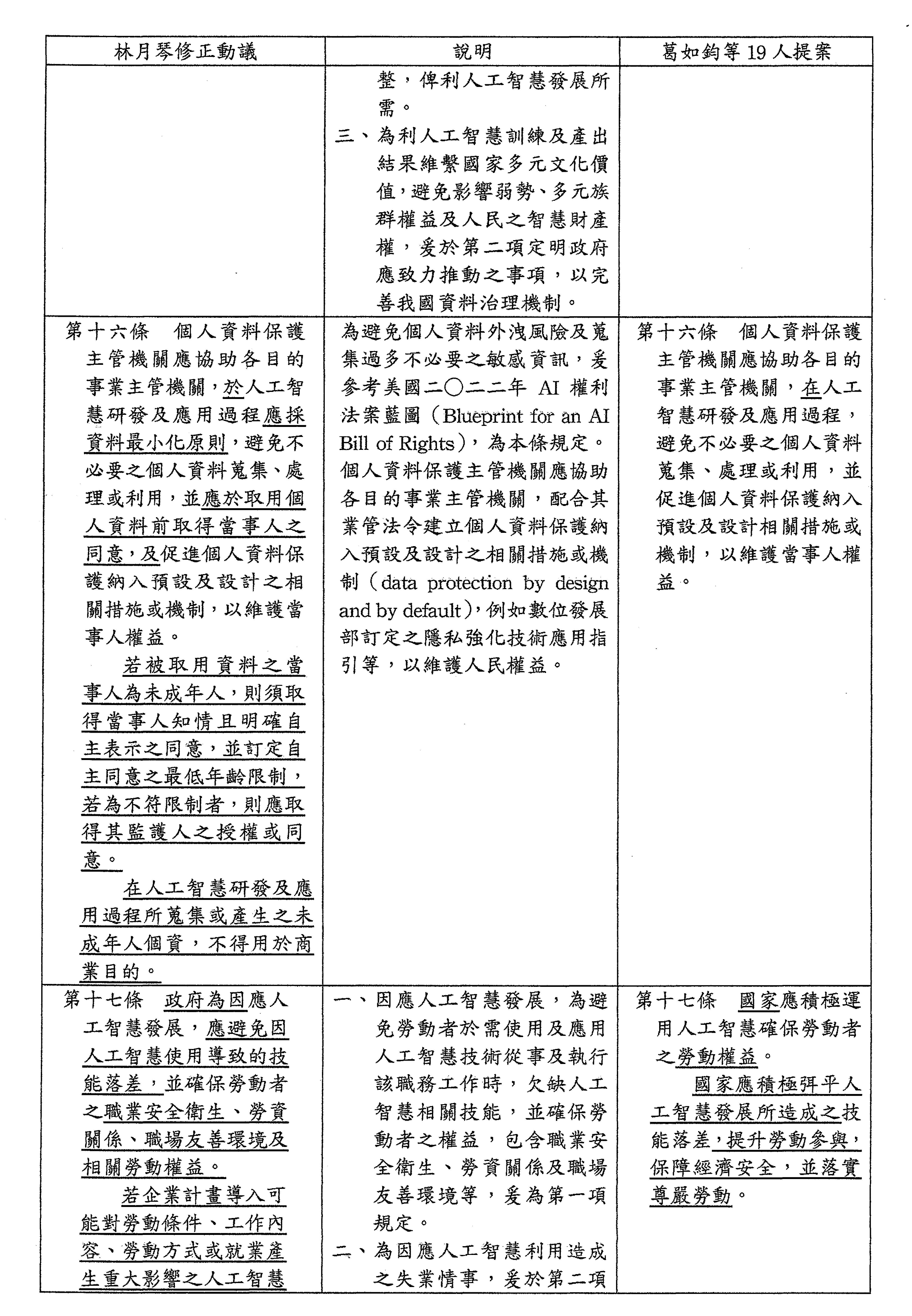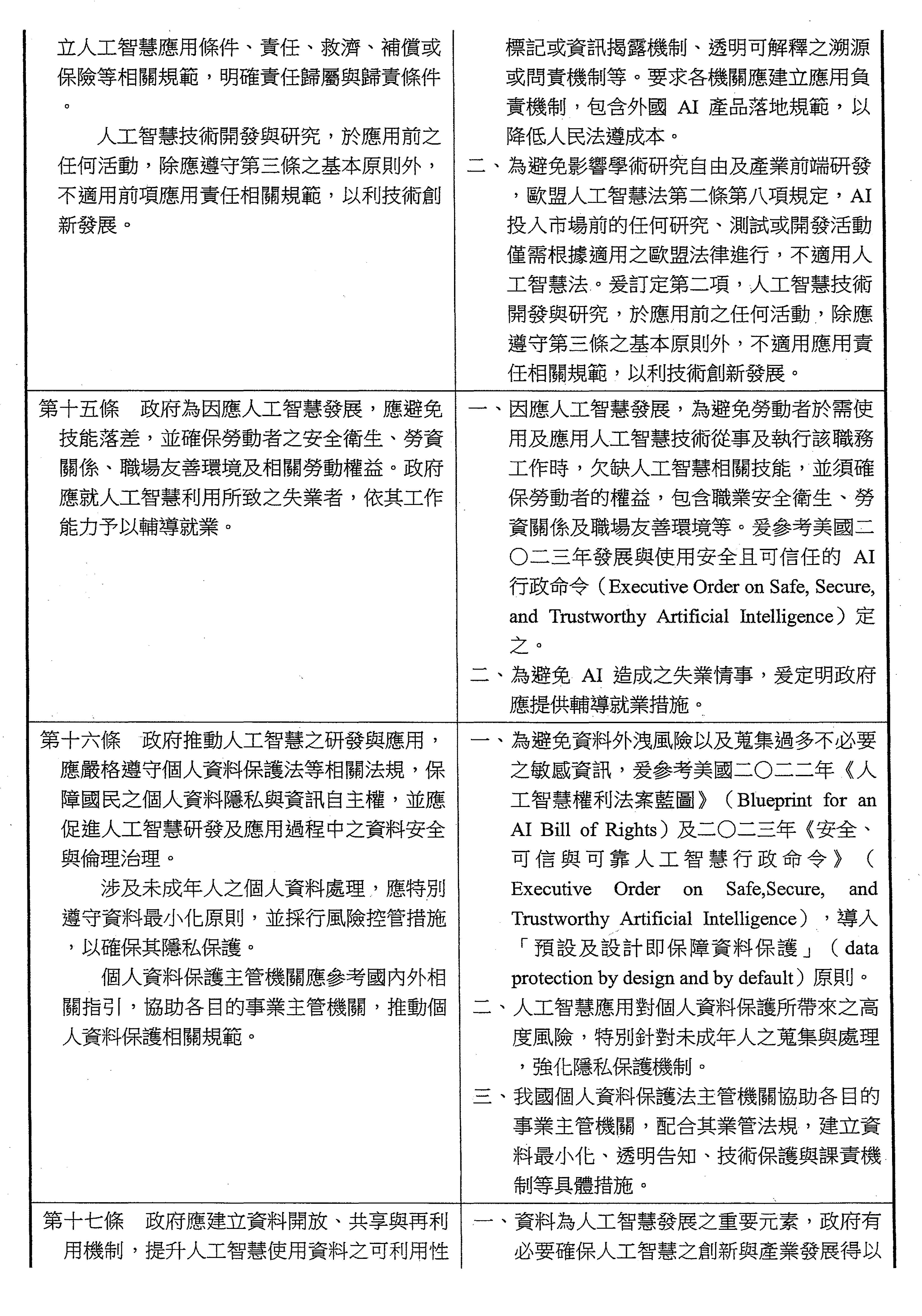 一、繼續審查(一)委員葛如鈞等37人擬具「人工智慧基本法草案」案。(二)委員邱若華等17人擬具「人工智慧基本法草案」案。(三)委員羅廷瑋等17人擬具「人工智慧基本法草案」案。(四)委員萬美玲等18人擬具「人工智慧基本法草案」案。(五)委員許宇甄等20人擬具「人工智慧基本法草案」案。(六)委員張嘉郡等21人擬具「人工智慧基本法草案」案。(七)委員林倩綺等23人擬具「人工智慧基本法草案」案。(八)委員邱議瑩等20人擬具「人工智慧基本法草案」案。(九)委員吳宗憲等17人擬具「人工智慧基本法草案」案。(十)委員賴士葆等28人擬具「人工智慧基本法草案」案。(十一)委員楊瓊瓔等26人擬具「人工智慧基本法草案」案。(十二)台灣民眾黨黨團擬具「人工智慧發展及管理條例草案」案。(十三)委員許智傑等27人擬具「人工智慧基本法草案」案。(十四)委員林宜瑾等26人擬具「人工智慧基本法草案」案。