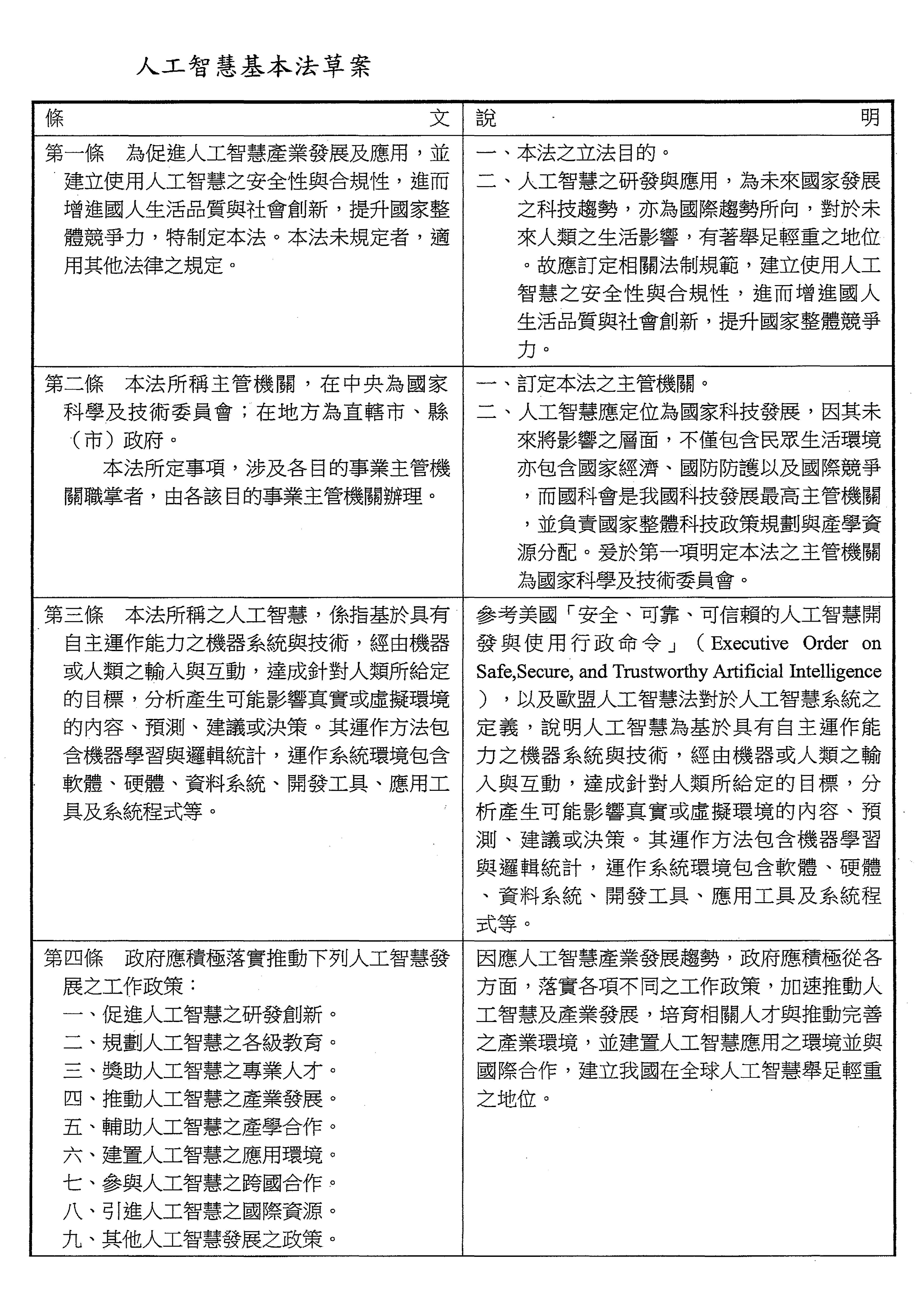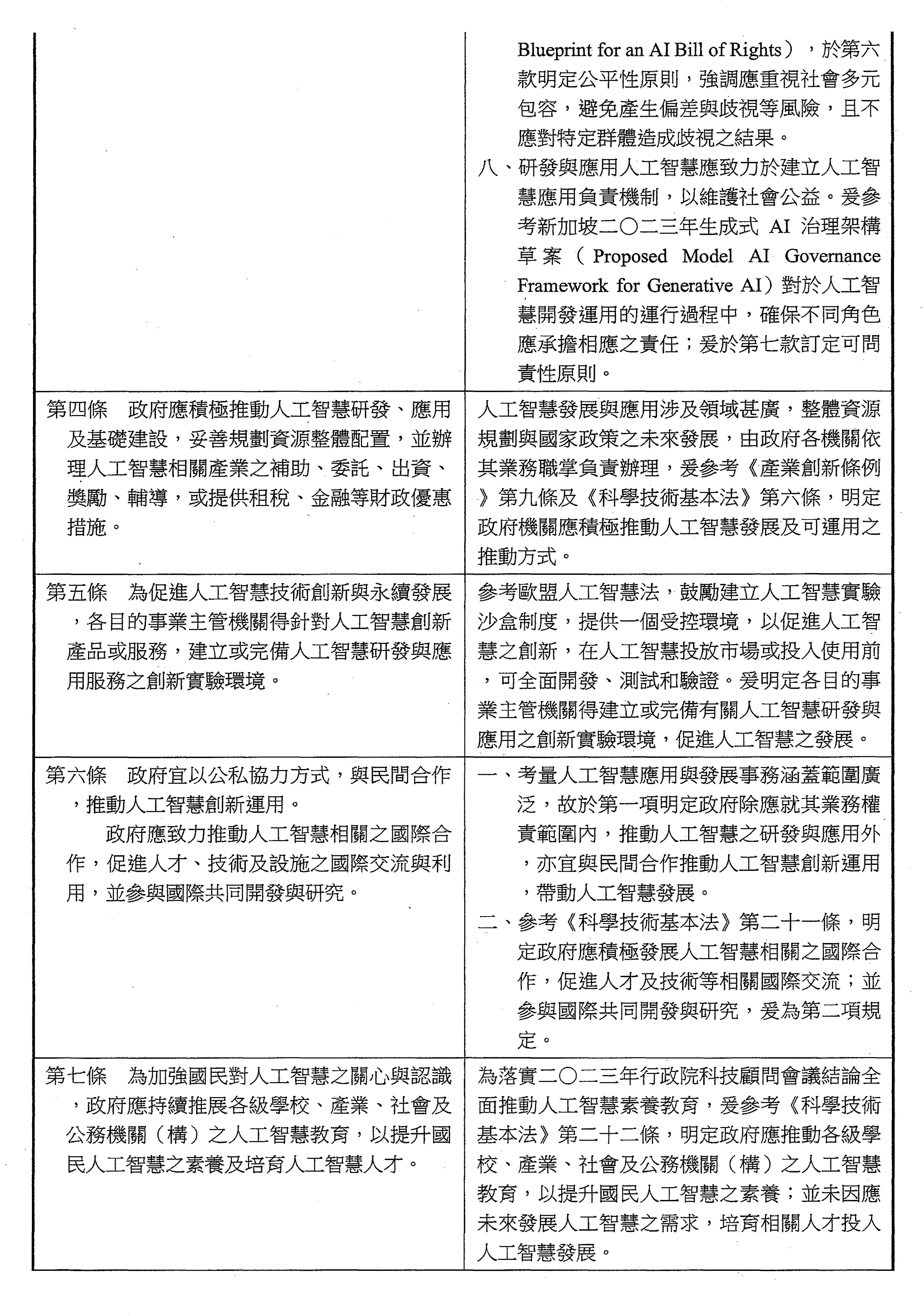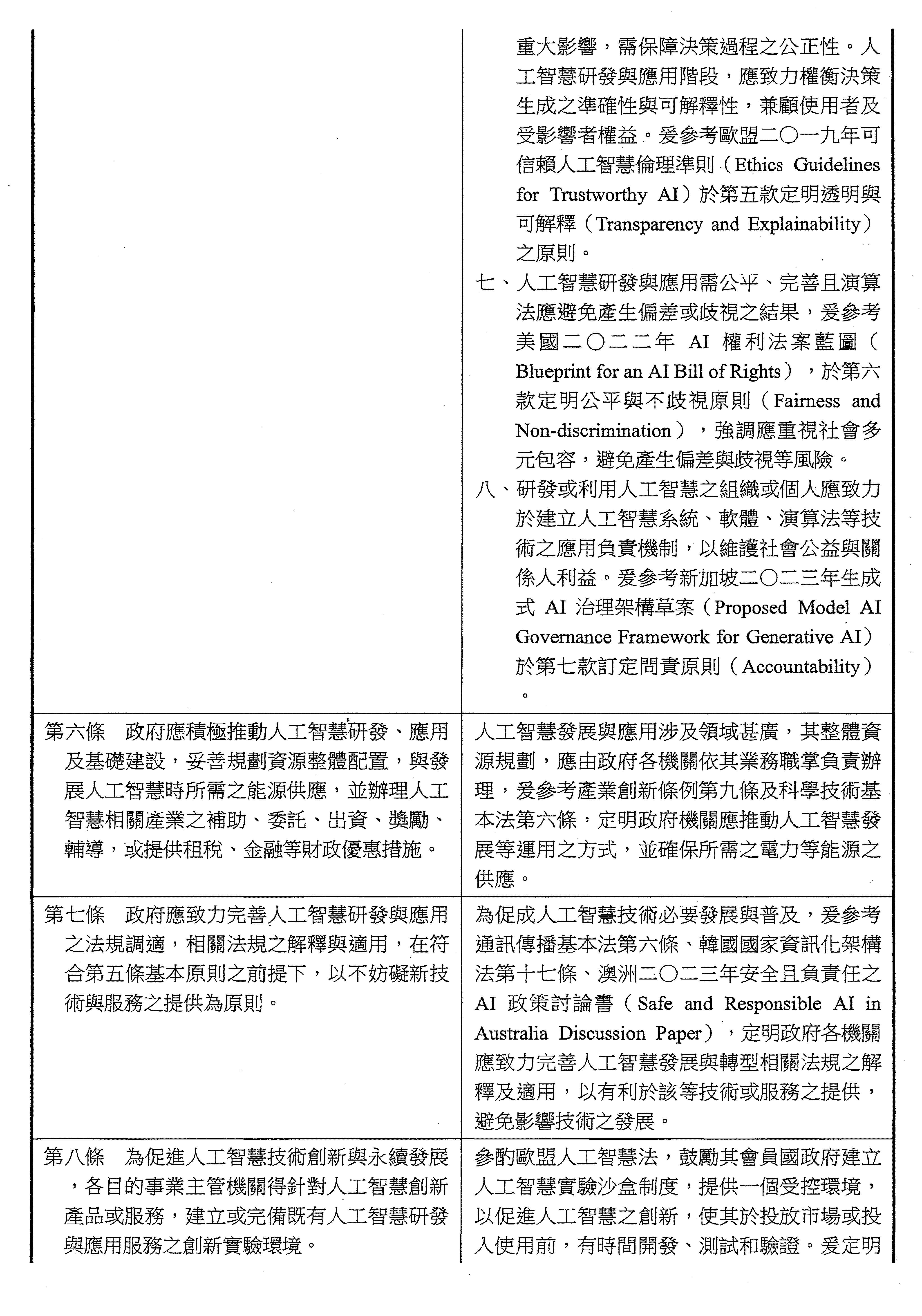 二、審查(一)委員邱議瑩等20人擬具「人工智慧基本法草案」案。(二)委員吳宗憲等17人擬具「人工智慧基本法草案」案。(三)委員賴士葆等28人擬具「人工智慧基本法草案」案。(四)委員楊瓊瓔等26人擬具「人工智慧基本法草案」案。(五)台灣民眾黨黨團擬具「人工智慧發展及管理條例草案」案。(六)委員許智傑等27人擬具「人工智慧基本法草案」案。(七)委員林宜瑾等26人擬具「人工智慧基本法草案」案。