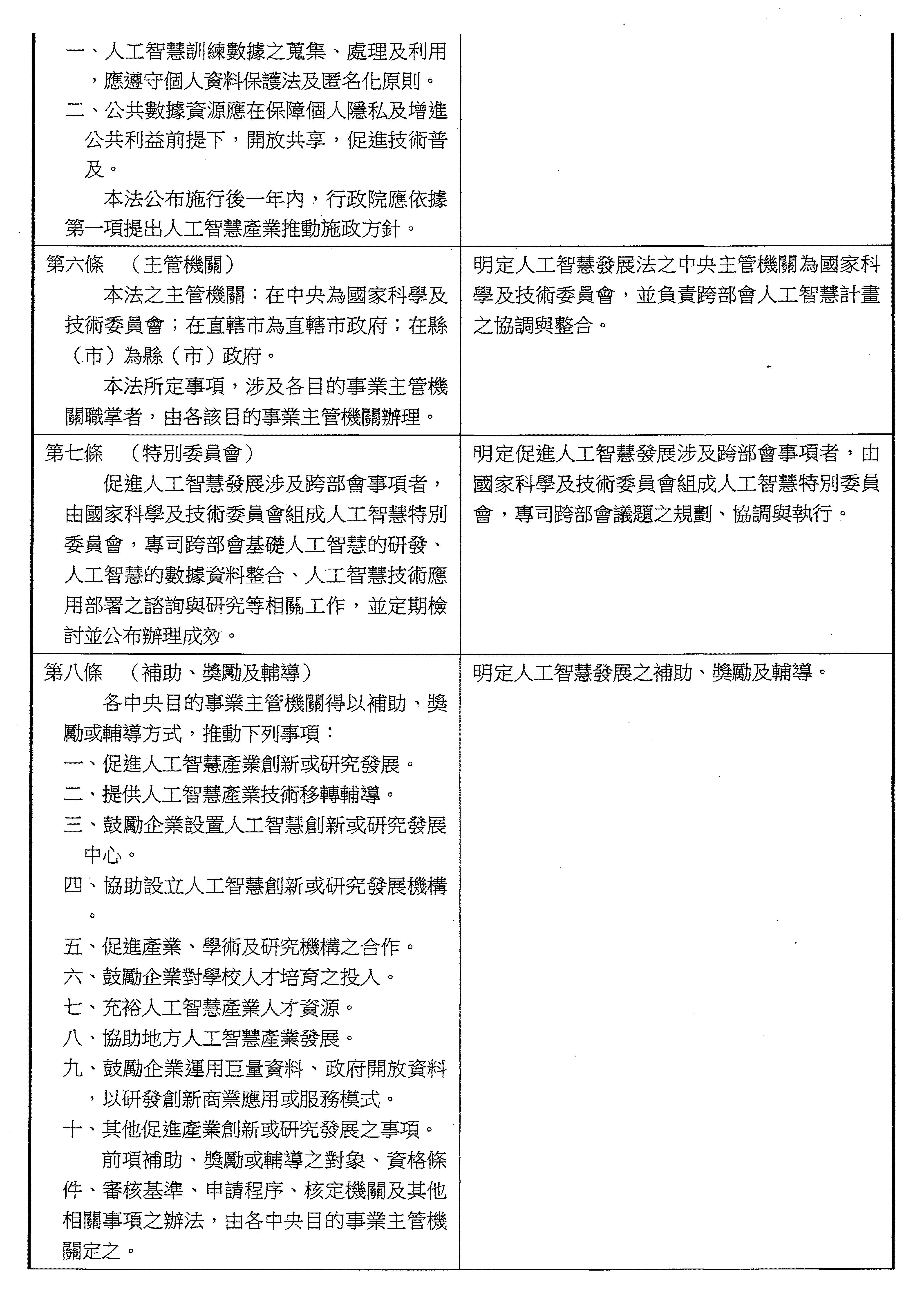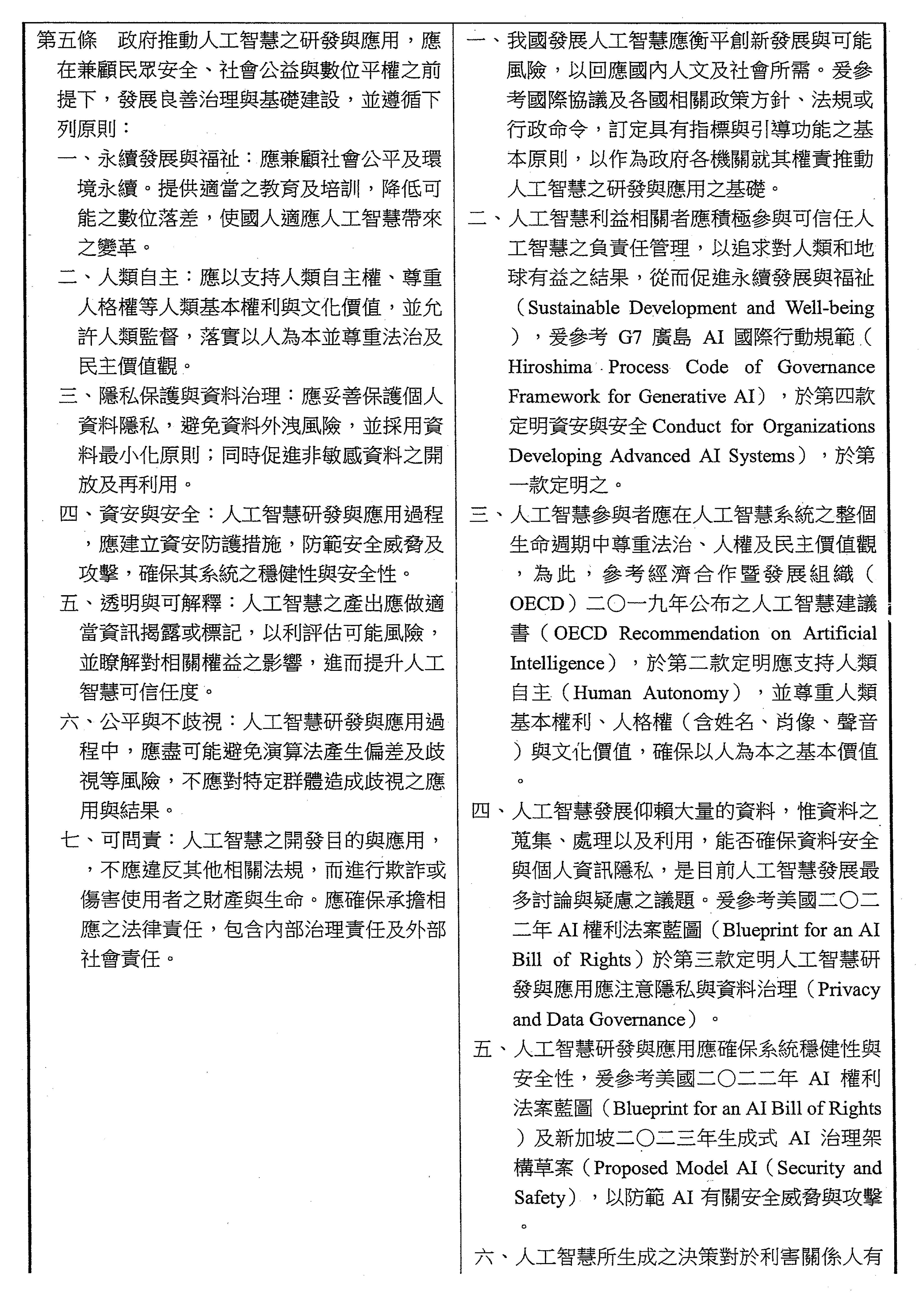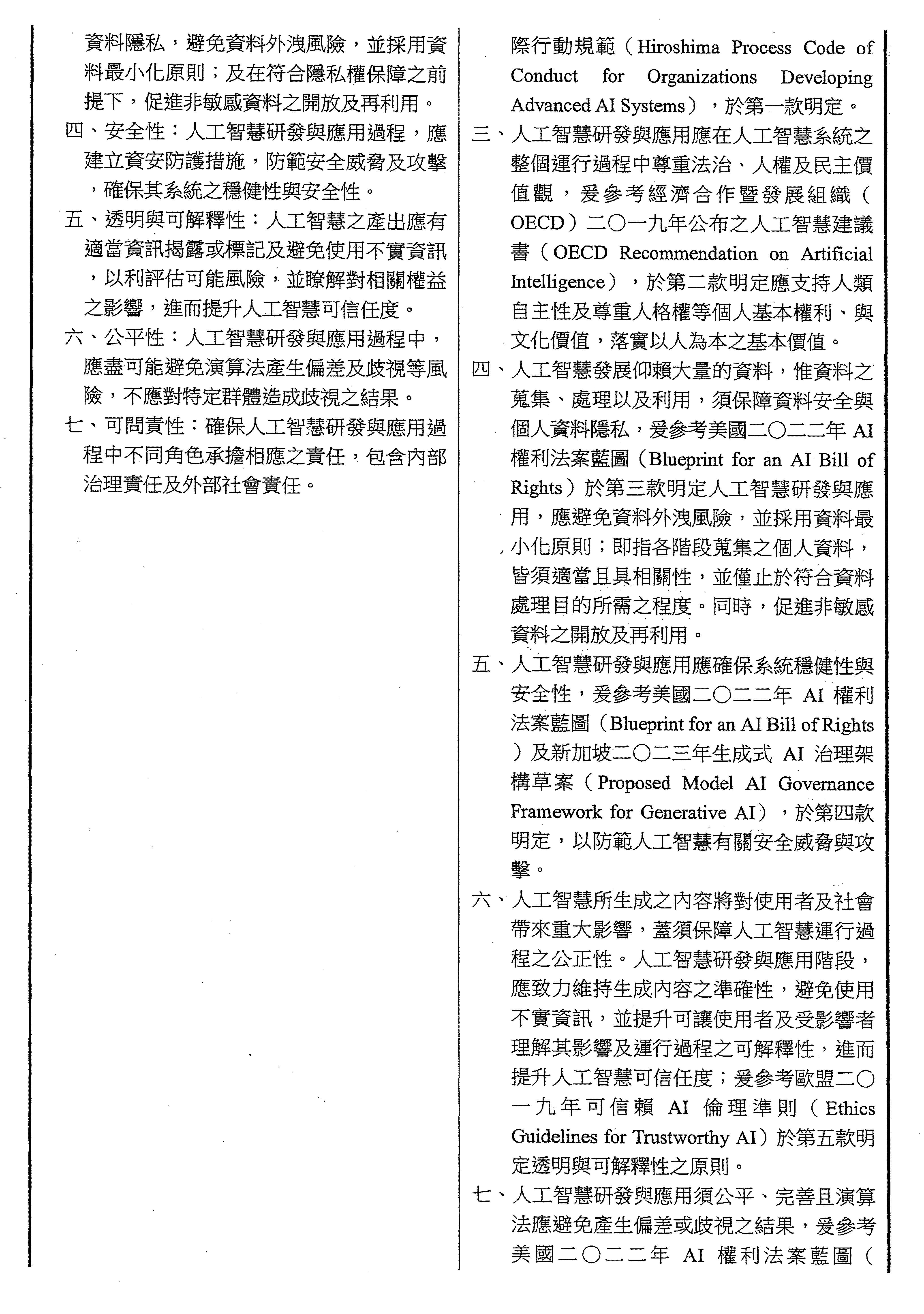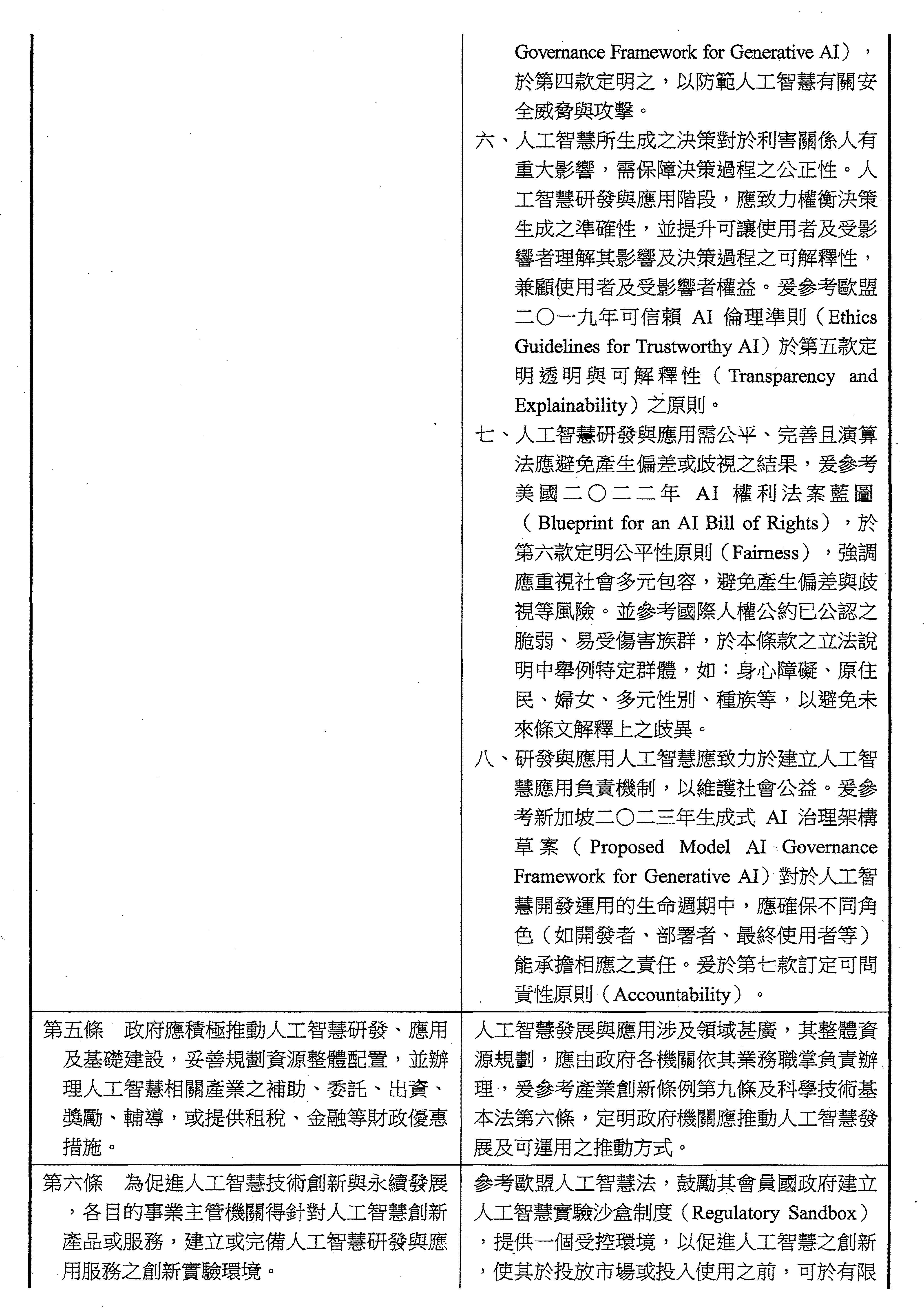 二、審查(一)委員邱議瑩等20人擬具「人工智慧基本法草案」案。(二)委員吳宗憲等17人擬具「人工智慧基本法草案」案。(三)委員賴士葆等28人擬具「人工智慧基本法草案」案。(四)委員楊瓊瓔等26人擬具「人工智慧基本法草案」案。(五)台灣民眾黨黨團擬具「人工智慧發展及管理條例草案」案。(六)委員許智傑等27人擬具「人工智慧基本法草案」案。(七)委員林宜瑾等26人擬具「人工智慧基本法草案」案。